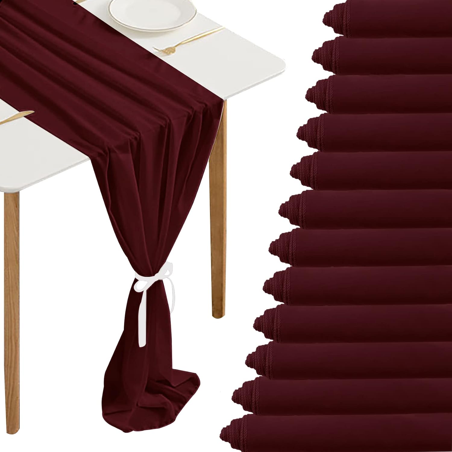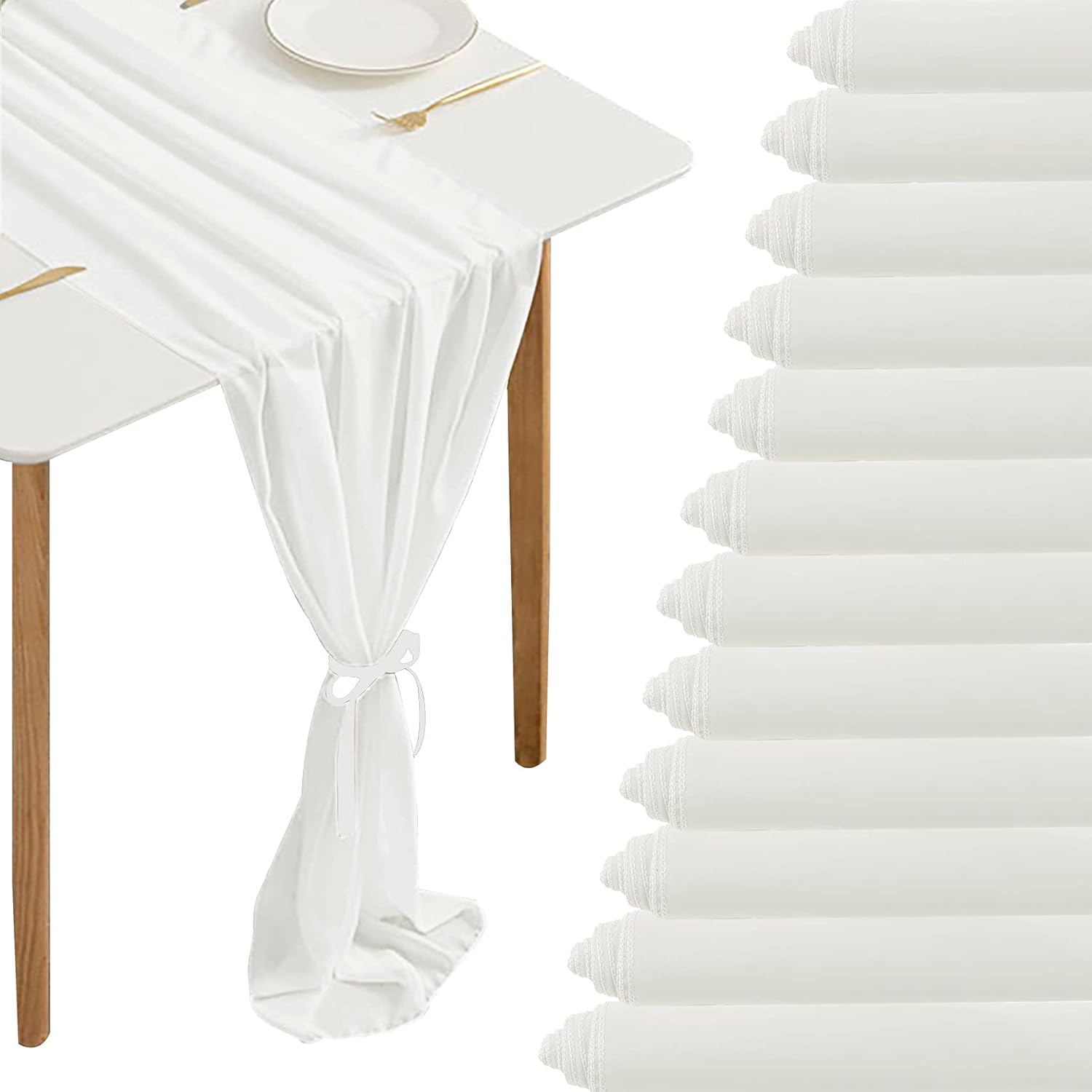- Enhance your event décor with this set of 12 chiffon table runners, each measuring 10 feet long and 27 inches wide, perfect for weddings, banquets, and parties. Crafted from high-quality polyester, these runners offer a soft, wrinkle-free texture with delicate edges and precise stitching. The innovative thermal cutting technique ensures a seamless, elegant finish that drapes naturally over both rectangular and round tables. Lightweight and skin-friendly, these runners can be used individually or combined to cover longer tables, adding a graceful, boho-chic touch to any celebration. Elevate your table settings effortlessly with this versatile and durable linen.