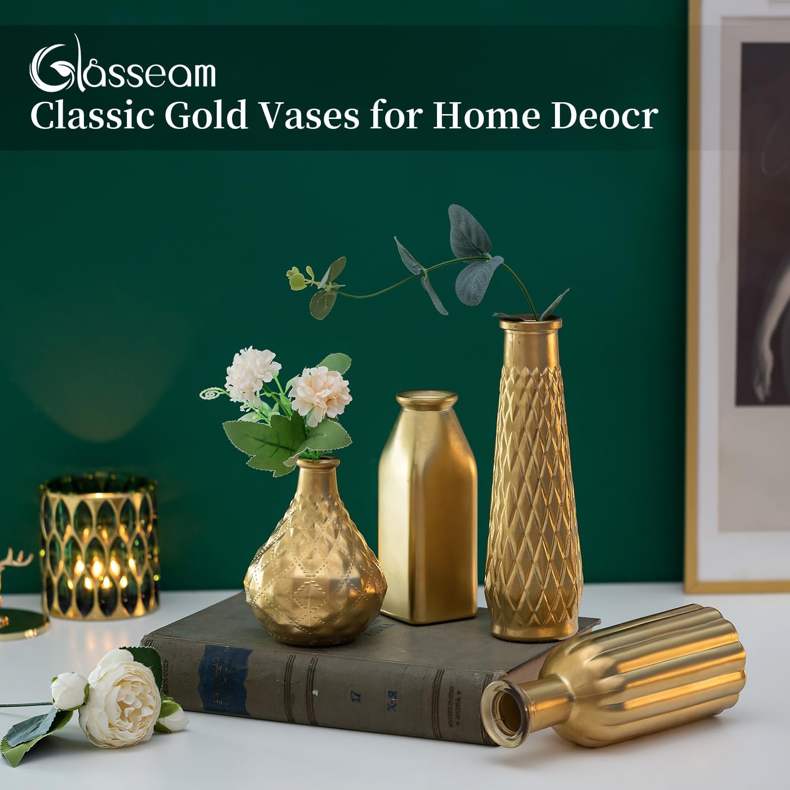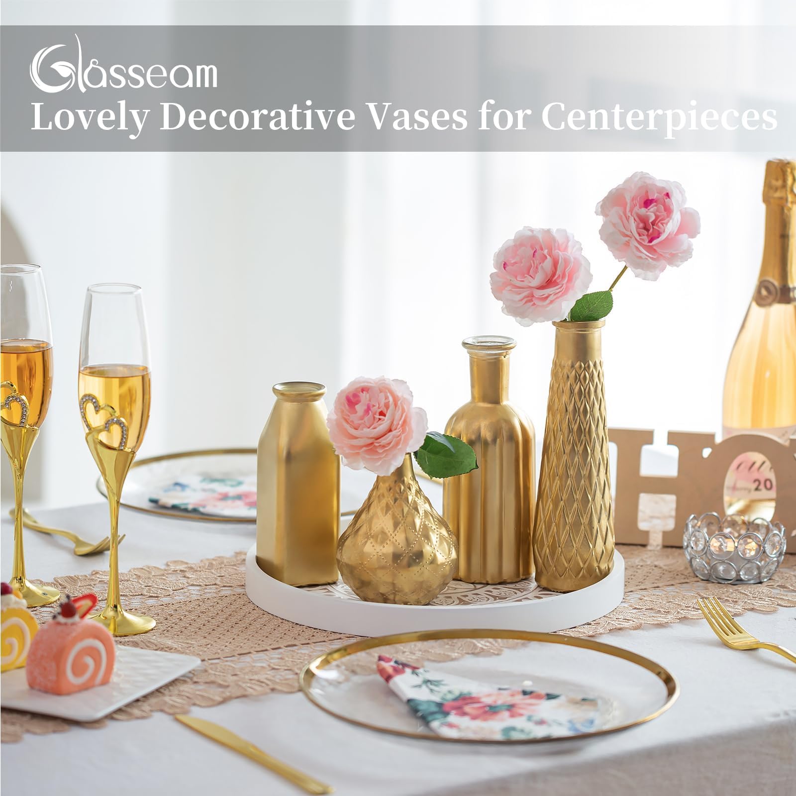 - Elevate your home decor with the Glasseam Gold Vase collection, featuring small glass vases perfect for living rooms, kitchens, or table centerpieces. Each vase showcases unique etching patterns and shapes, creating an eclectic yet harmonious look. The warm copper gold finish brings a sophisticated vintage charm that complements any interior style. These vases stand out individually while collectively adding a subtle touch of luxury to your space without overwhelming it. Ideal for displaying fresh flowers or as standalone decorative pieces, they effortlessly enhance your home's aesthetic with modern elegance.