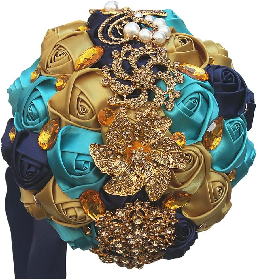 - This elegant bridal bouquet measures approximately 9.4" in diameter and features soft, silky satin fabric roses accented with sparkling crystal rhinestones, alloys, and artificial gems and pearls. Each flower is beautifully adorned with vintage-style gold jeweled brooches and decorative baubles. The handle is wrapped in satin ribbon and embellished with artificial diamonds, jewel chains, tassels, and shimmering beads, all securely attached to create a stunning and durable keepsake for your special day.