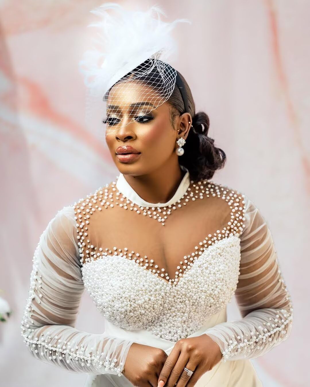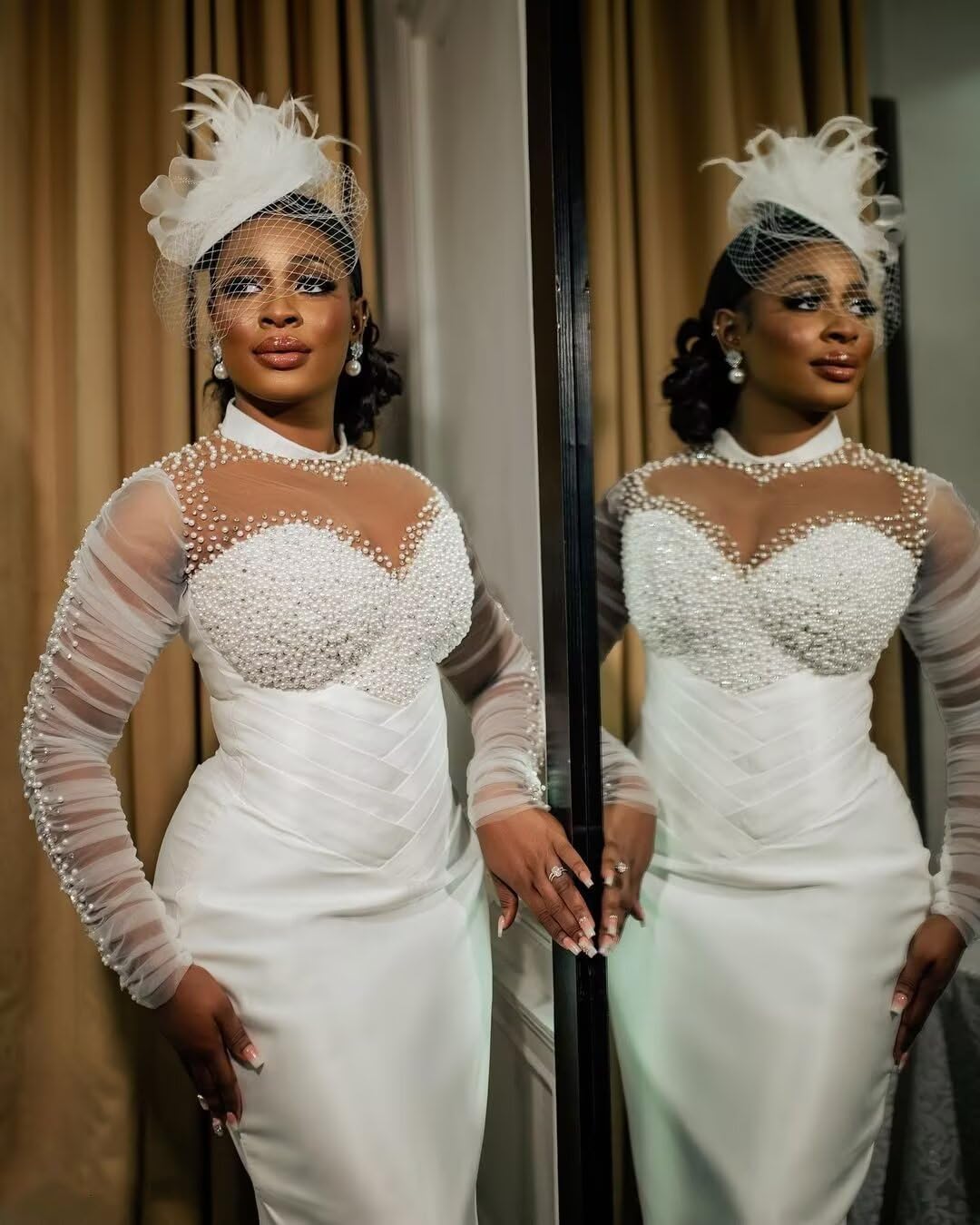 This tea-length satin reception gown offers a graceful straight silhouette that flatters every figure. Its elegant stand collar and long sleeves create a refined look, while the exquisite lace-up back ensures a perfect fit. The built-in bra provides comfortable support throughout your special day. Adorned with shimmering crystals and lustrous pearls, the dress catches the light beautifully with every movement. The tulle on the neckline and sleeves can be customized to match your skin tone, enhancing your natural beauty. Made from luxurious thick satin, this gown combines comfort and sophistication for an unforgettable reception look.