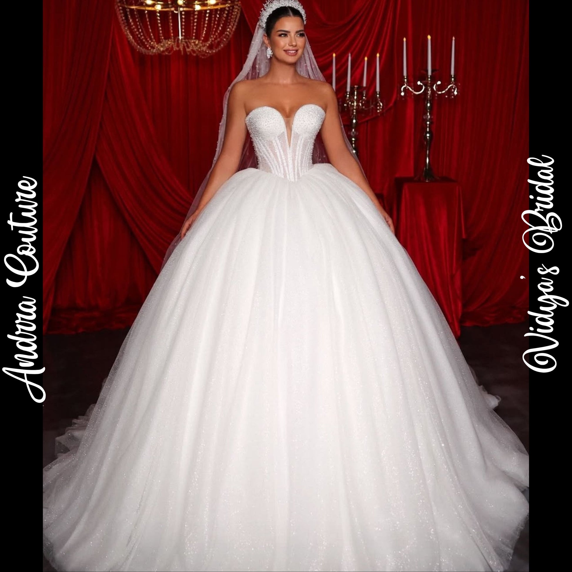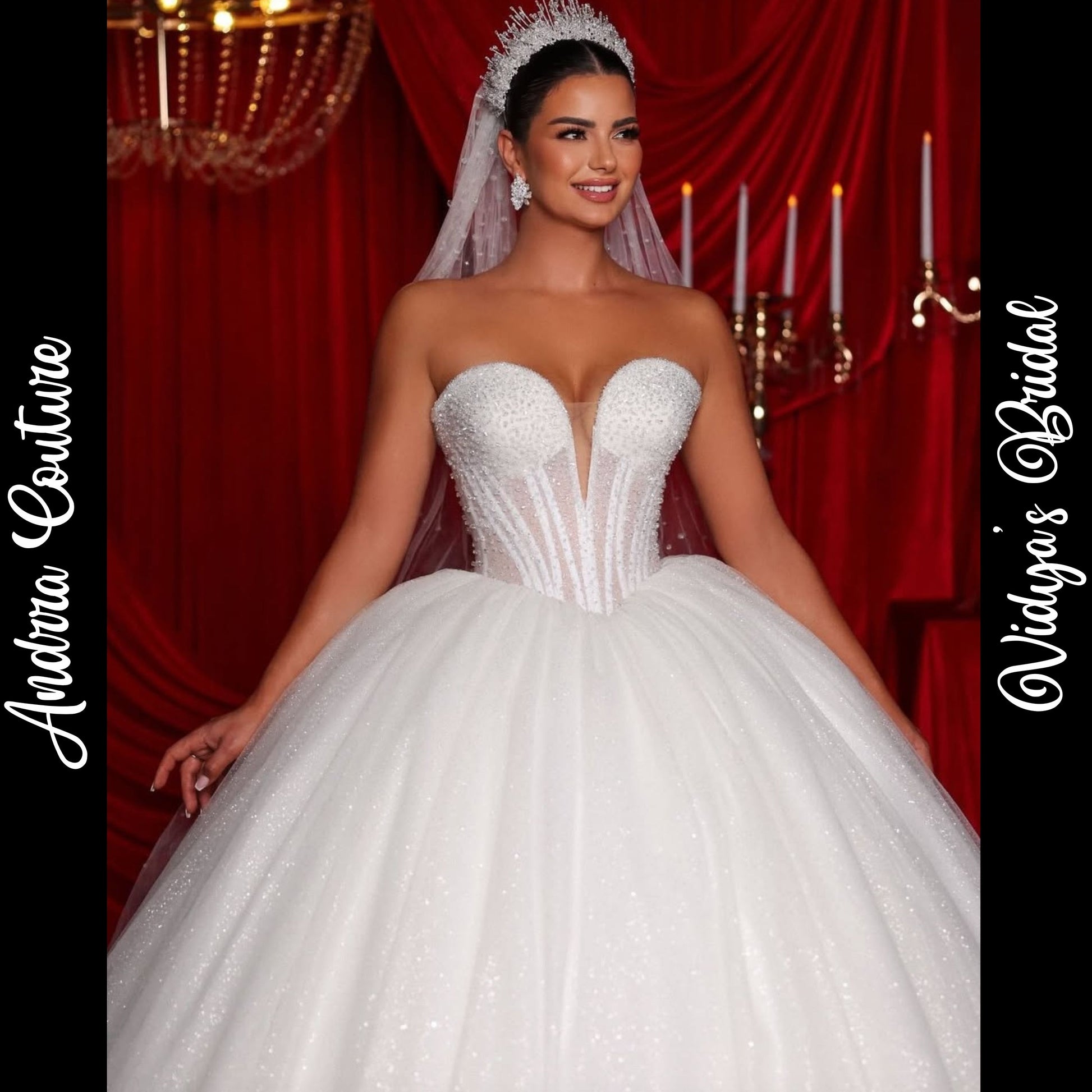 This stunning wedding gown is a masterpiece of elegance and sophistication. The strapless, sweetheart neckline bodice is intricately beaded with sparkling white beads, creating a dazzling effect that catches the light. The fitted, corset-style top accentuates the bride's curves, while the full, flowing skirt falls in soft folds to the floor, creating a dramatic and romantic silhouette.