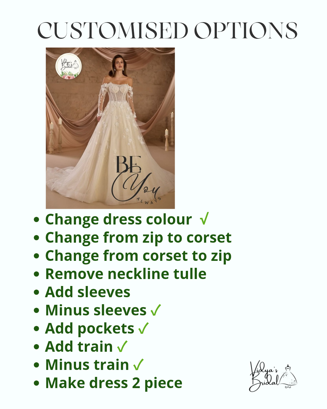 A flowing A-line skirt, adorned with scattered floral appliqués, glides into a regal train, making every step down the aisle a moment to remember. Crafted in a soft champagne-ivory hue, this dress offers a warm, vintage elegance while still feeling fashion-forward.