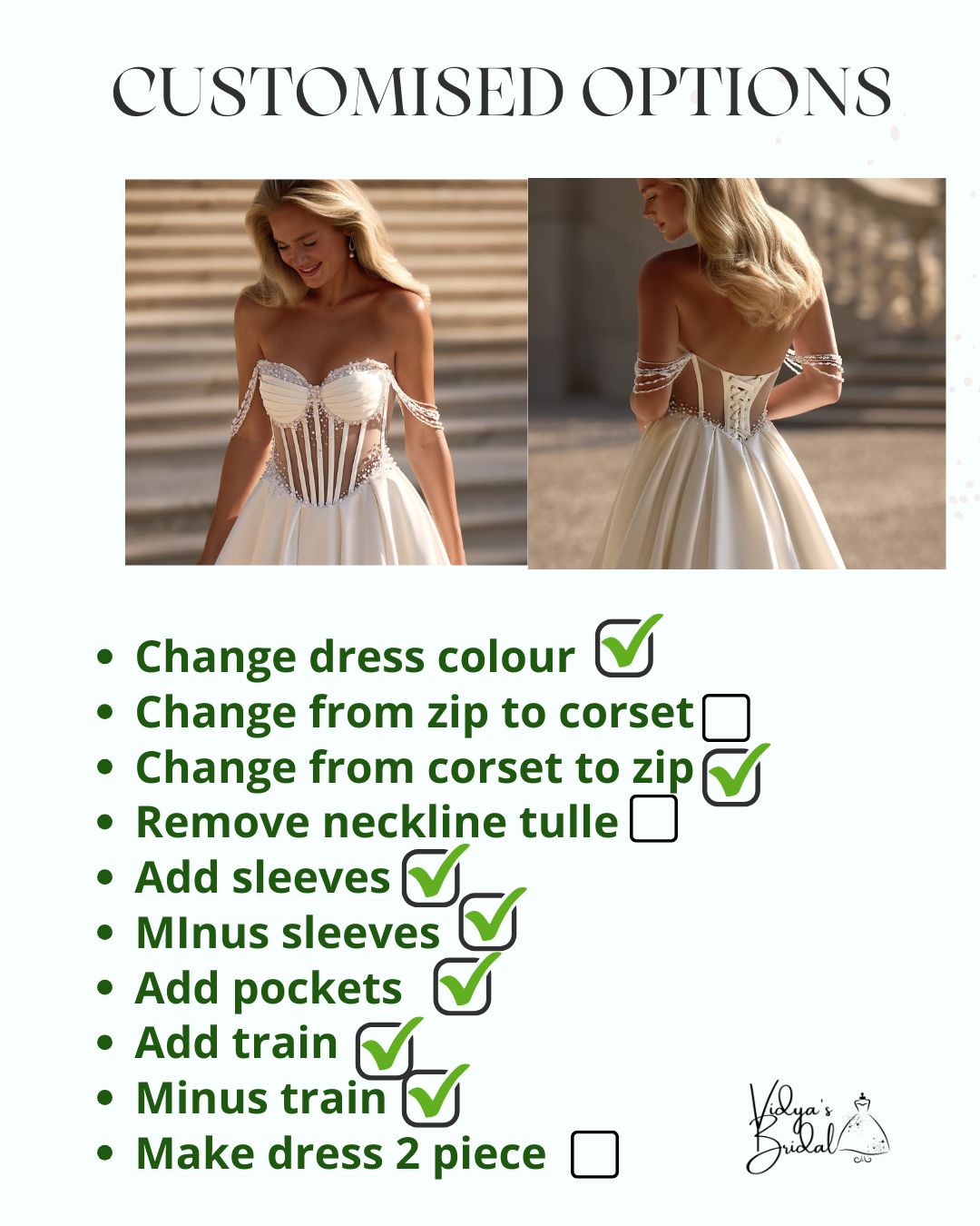 This gown is where modern elegance meets timeless romance. The corset-style bodice, adorned with intricate beading and delicate pearls, creates a mesmerizing illusion effect with structured boning that flatters your figure and accentuates your natural waist. The off-shoulder draped pearl strands add a whisper of glamour, gracefully skimming the arms for a soft, ethereal finish.