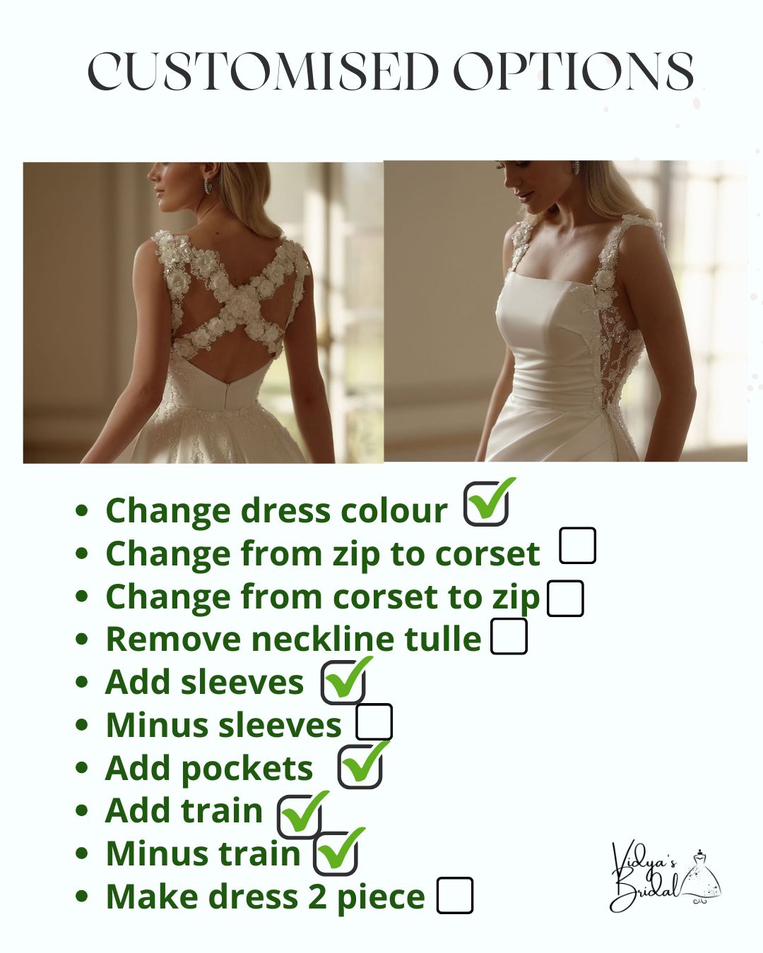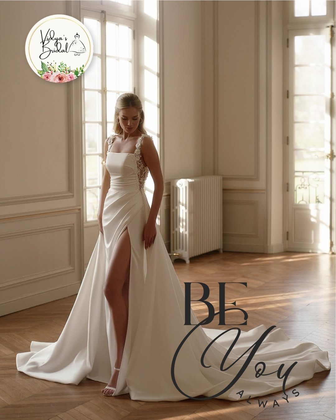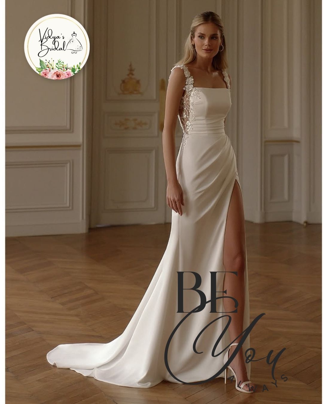 The structured square neckline brings a refined, contemporary edge, while delicate 3D floral appliqués along the straps and illusion lace back add a romantic, ethereal touch. The high thigh slit introduces just the right amount of allure, perfect for the bride who wants to balance elegance with modern glamour.