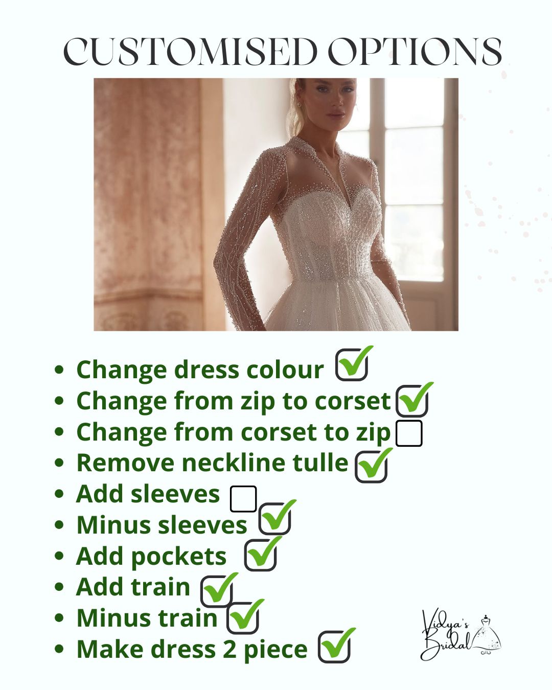 Step into timeless romance with this breathtaking bridal gown—a true vision of modern grace and classic allure. Crafted from luxurious tulle and adorned with delicate hand-beaded embellishments, this gown glistens subtly with every movement, capturing the light like a dream.