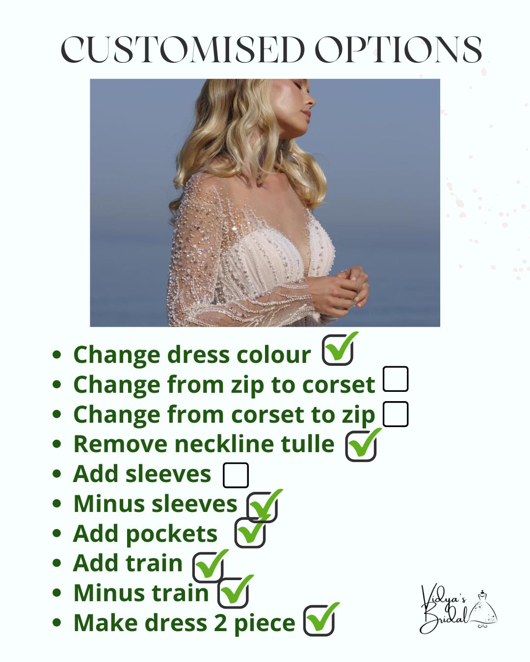 The long sheer sleeves are artfully embellished with intricate pearl and crystal detailing, catching the light as you move and adding a touch of celestial magic to your bridal look. The gown transitions seamlessly into a soft, structured skirt that flows into a regal train—elegant, yet easy to move in, whether you're walking down the aisle or twirling beneath the stars.