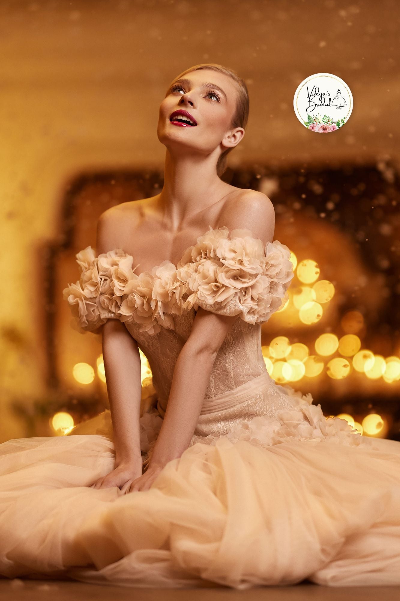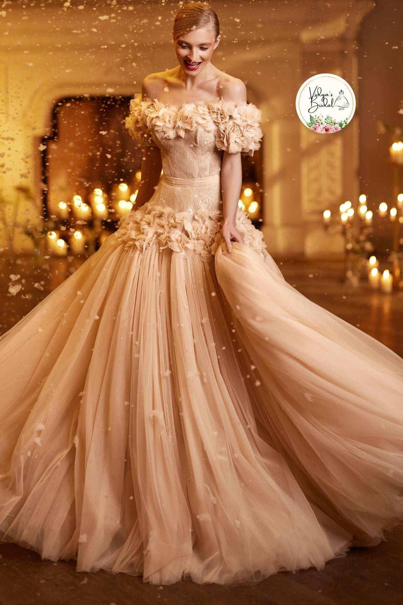 The dress bodice boasts a luscious caramel glaze that complements the thick ruffled flowers adorning the off shoulder sweetheart neckline and sleeve. The hips of the skirt are guided by the whimsical ruffled flowers, resulting in a uniquely unconventional flair. Delicate tulle and smooth satin give this piece a soft and airy appearance.