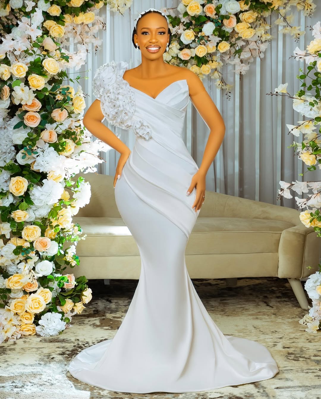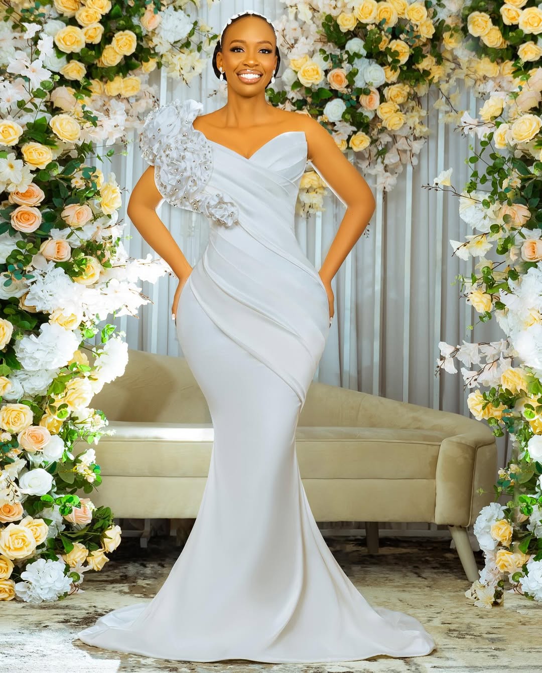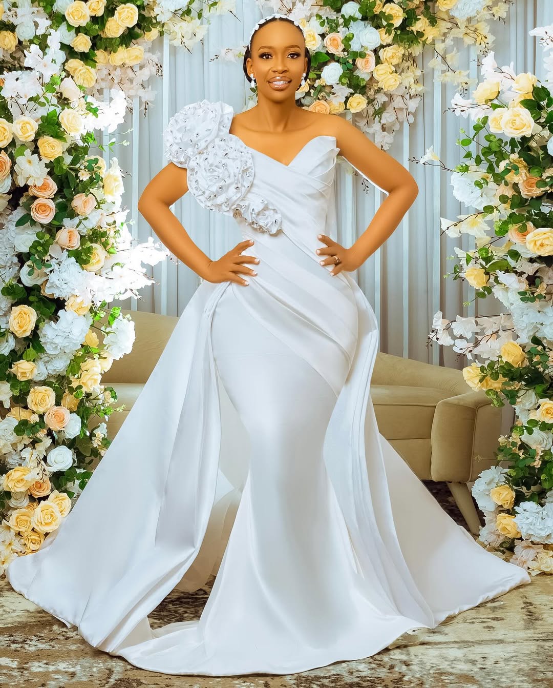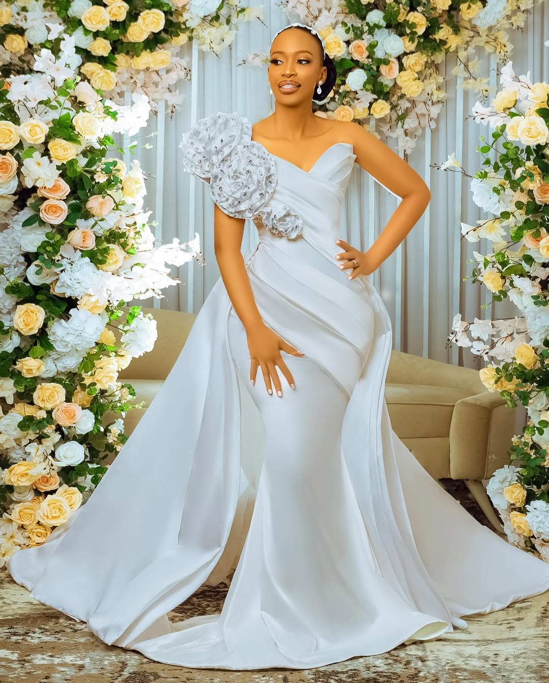 Introducing the Blue Bell 8463 - the ultimate dress for a showstopping entrance. With a big rosette detachable piece on the side, this mermaid dress is sure to turn heads. And for added versatility, it also comes with a detachable train. Make a statement and stand out in the beautiful and unique Blue Bell 8463.