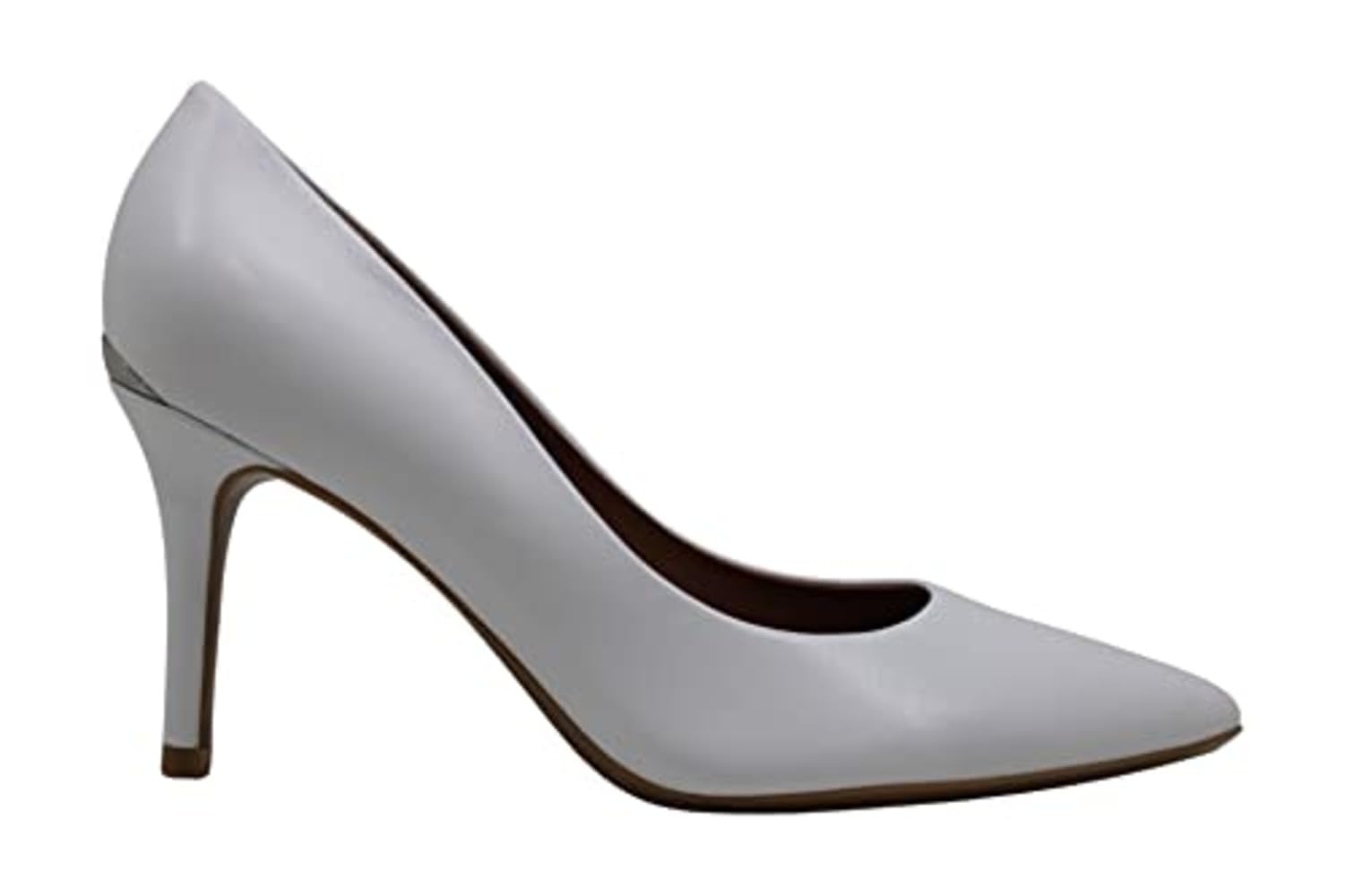 Elevate your style with the Calvin Klein Women's Gayle Pump in white leather. Designed for seamless transition from day to night, these elegant pumps showcase a sleek pointed toe and easy slip-on design. With a 3.27" high heel, they offer a sophisticated silhouette that complements any outfit. Imported for quality and style, these pumps are a must-have for a polished, chic look.