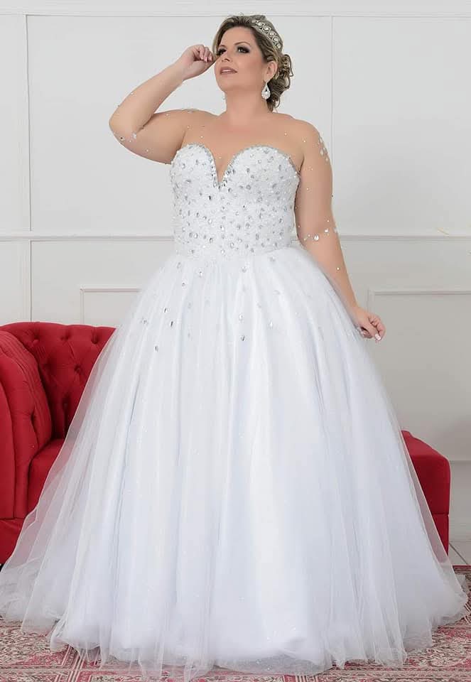 The sweetheart neckline enhances your natural beauty with a romantic and flattering silhouette, while the bodice is encrusted with shimmering crystal appliqués that catch the light from every angle. These sparkling embellishments continue delicately onto illusion mesh sleeves, creating the magical illusion of floating gems across your skin—elegant, ethereal, and utterly unforgettable.