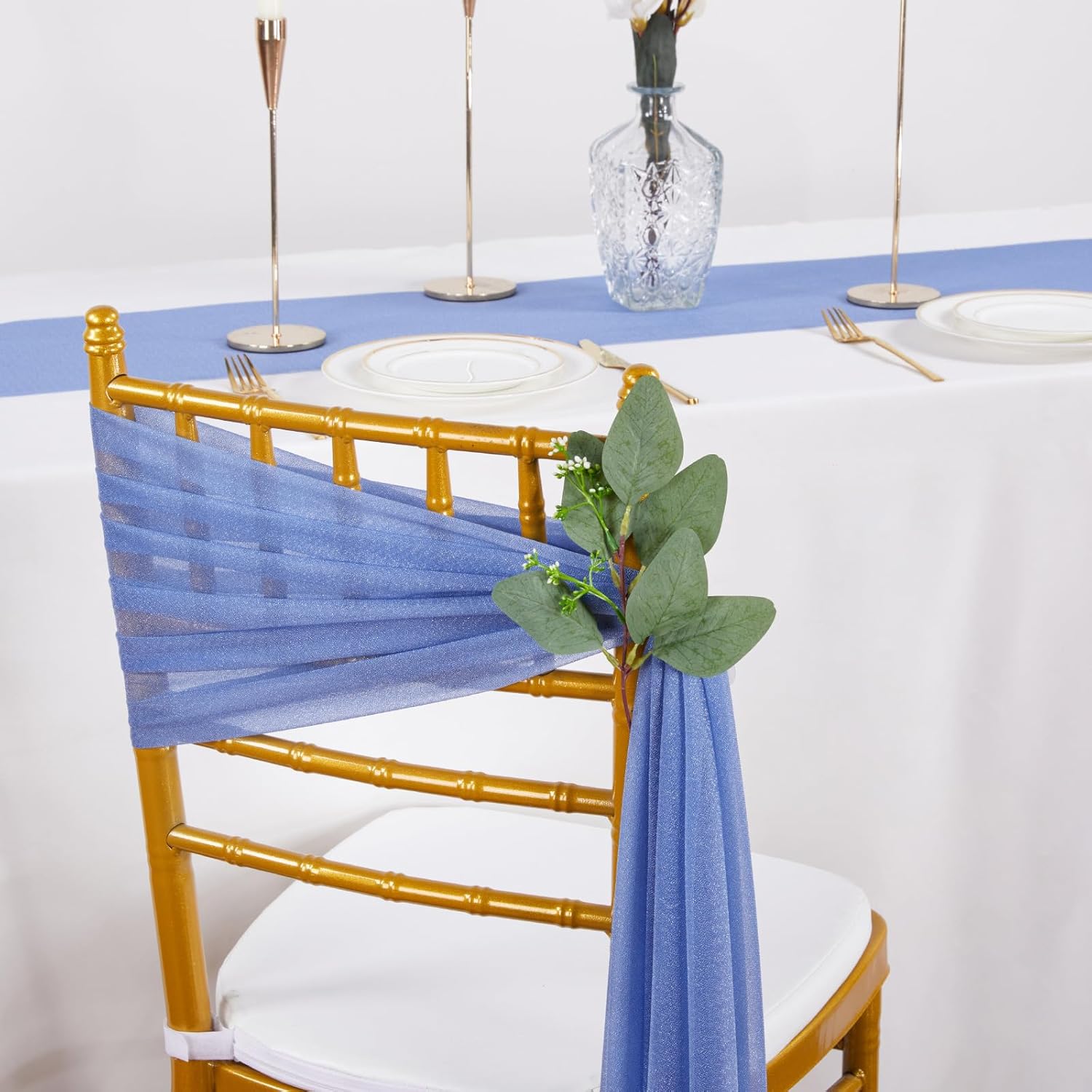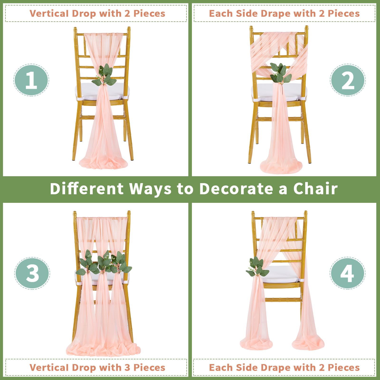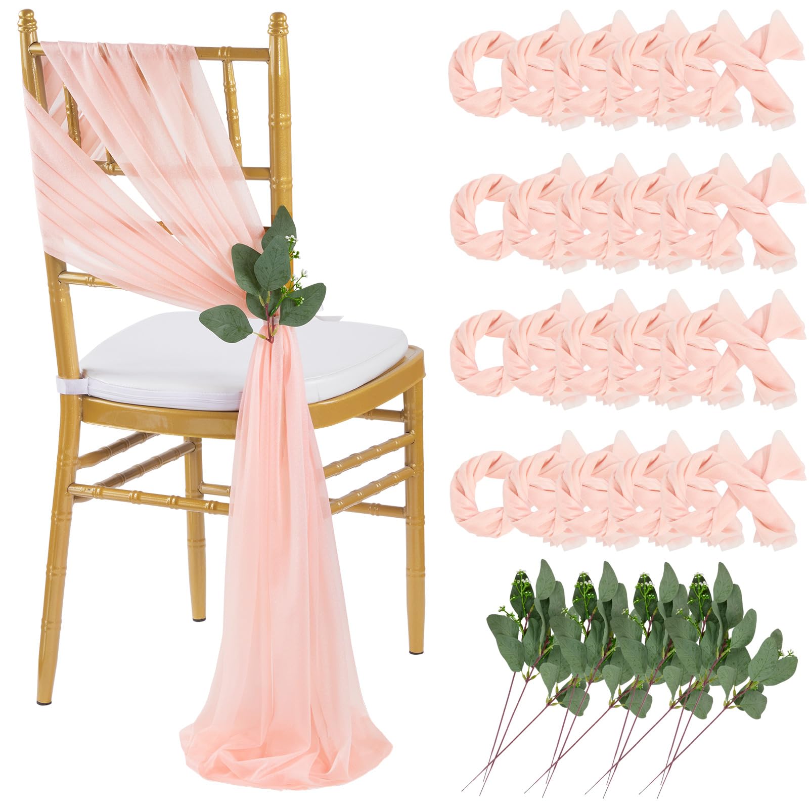 - This bulk set includes 24 chiffon chair sashes, each 8 feet long, along with 24 meters of ribbon. Crafted from soft, sheer chiffon-like fabric, these sashes feature strong, transparent straps that stay securely in place. Easily tie elegant bows and add artificial eucalyptus or fresh flowers to enhance any setting with a romantic touch. Ideal for weddings, receptions, banquets, and more, these sashes are washable by hand or in a laundry bag with cold water and mild detergent, then air-dried for long-lasting use. Elevate your décor effortlessly with these durable, stylish chair accents.