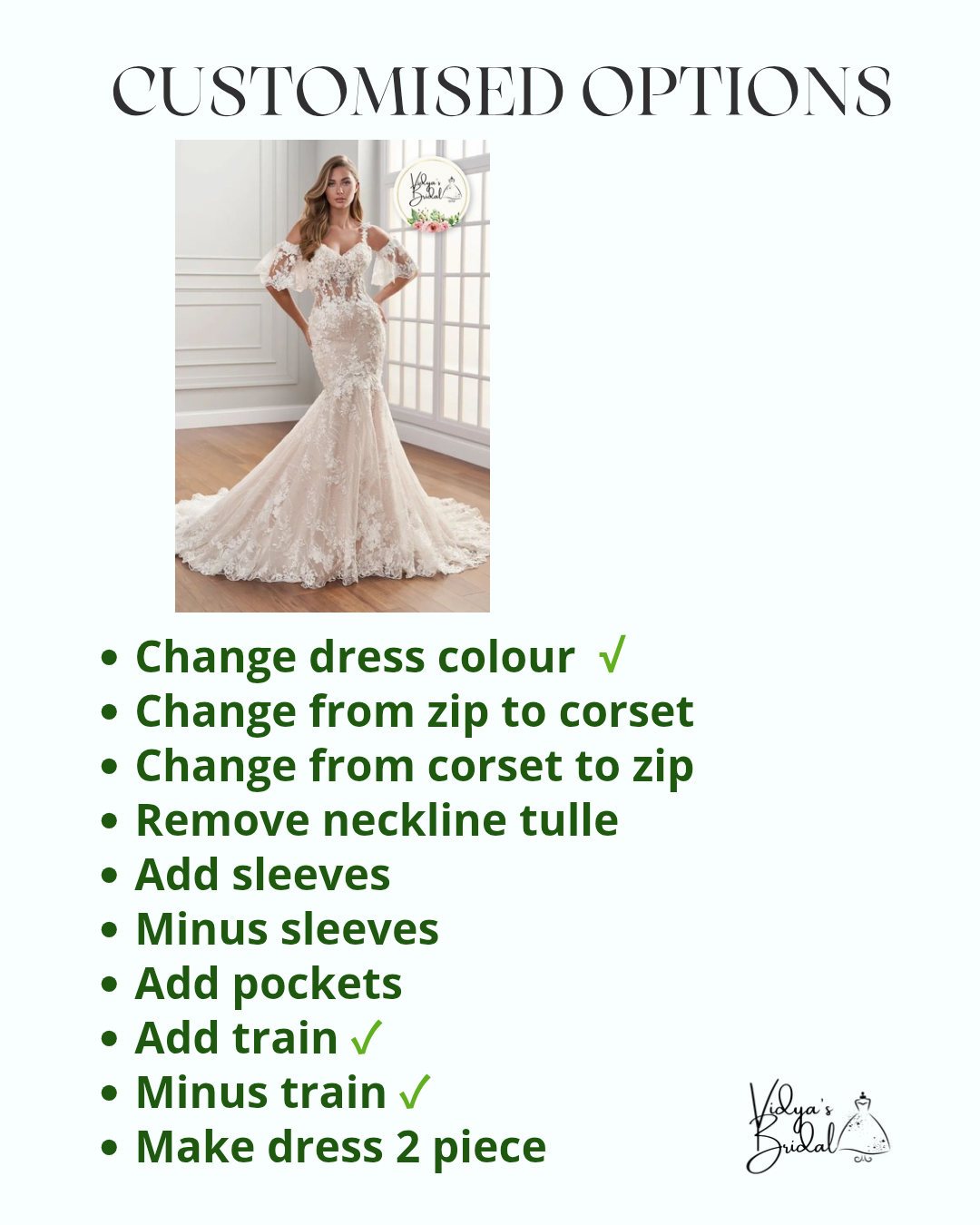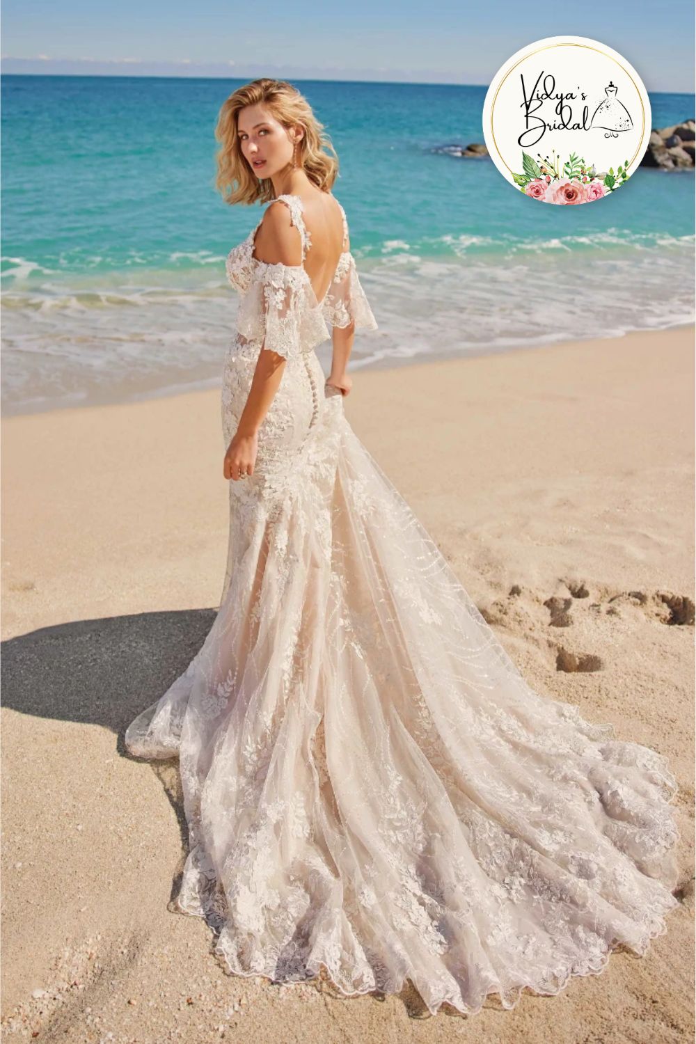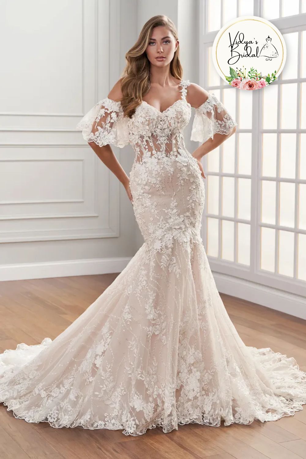 You'll adore the romance of this ultra-feminine fit and flare gown. Featuring a semi-sheer corseted bodice accented with dreamy three-dimensional Schiffli lace applique, Chiara strikes the perfect balance between femininity and seduction. Separate sleeves add a touch of whimsy to this unforgettable bridal look.