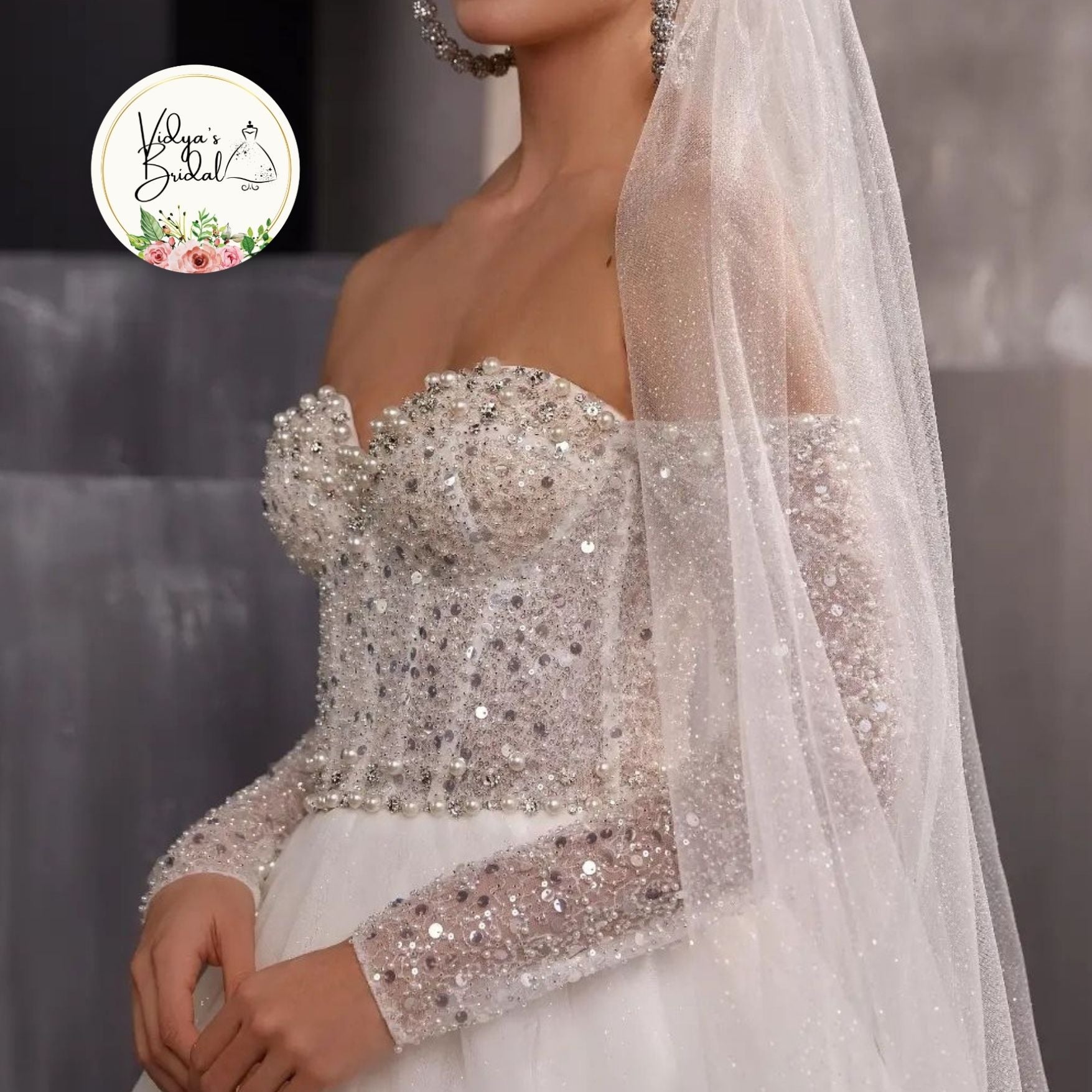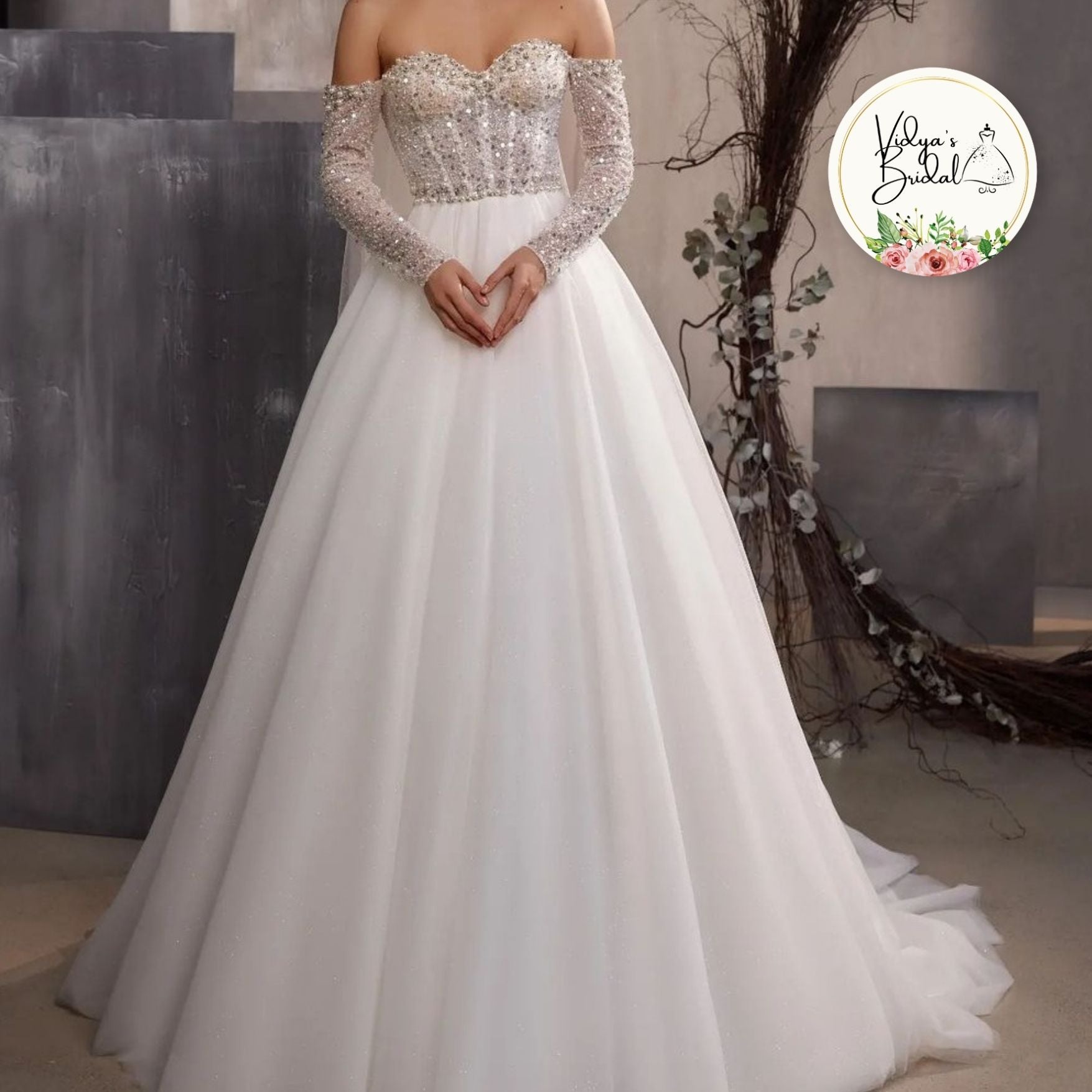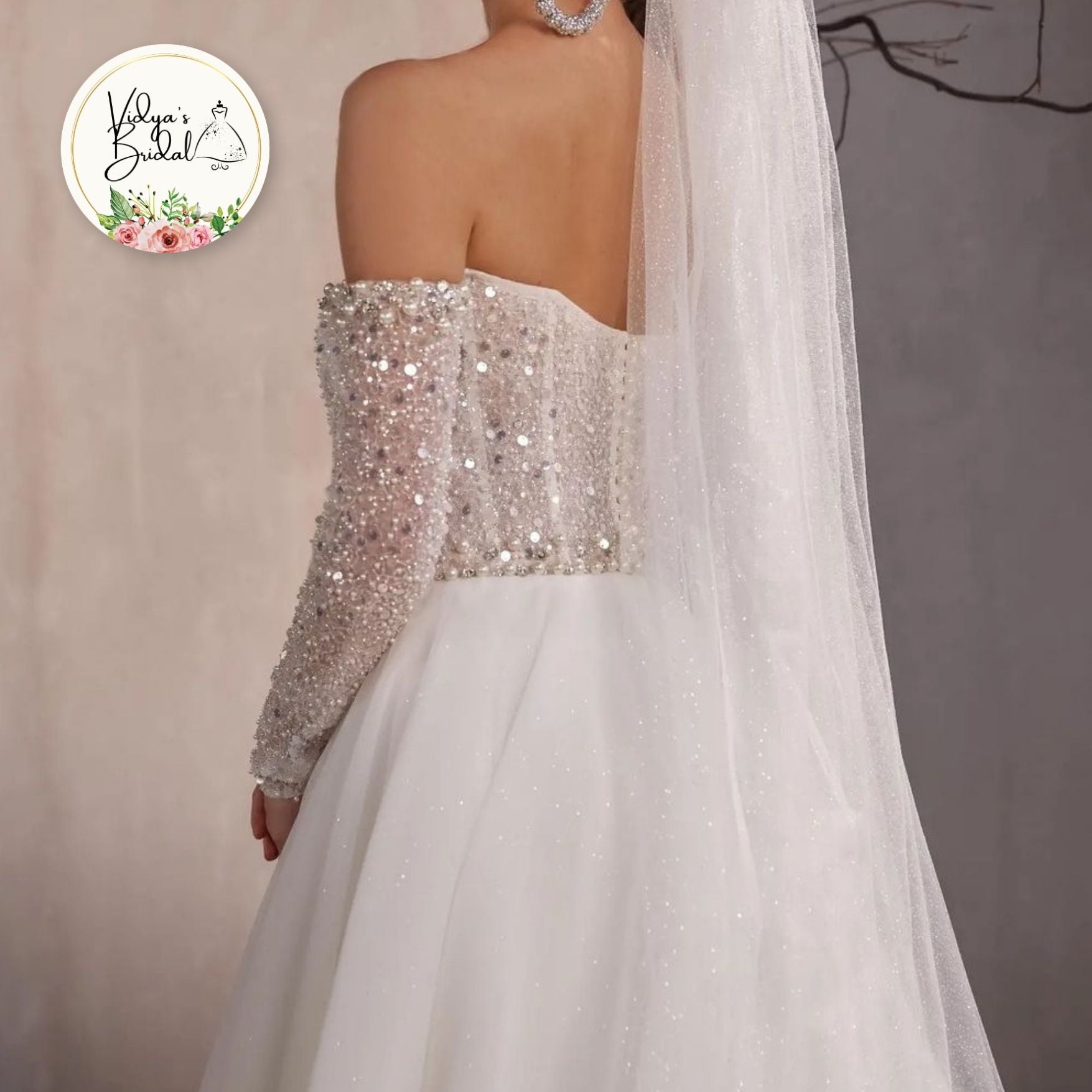 Make a statement with this stunning gown. The sweetheart neckline with off-the-shoulder sleeves adds a touch of romance while the luxurious silver beads, crystals, and sequins bring a touch of sparkle. The lightweight chiffon fabric elegantly drapes to a court train, making it the perfect choice for any special occasion.