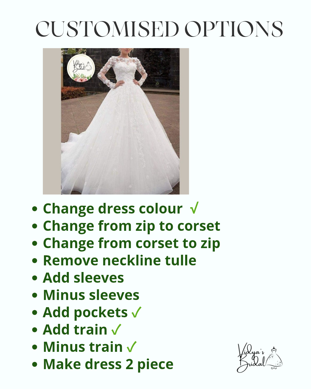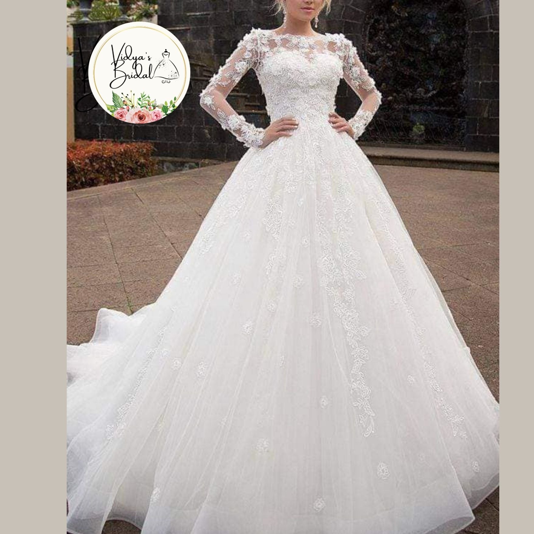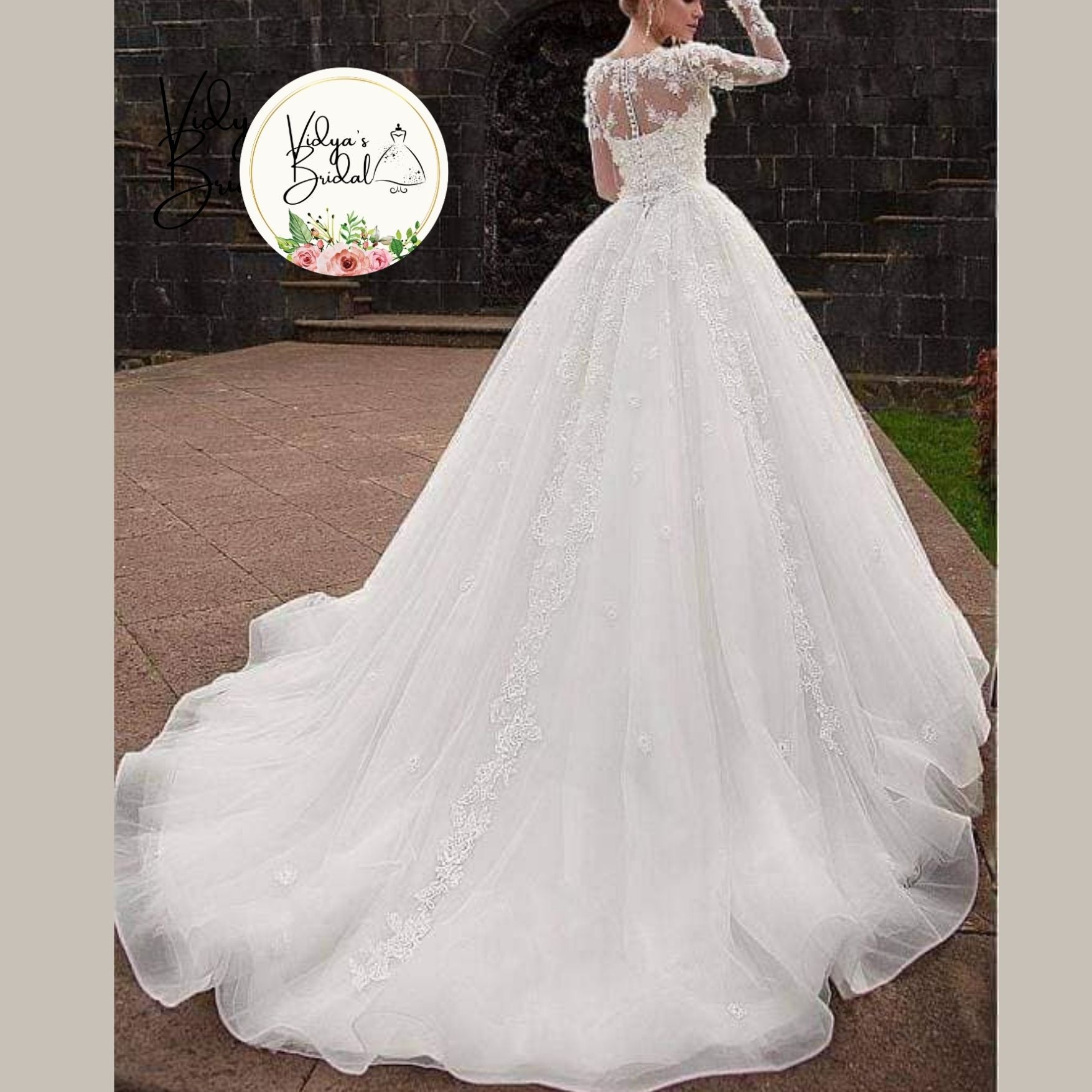 This stunning gown features a distinctive illusion neckline embellished with three-dimensional floral appliqués that extend to the skirt. French lace and additional appliqués further enhance the design, and a petticoat is included.