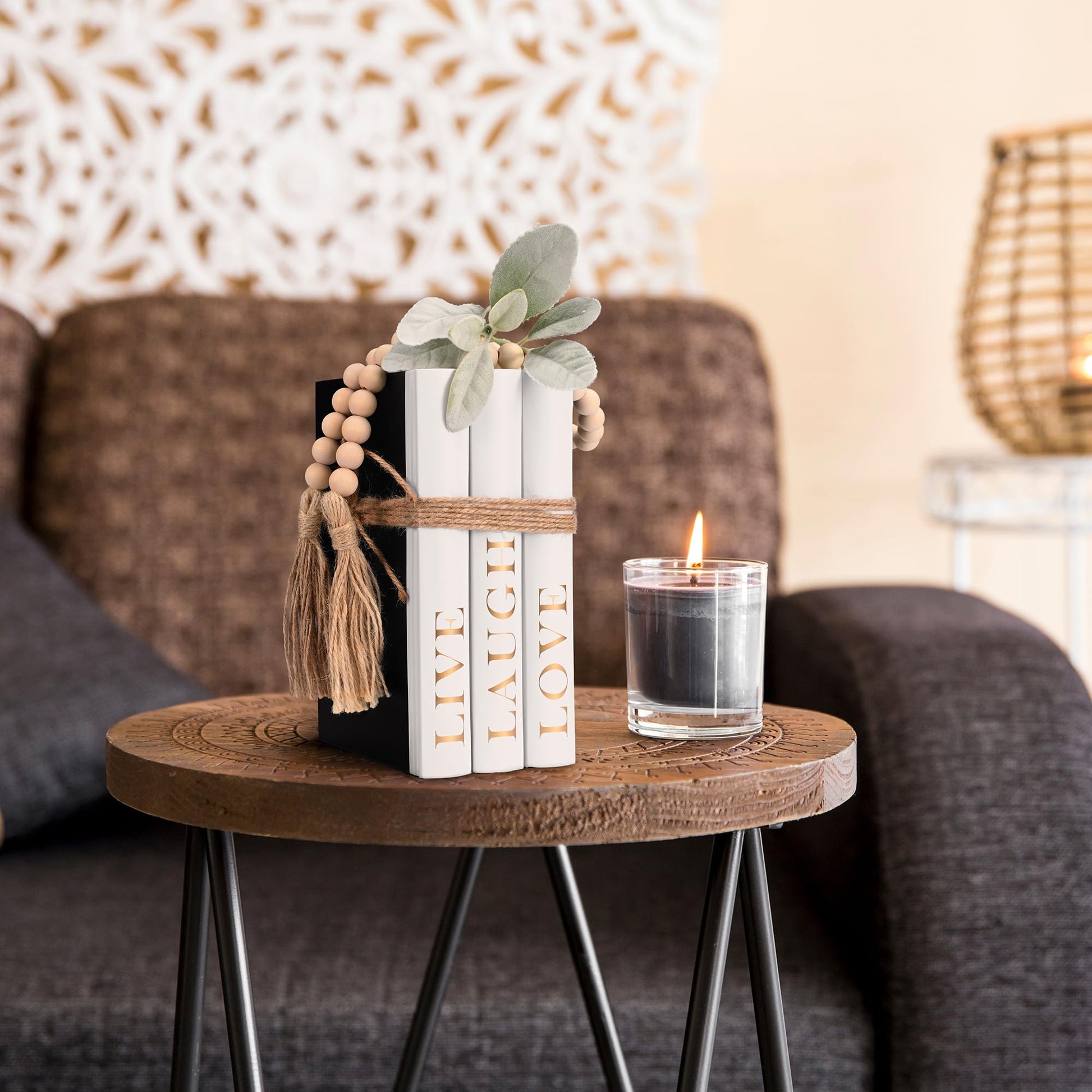 Features: : This package includes a set of 3 Live | Laugh | Love Hardcover Decorative Books, Wood Bead Tassels, Artificial green leaves, and Twine hemp rope. Use these farmhouse book stacks to add beauty to your bookshelf, coffee table, mantle, or tray. Decorate your living room shelf with these inspiringly versatile books. 【Blank Pages for Personalization】: These decorative books may appear real in every way, but they contain no printed content inside. Add your own personal touch and make them truly yours. The linen cover adds to their natural beauty, making them even more stunning in person. 【Bold Inspirational Words on Spine】: The spine of these striking black, white, and gold decor books feature empowering words, serving as daily reminders to face life with courage, even in the face of difficulties. 【Lifetime Support】: We are honored to have you as our customer and we are dedicated to providing you with the best