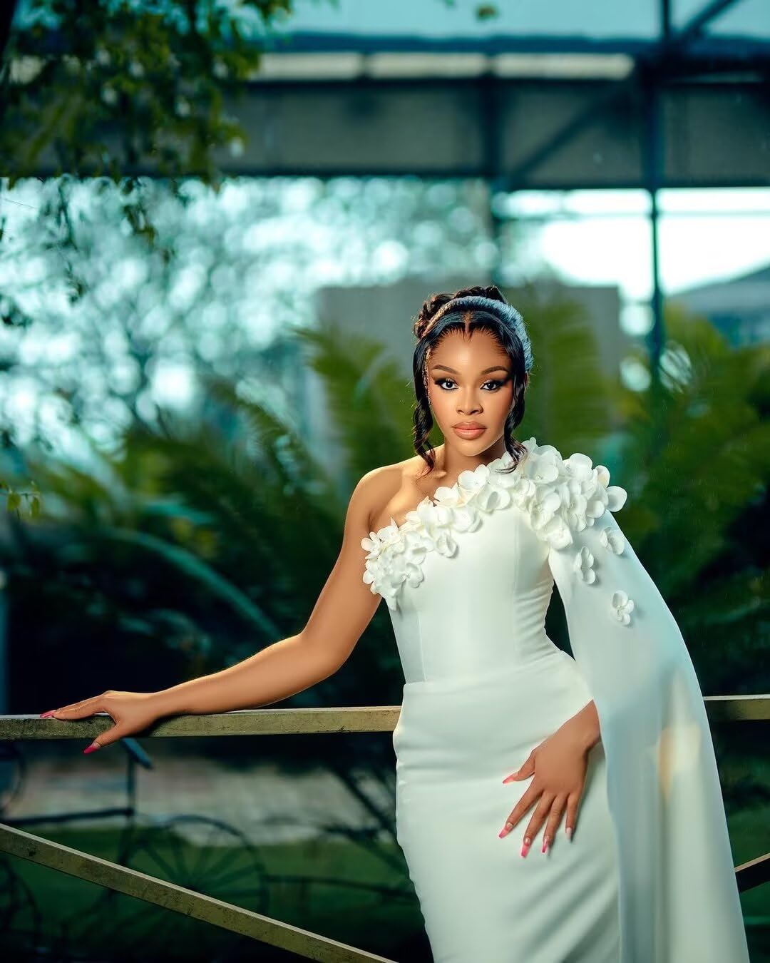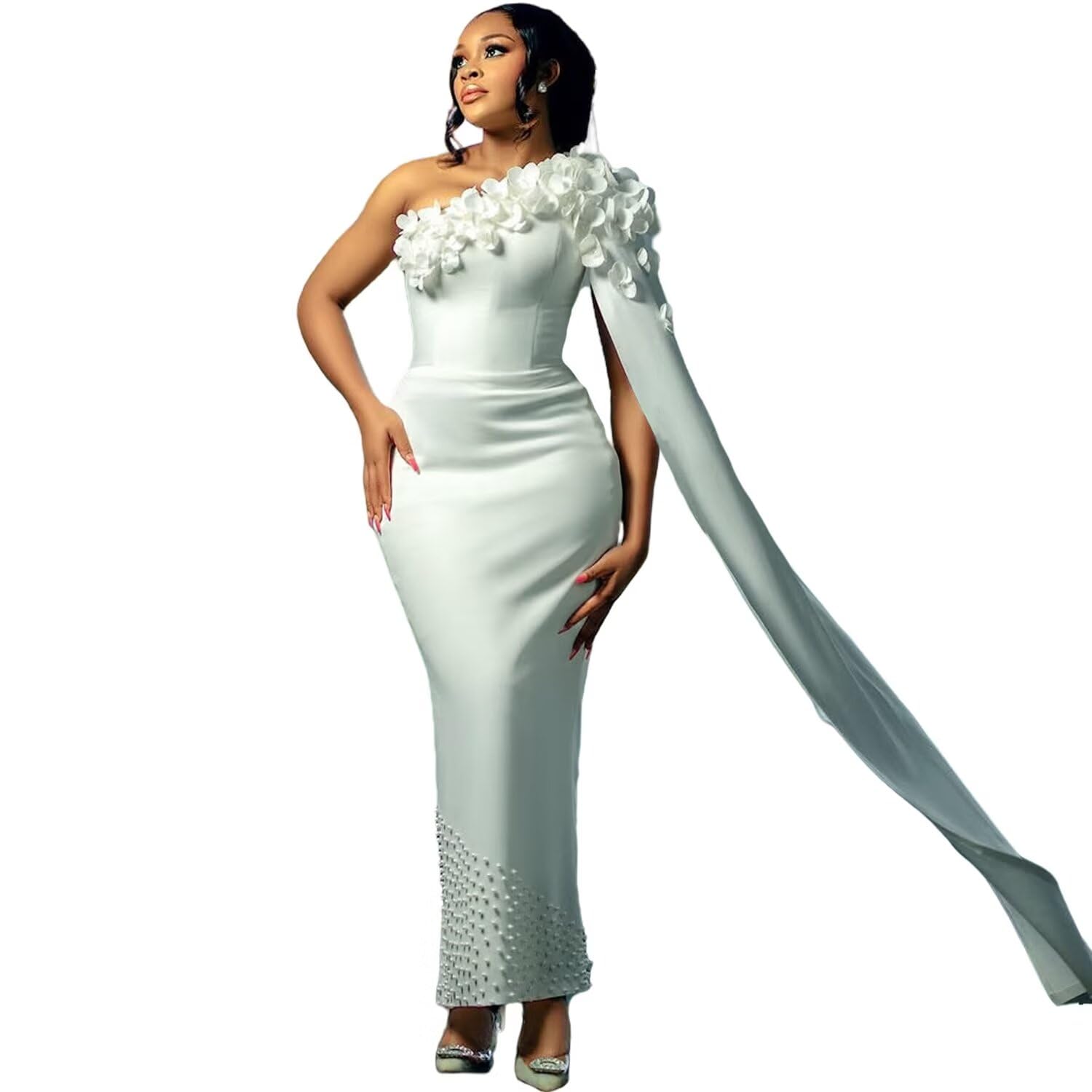 Elevate your bridal look with this elegant one-shoulder wedding dress that beautifully blends modern sophistication with African bridal heritage. The unique single flutter sleeve adds a graceful touch, while intricate 3D floral appliques and hand-sewn pearls create a stunning, textured design. Crafted from premium satin, the dress offers a luxurious feel and durability. Built-in bra support and an adjustable lace-up back provide customizable comfort and a perfect fit, accommodating slight size variations. The ankle-length cut allows ease of movement during your ceremony, making it both stylish and practical for your special day.