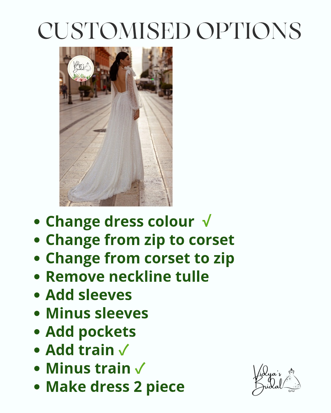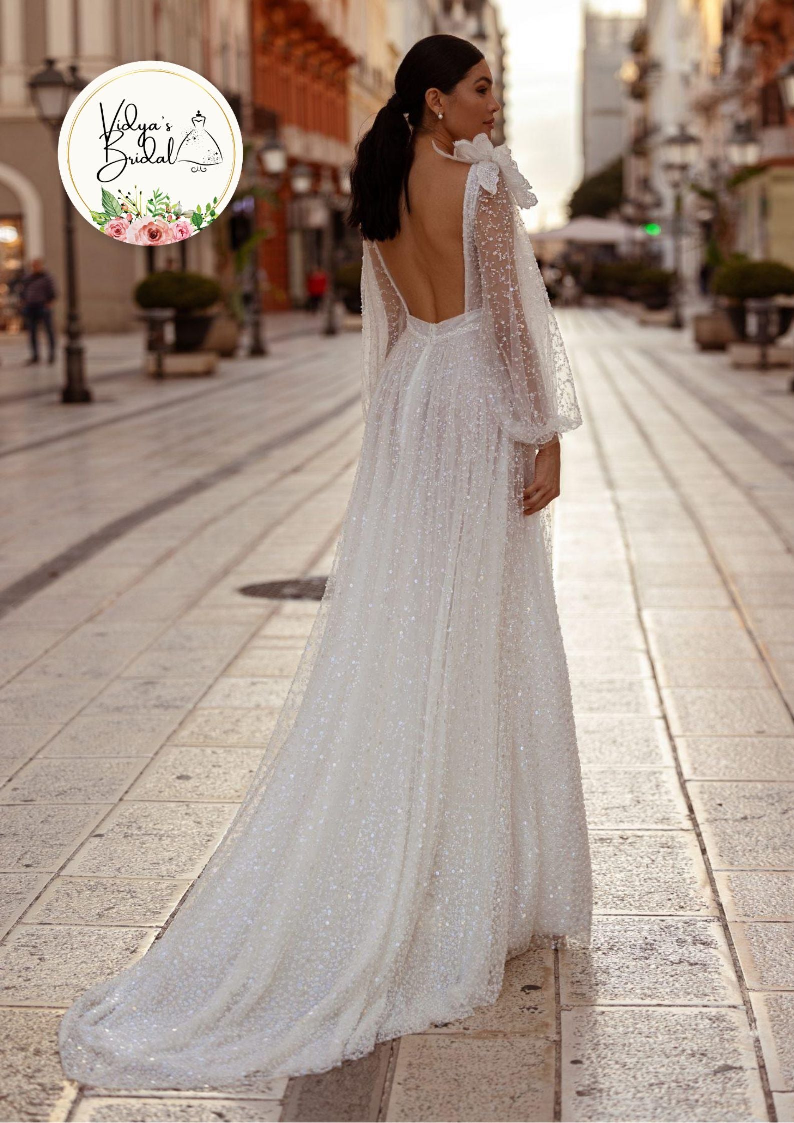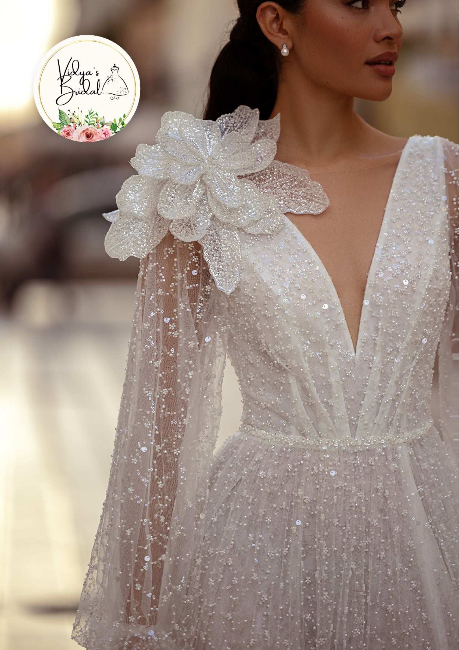 This dress is designed for a confident bride with its tall, thin, young, and lovely look. The deep V cut neckline features a statement floral piece on one shoulder, adorned with beautiful sequin fabric and embellished tulle. The neckline is complemented by a single side slit.