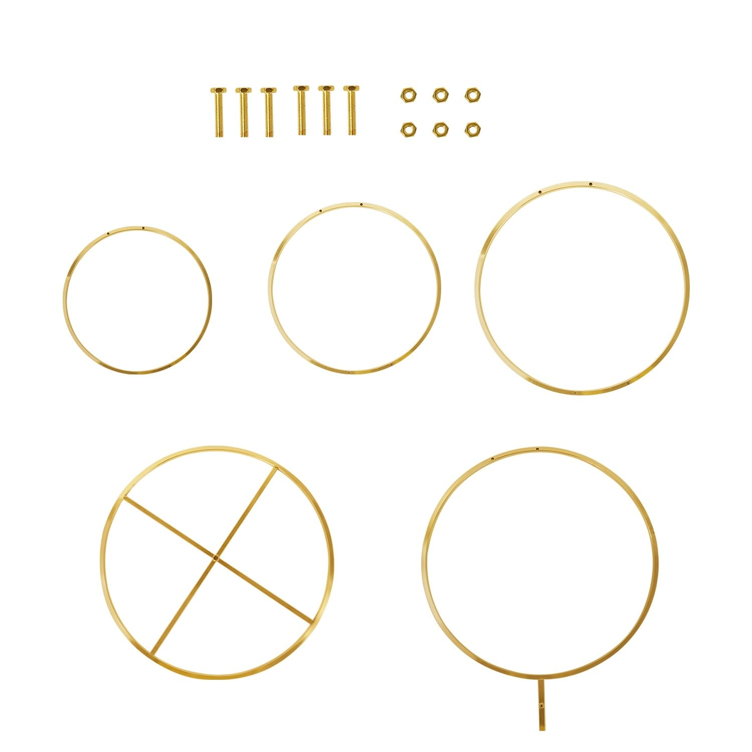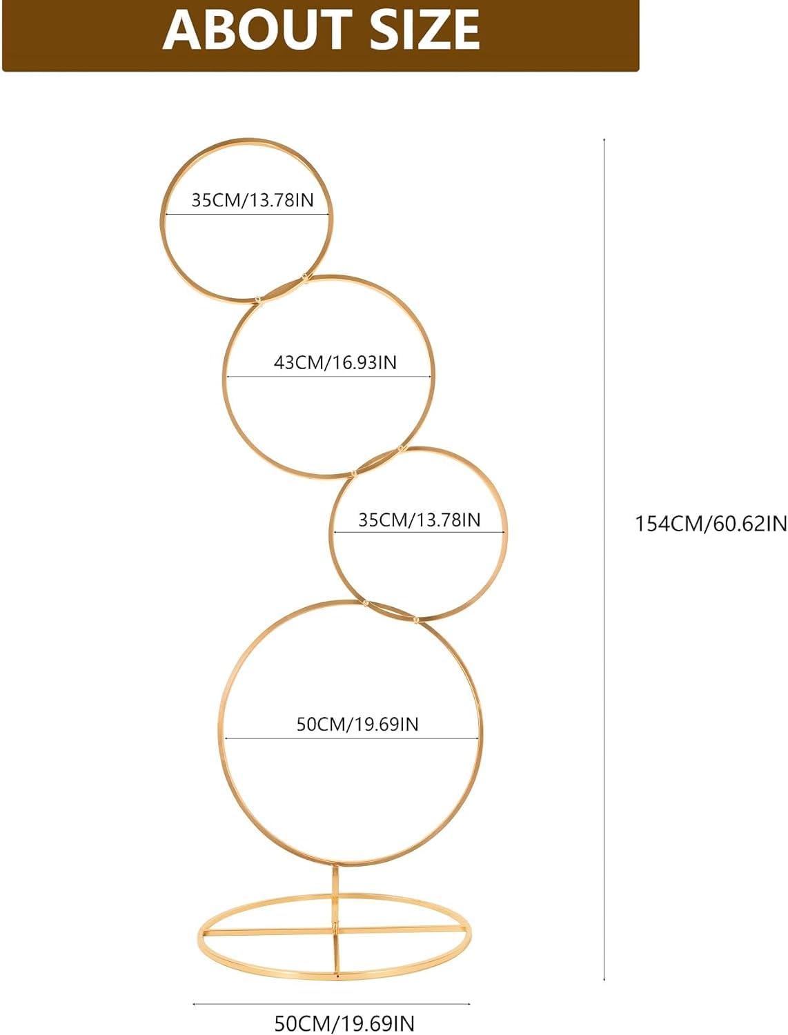 - This gold backdrop stand set includes 2 gold arch stands, a sturdy base (50cm x 10cm), one large hoop (50cm), one medium hoop (43cm), and two small hoops (35cm), measuring 60" high by 33" long. Crafted from smooth metal with a sleek, intertwined four-circle design, it adds an elegant and memorable touch to any event. Made from reinforced iron with anti-rust treatment, it offers strong stability and durability. The solid base ensures it stays secure, making it a reliable choice for stylish and lasting decoration. (Note: Decorative flowers not included.)