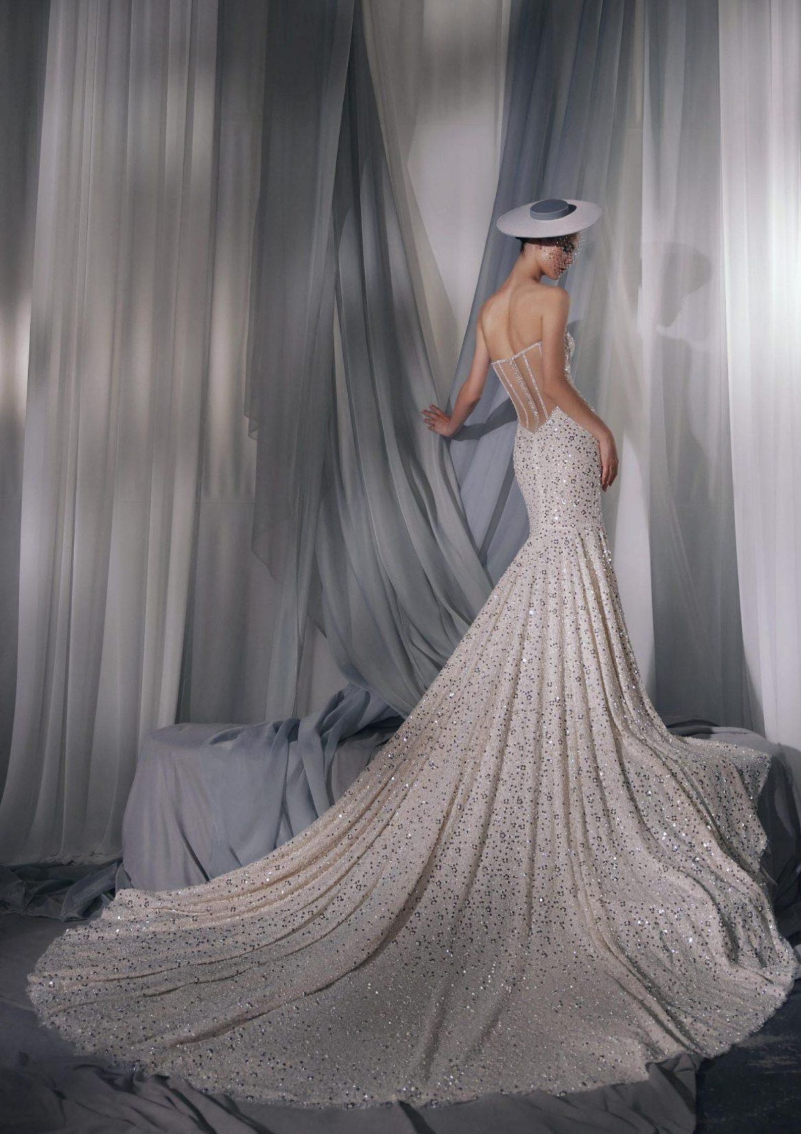 This stunning Havana design is the perfect combination of classic elegance and modern flair. With a strapless, sheer back corseted bodice and a dazzling sequin fabric mermaid silhouette, this dress will make any bride feel bold and confident. The optional detachable taffeta skirt adds versatility to this timeless piece. With a beautiful train starting just below the hipline and above the knee, this dress is sure to make a statement.