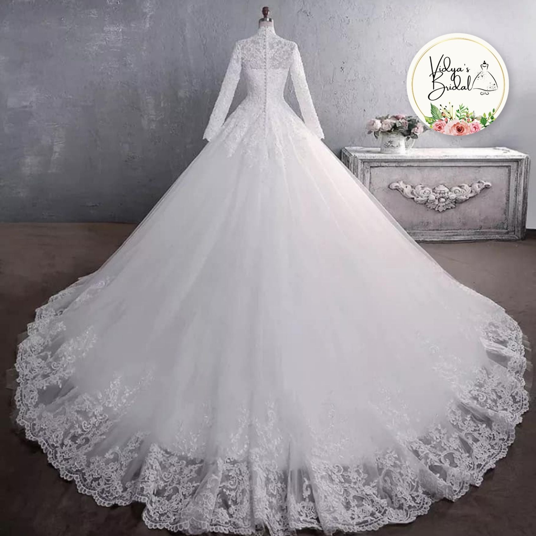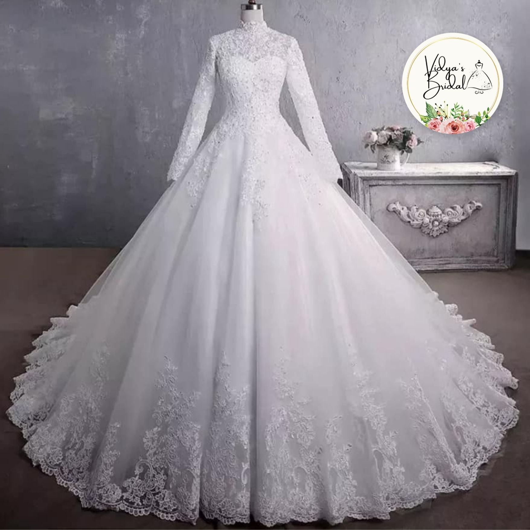 This modern Arabic-style wedding gown, featuring a sweetheart neckline, tulle and appliqué illusion, satin-lined sleeves, and a stunning semi-A-line skirt with rich appliqué borders, is ideal for the discerning bride seeking a modest yet elegant design. A petticoat is included.