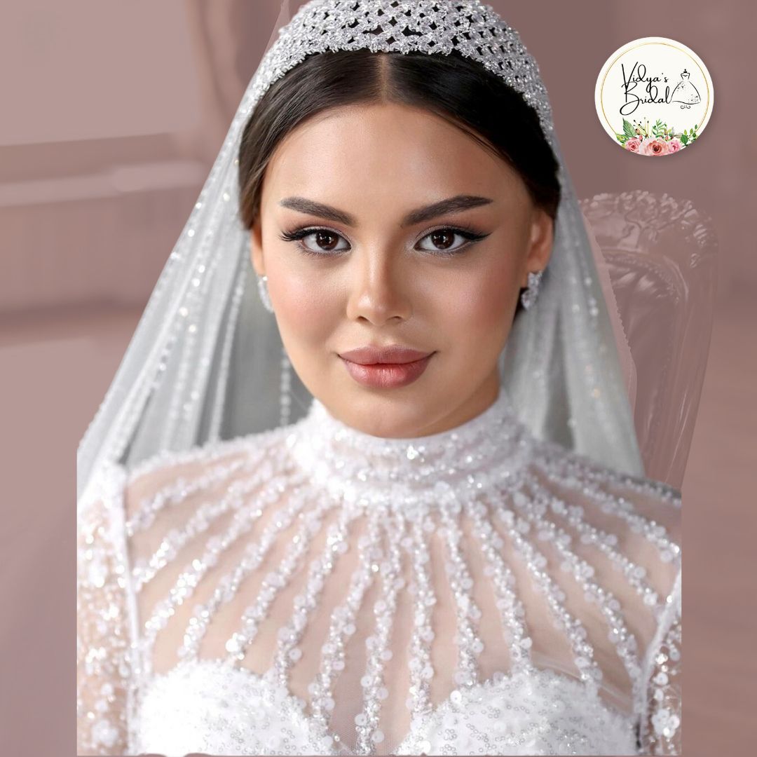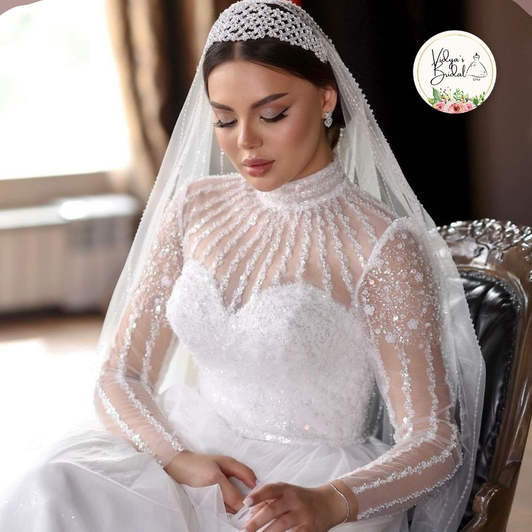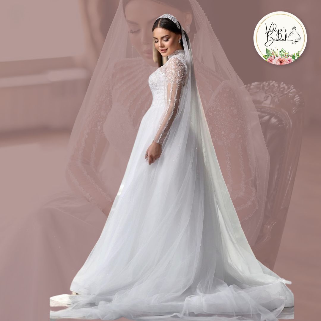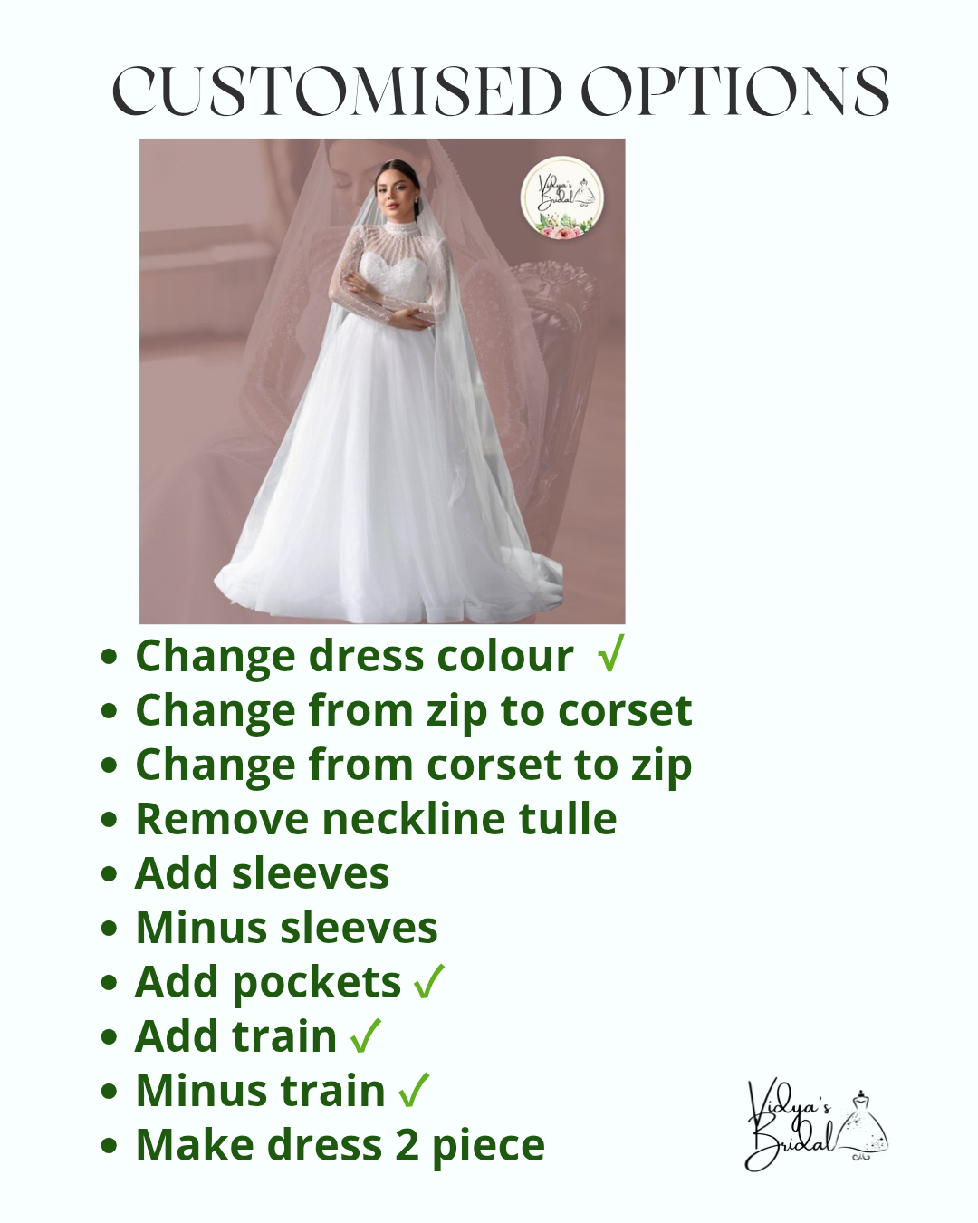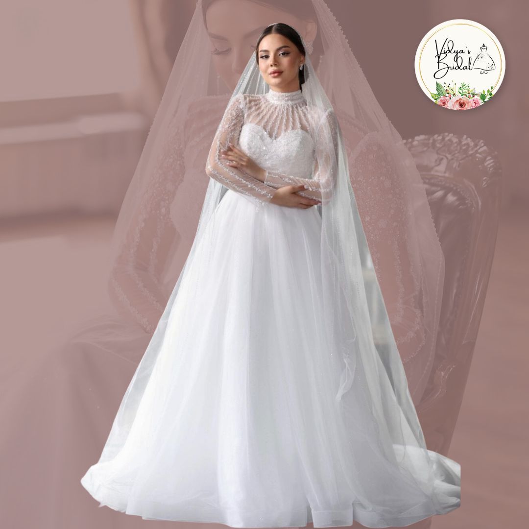 Experience pure elegance in this stunning Moroccan-designed dress, tailored for the bride who desires to radiate beauty. The intricate beadwork draping from the illusion neckline creates a waterfall effect, leading to a charming sweetheart finish. The semi A-line silhouette gracefully transitions into a tulle skirt with a delicate horsehair border, all culminating in a gorgeous chapel train.