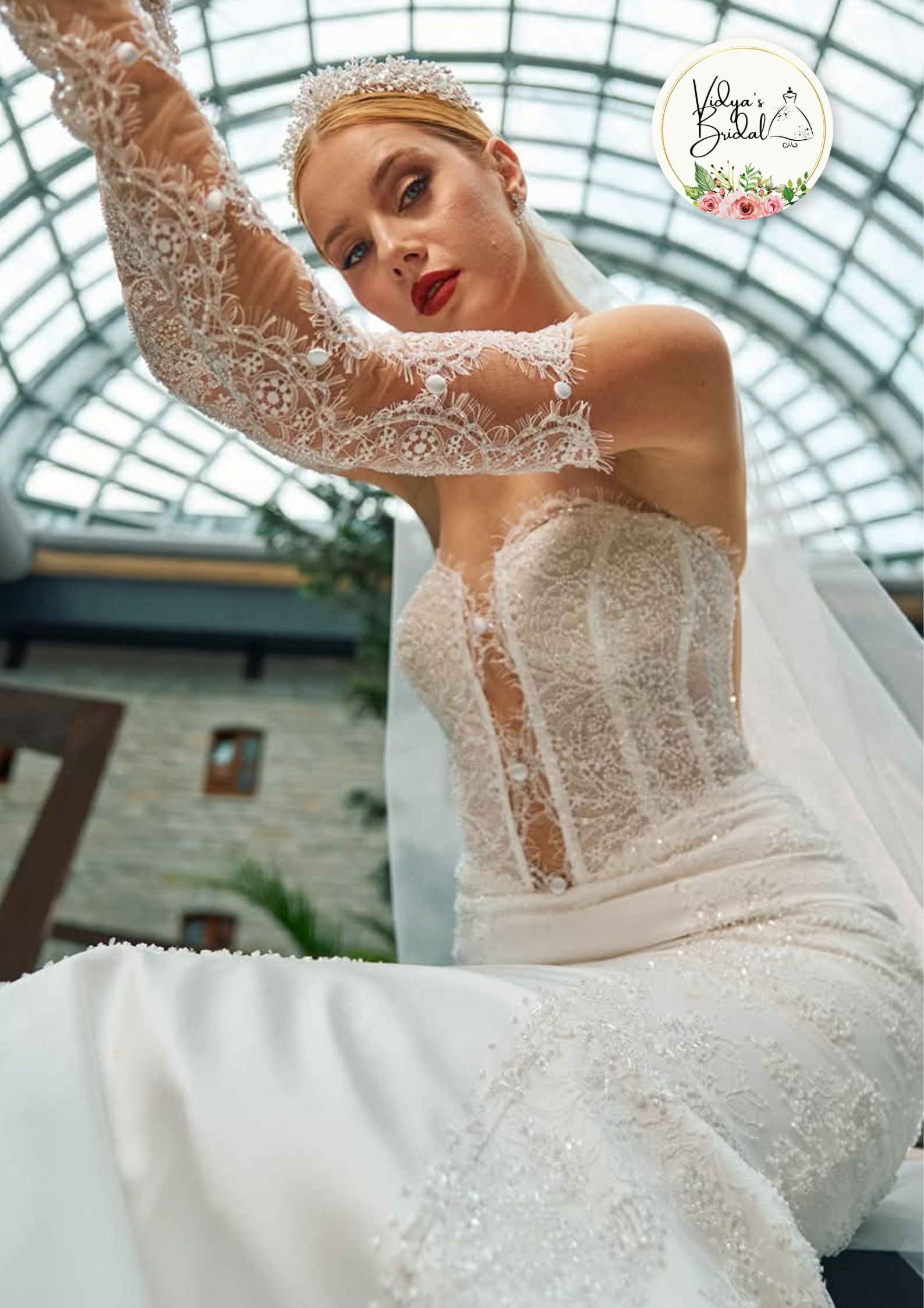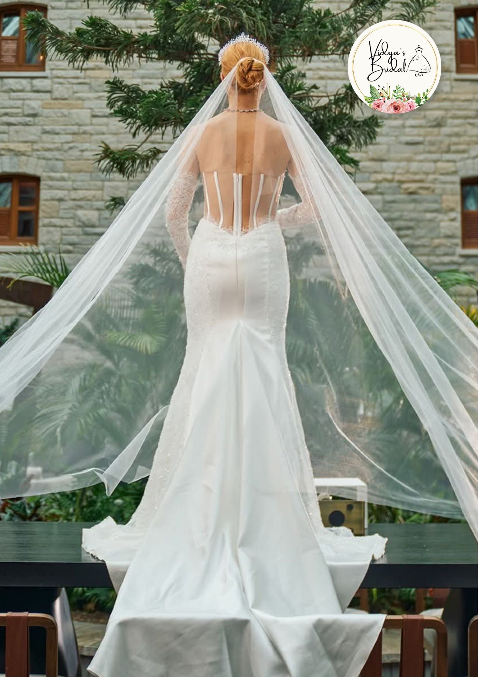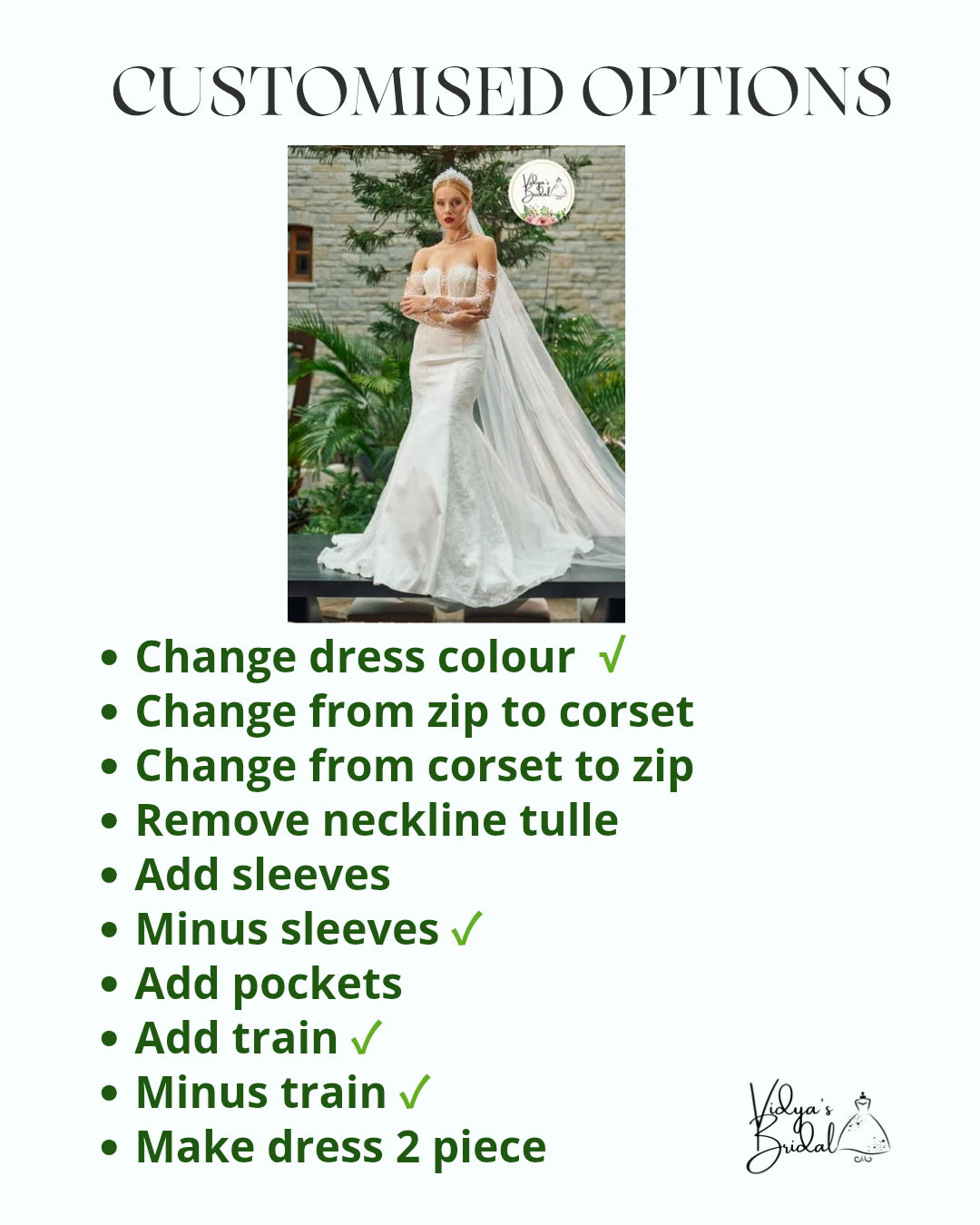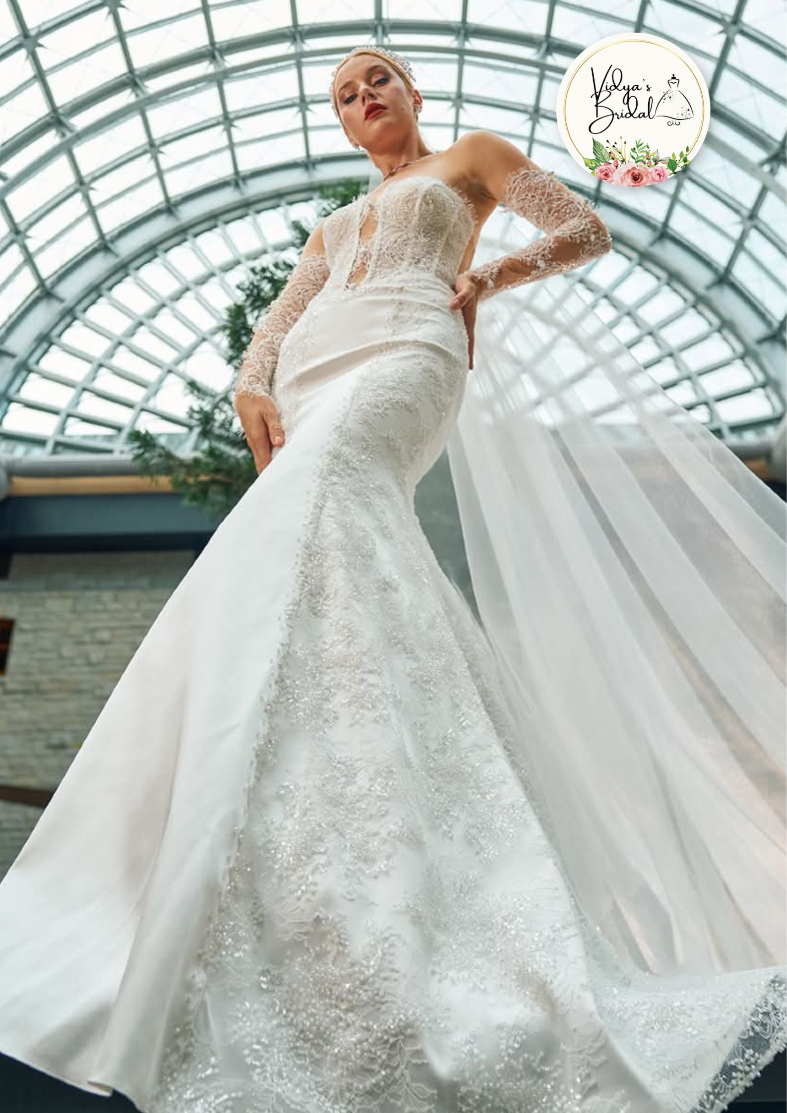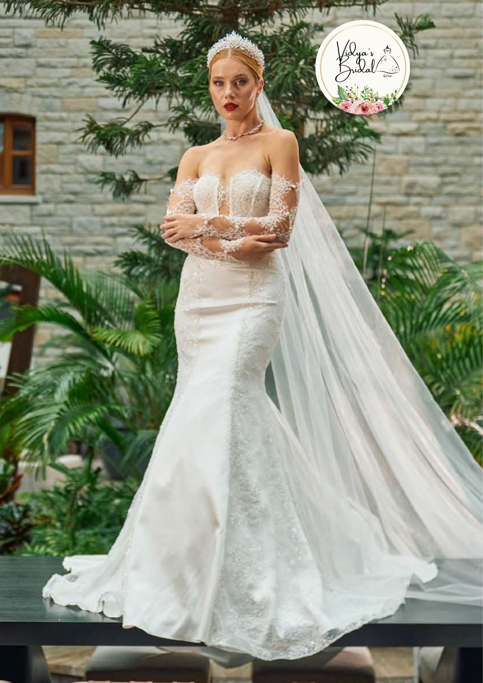 Spice up your look with this gown that exudes elegance and showcases your upper body. The tight-fitting bodice features a stunning sheer design and detachable sleeves, while delicate French lace and sparkling sequins adorn the dress, adding a touch of refined charm. The chapel train adds a sense of grandeur to the two sides of the skirt, making you feel like a true queen on your special day.