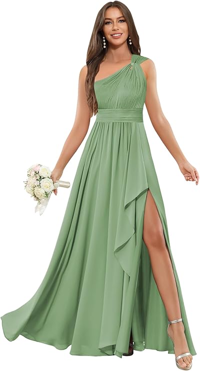 Step into elegance with these Long Chiffon Bridesmaid Dresses featuring a floral one-shoulder design, ruffles, and a stylish slit. Perfect as a wedding guest outfit or a chic formal evening gown, they also shine at cocktail parties. Whether it's prom, birthdays, or any special occasion, these dresses will make you the star of the night. Remember, sizing runs a bit different—check our SIZE CHART carefully or reach out for custom tailoring. Dance, dazzle, and delight in these stunning gowns made to turn heads!