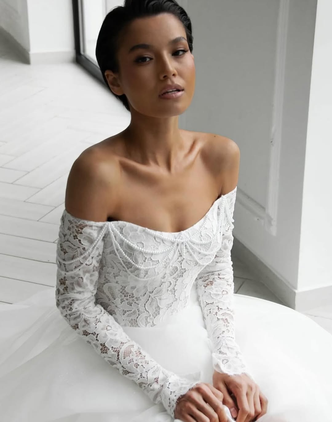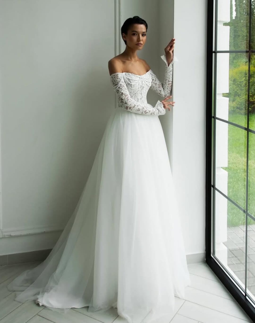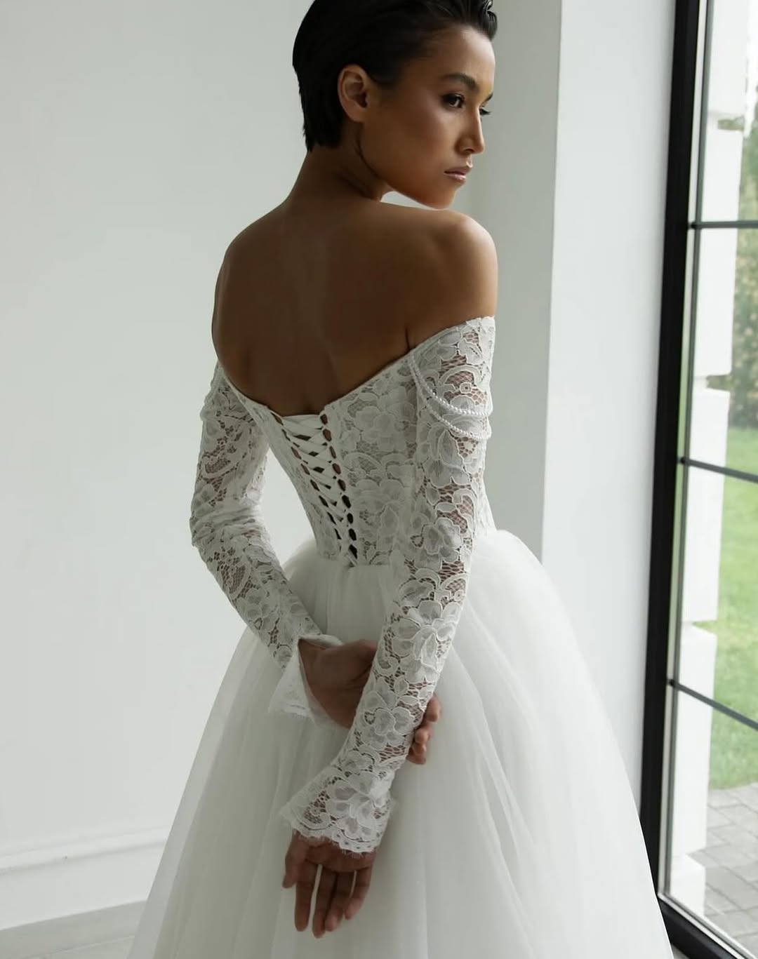 "Elevate your wedding day look with this stunning off-the-shoulder lace wedding gown. The fitted, long-sleeved bodice features intricate lace details and a delicate neckline, while the flowing tulle skirt creates a romantic, ethereal effect. The dress is perfect for a bride seeking a classic, elegant look with a touch of whimsy.