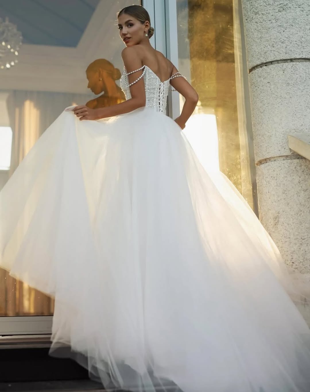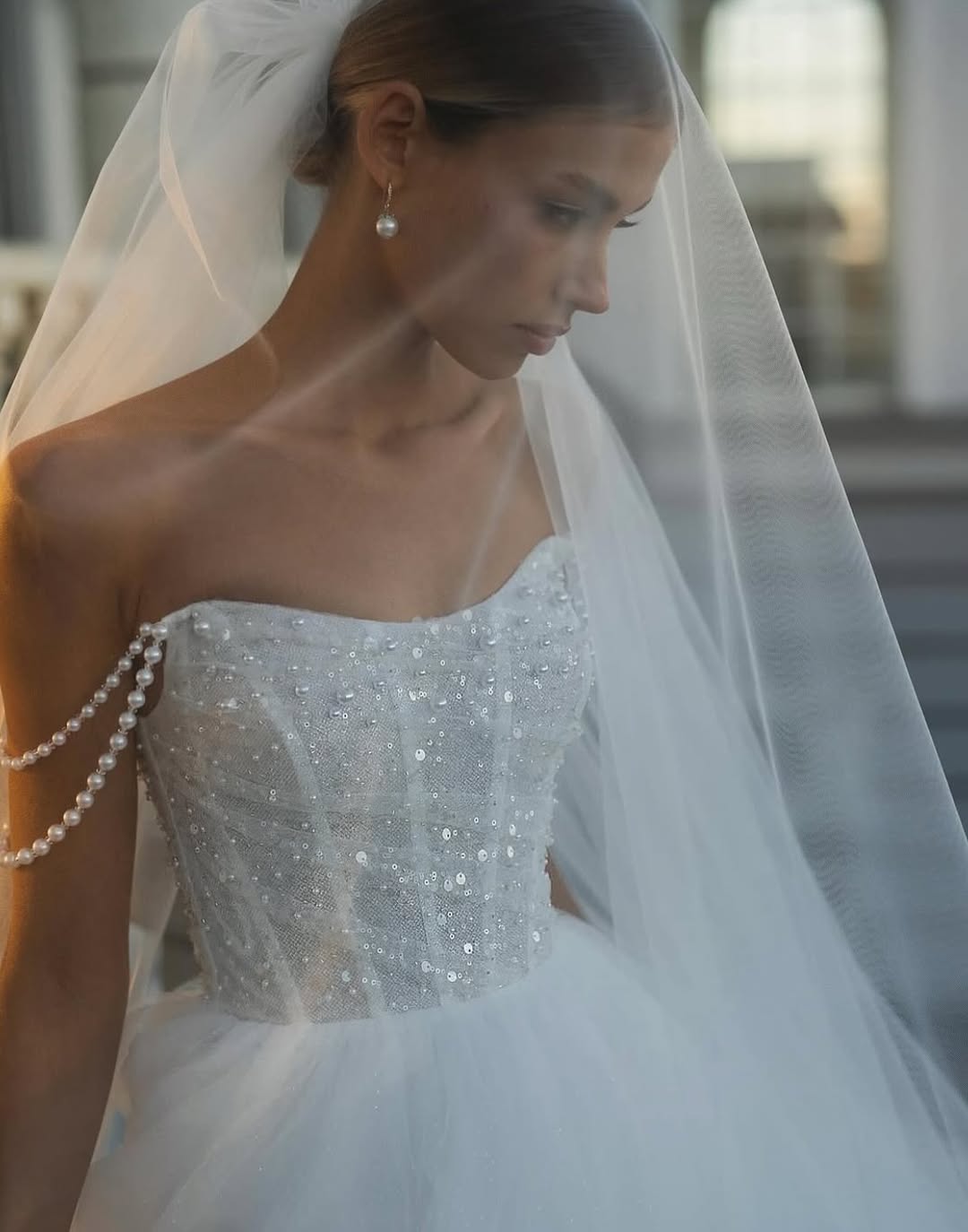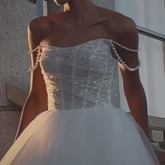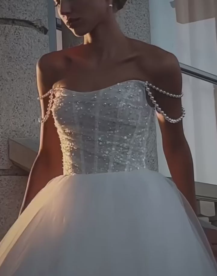 "Feel like a princess in the Lotus Blossom 4851 gown. The corseted bodice accentuates your figure, while strings of pearls add a touch of elegance to the delicate tulle ball gown. With a strapless design, this dress exudes beauty and grace. Perfect for any formal occasion!"