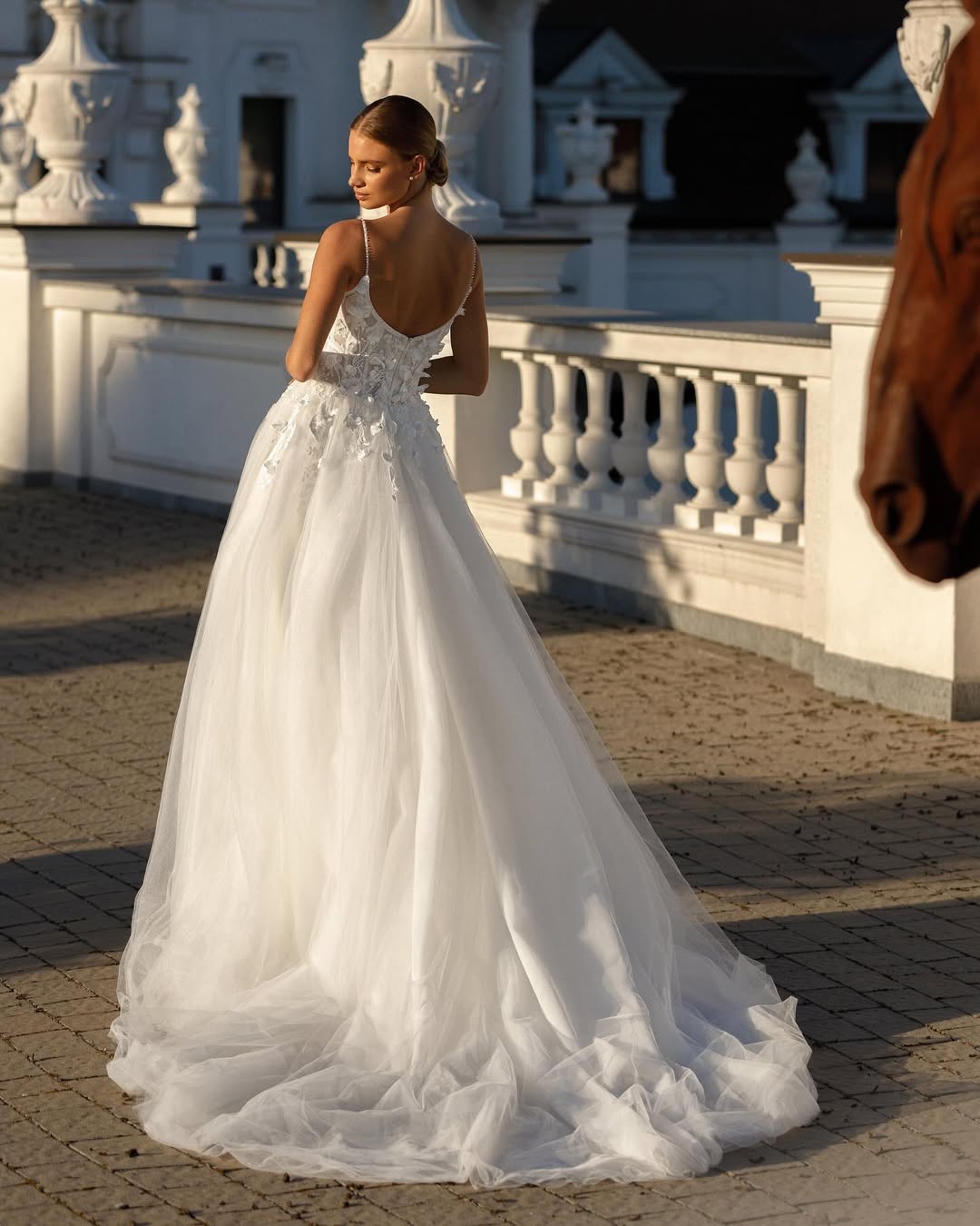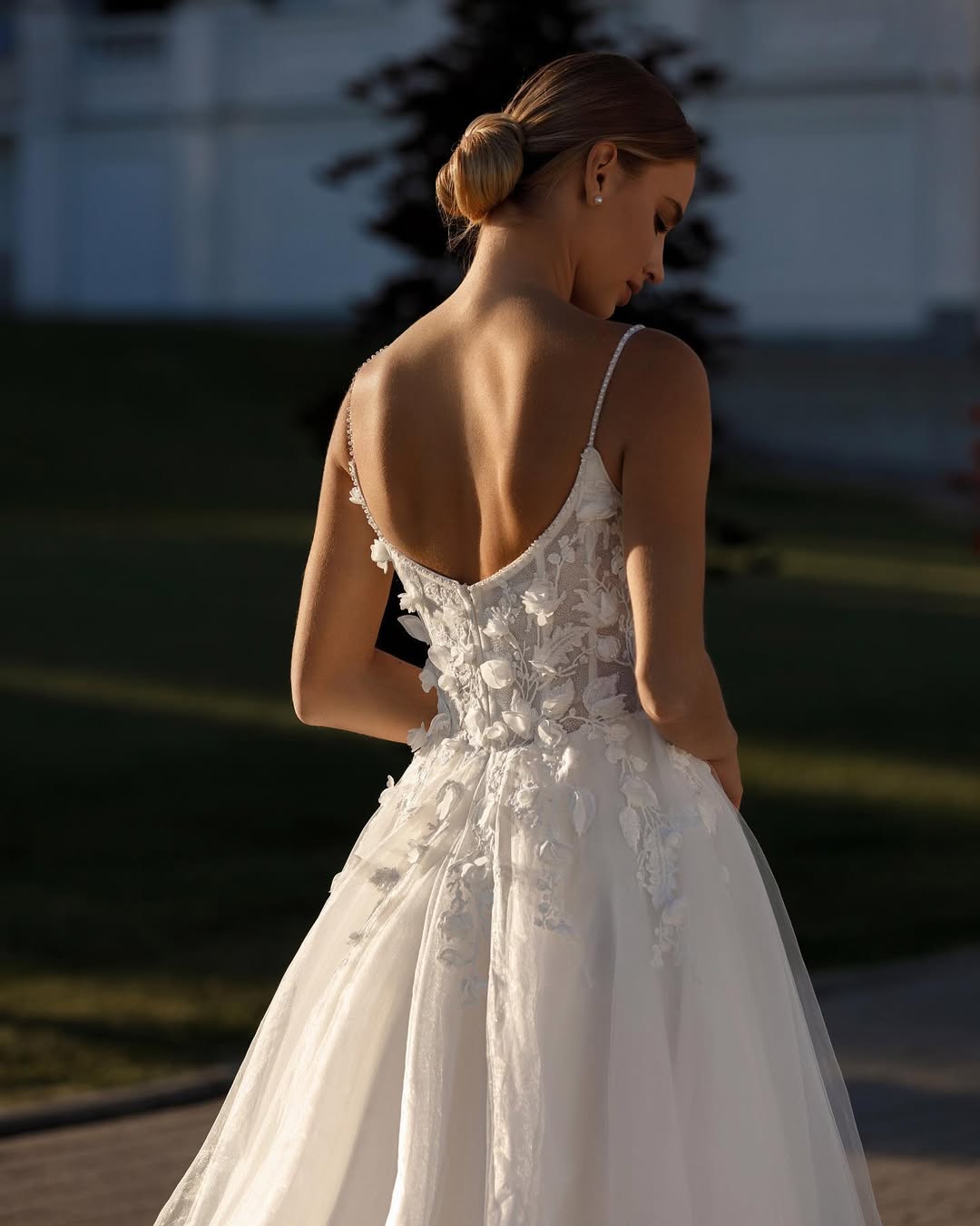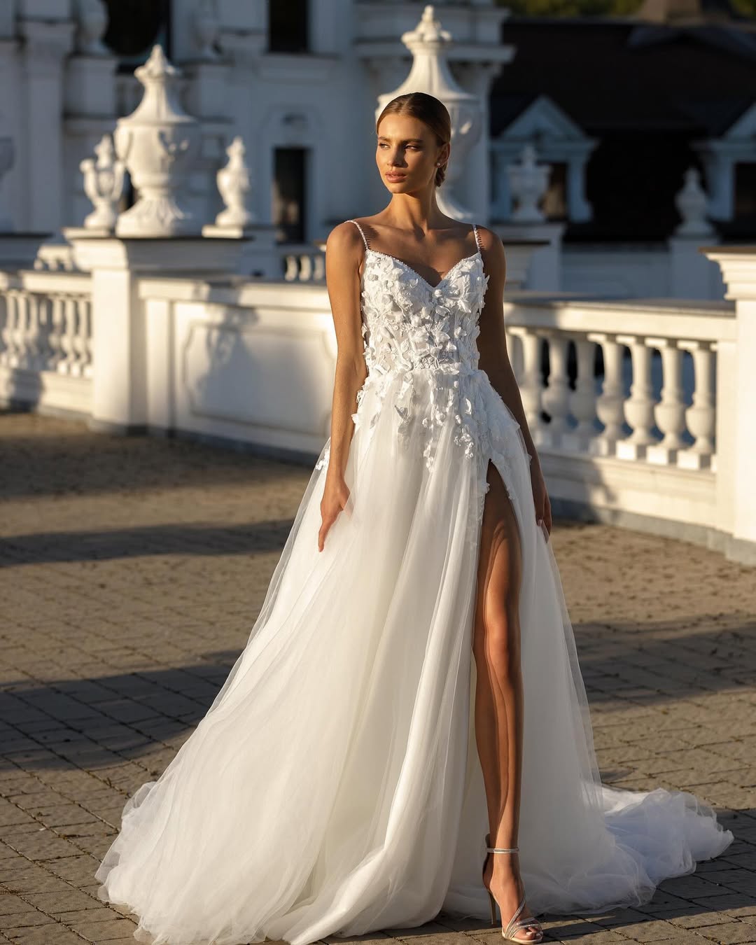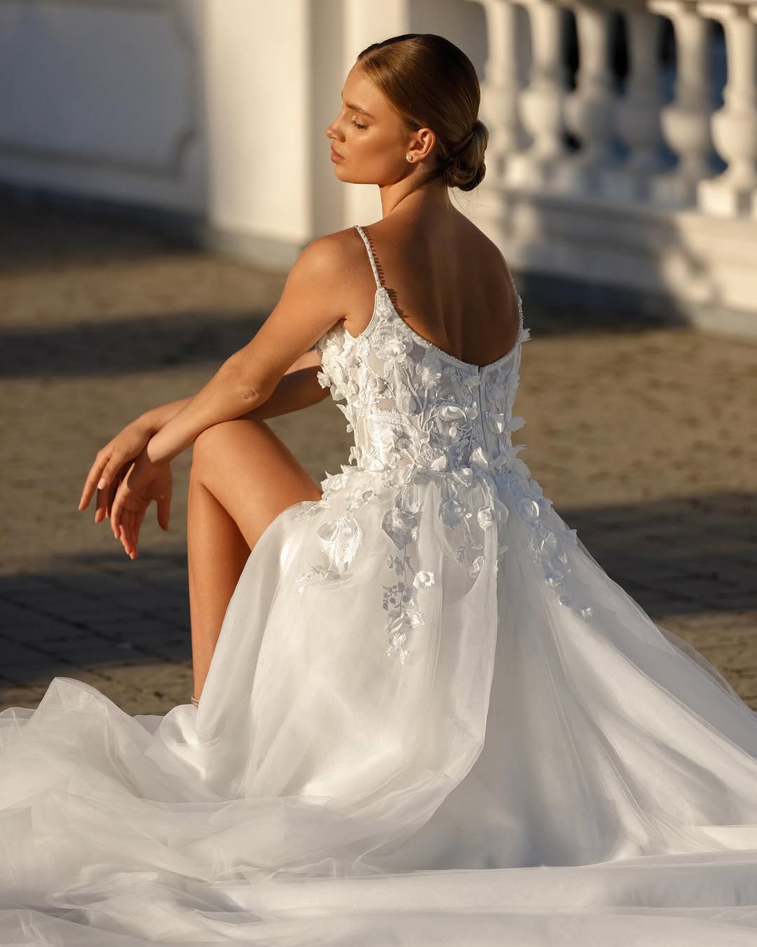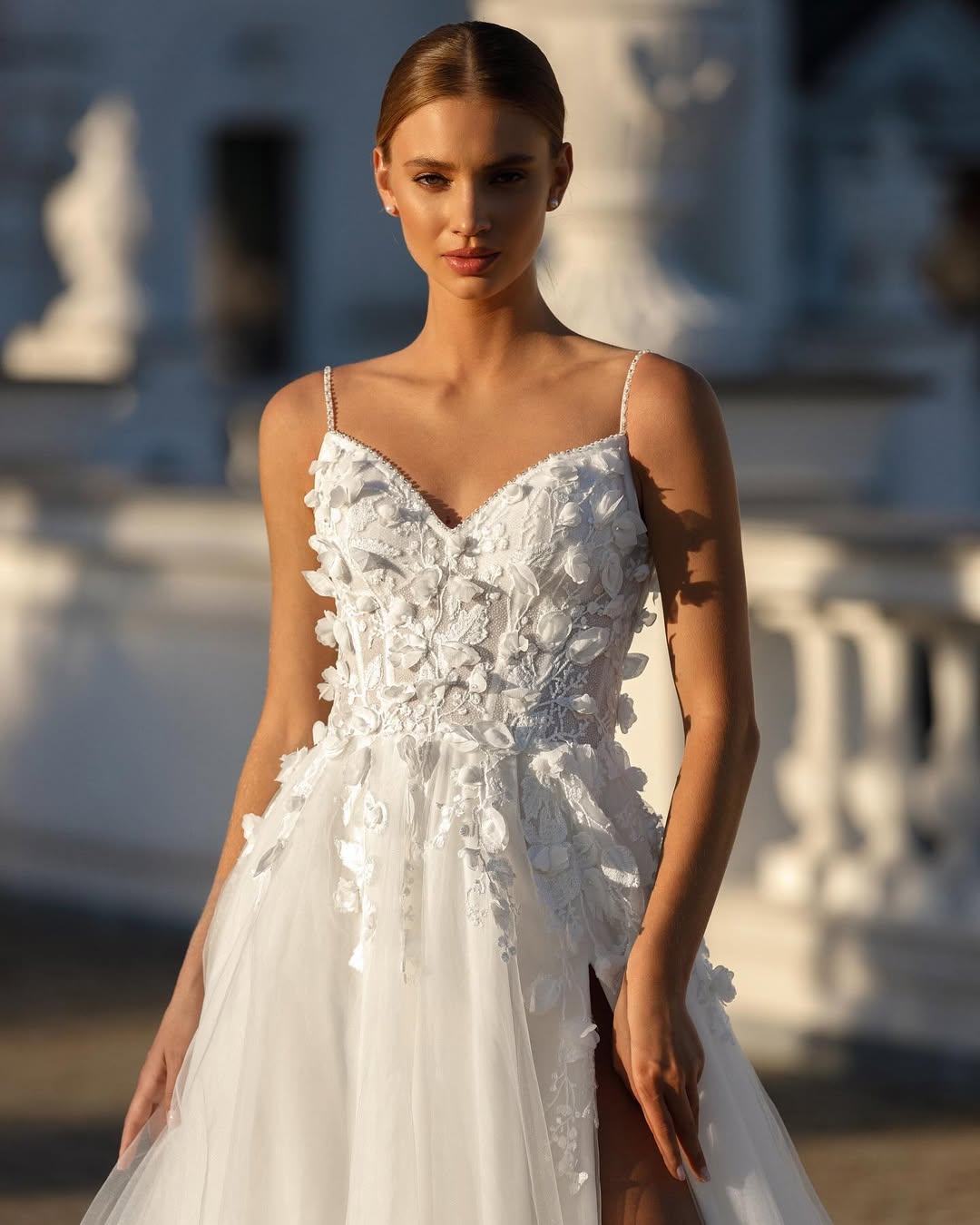 The Madi Lane 0216 features delicate spaghetti straps and a flowing tulle skirt with a high slit, creating a light and airy silhouette perfect for movement. The bodice is adorned with intricate 3D flowers both at the front and back, adding a romantic and textured detail that enhances its elegance. This design combines ethereal beauty with subtle sensuality, making it an exceptional choice for brides seeking a gown that feels as graceful as it looks. Designed to flatter and captivate, the Madi Lane 0216 ensures you will feel stunning on your special day.