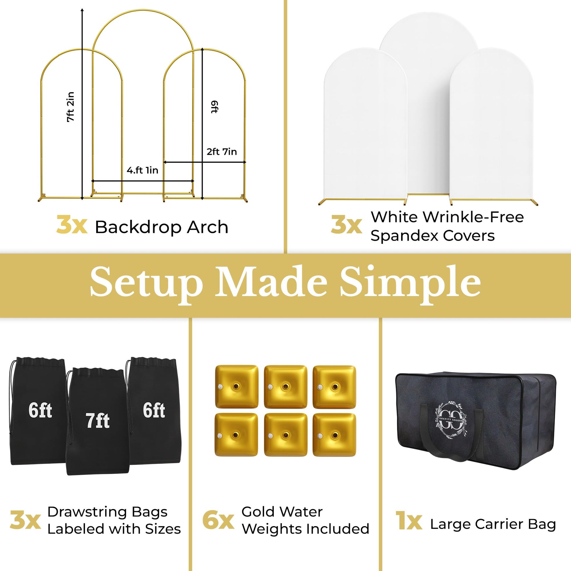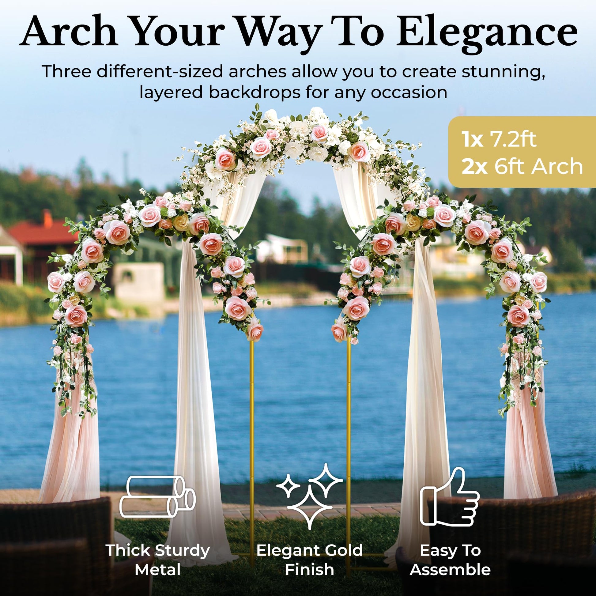 Create a stunning focal point for any event with our Metal Arch Backdrop Stand and Cover Set. This versatile set includes three arches—one 7.2FT and two 6FT—that can be arranged to highlight entrances, frame important areas, or build an impressive multi-tiered display. The included white spandex covers transform the gold metal frames into sleek, photo-ready backdrops instantly. Customize your arches with flowers, greenery, lights, or balloons to perfectly match your theme and leave a lasting impression on your guests. Elevate your celebration effortlessly with this elegant and adaptable backdrop solution.