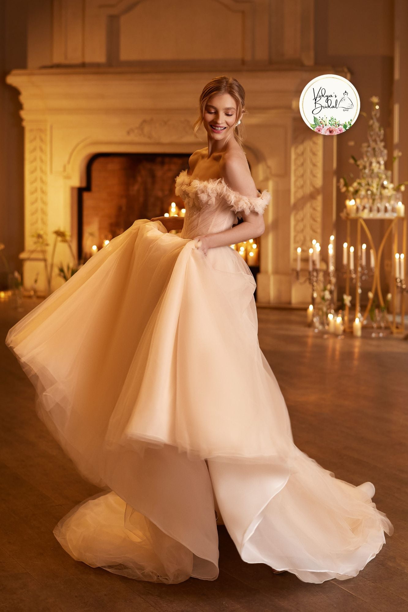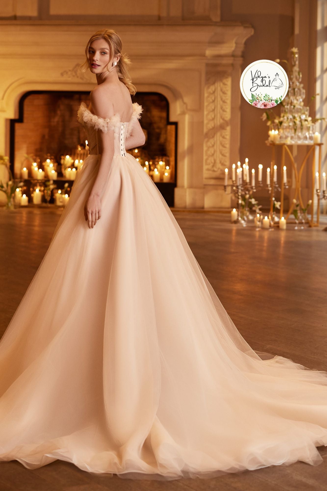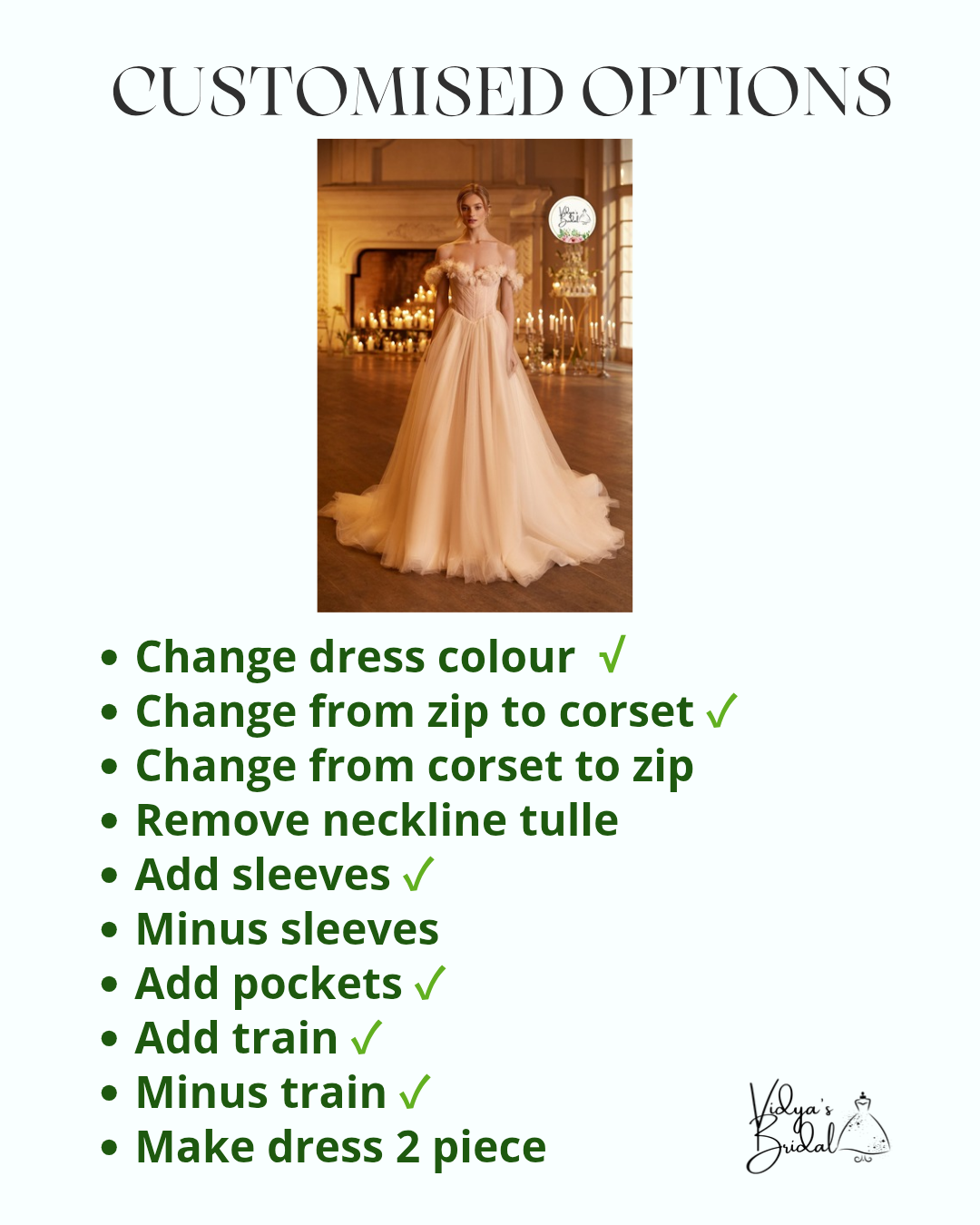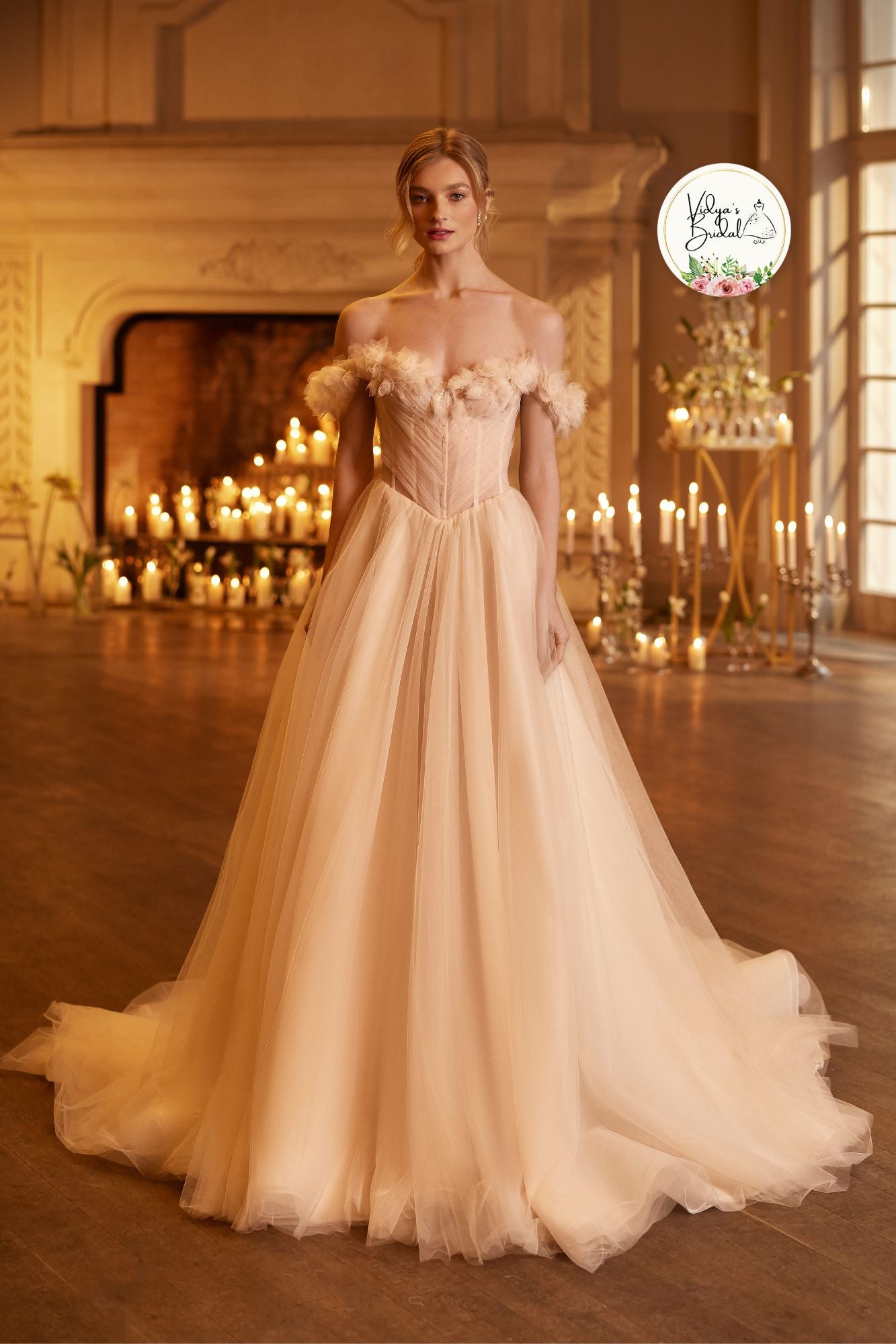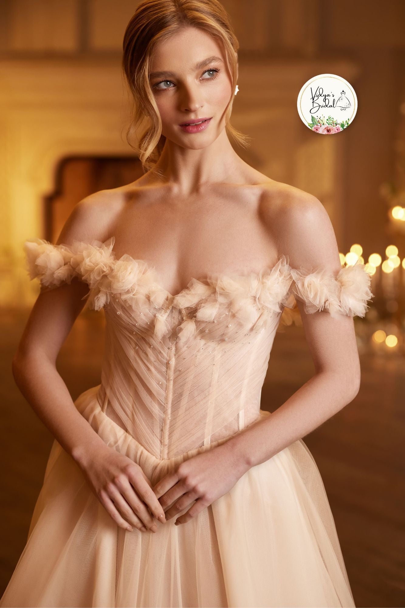 Elevate your presence with the Pasadena gown, designed to embody timeless elegance and refined beauty. This stunning off-shoulder dress showcases a corseted ruched bodice that gracefully sculpts the silhouette, adding a touch of classic charm. The flowing tulle chapel train creates a breathtaking trail that moves effortlessly, complemented by a smooth satin underlining for luxurious comfort and structure. Offered in a variety of captivating colors, Pasadena allows you to express your personal style while radiating sophistication at any special occasion. Make a memorable statement with this exquisite gown that seamlessly blends grace and allure.
