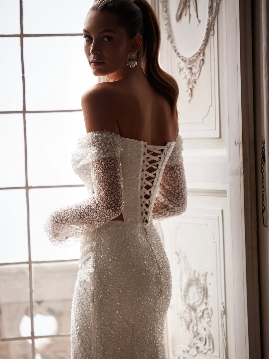 Indulge in the opulence of our Petals of Love WD 001. This beautiful off-shoulder gown features a daring slit and sparkling glitter details, perfect for the minimal bride looking to make a statement on her wedding day. With a custom design and impeccable fit, you'll shine and feel like royalty.