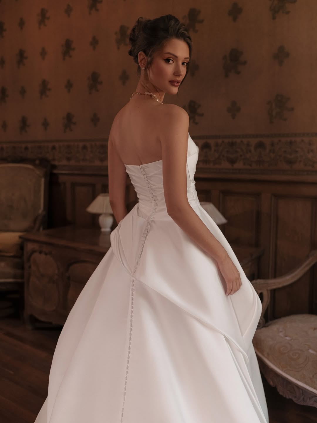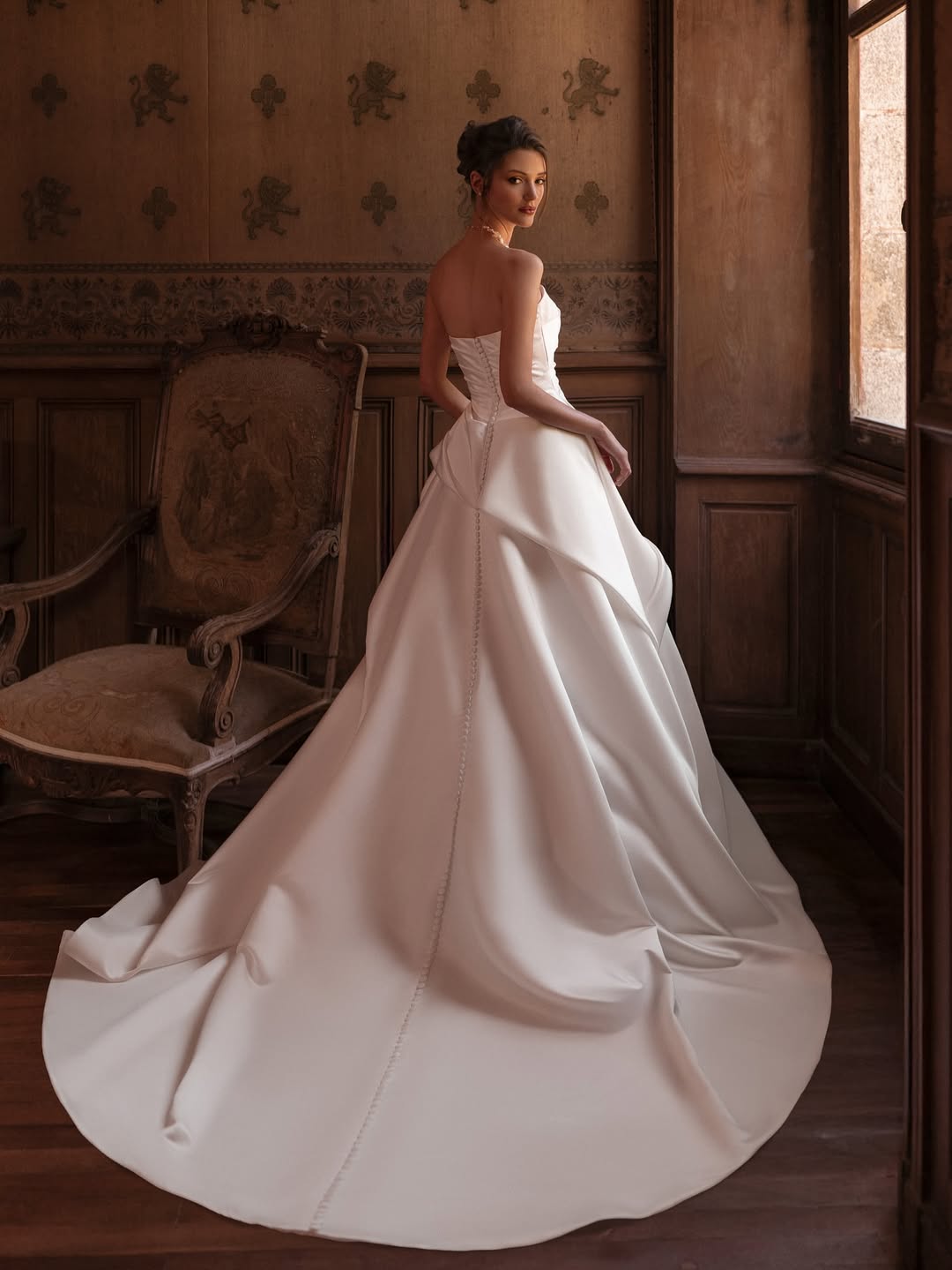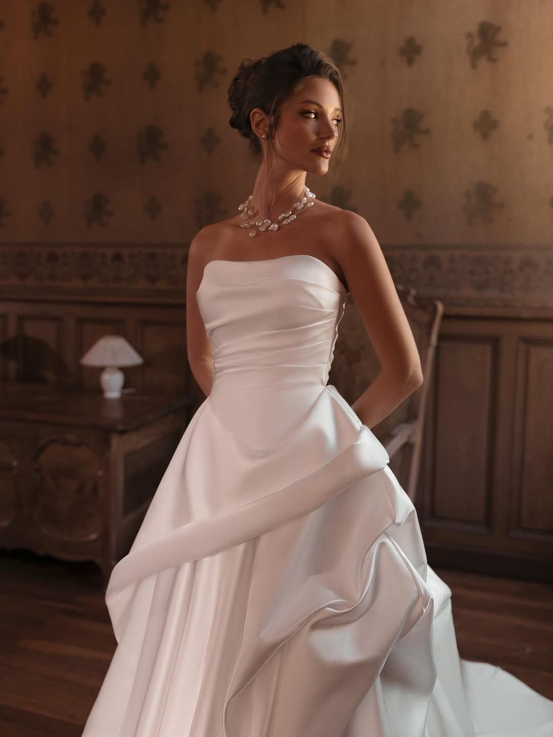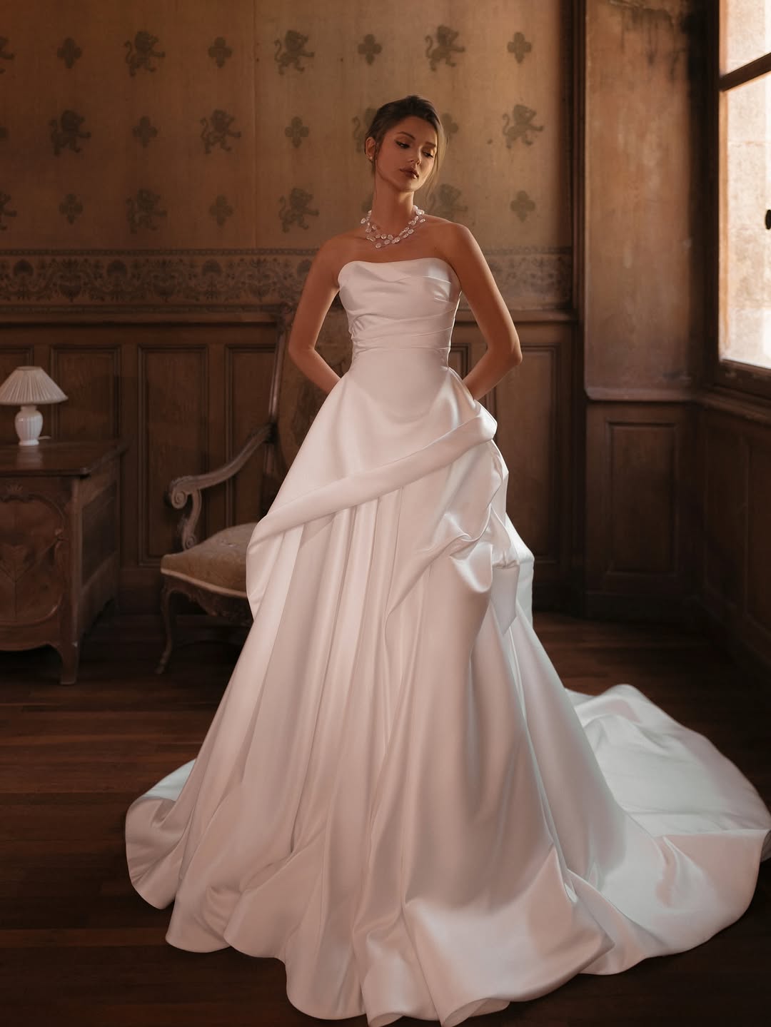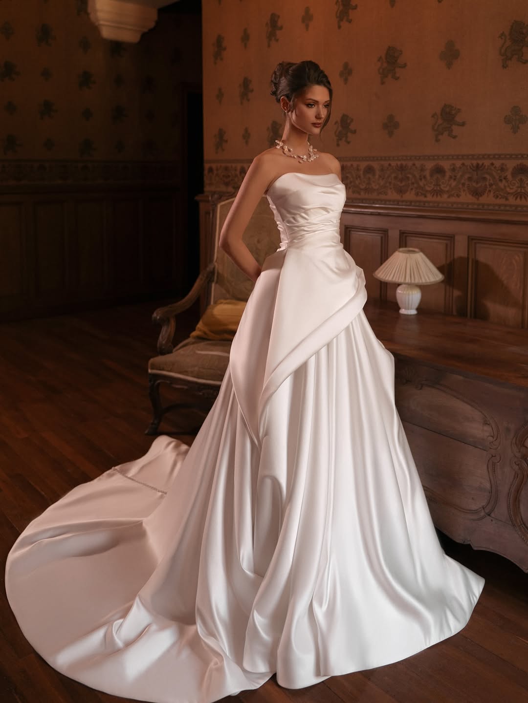 Indulge in the graceful elegance of Petals of Love (WD 003). With its ruched and gathered detailing, this strapless satin gown molds to your curves for a sleek silhouette. The full, flattering skirt adds a touch of romance to any occasion.