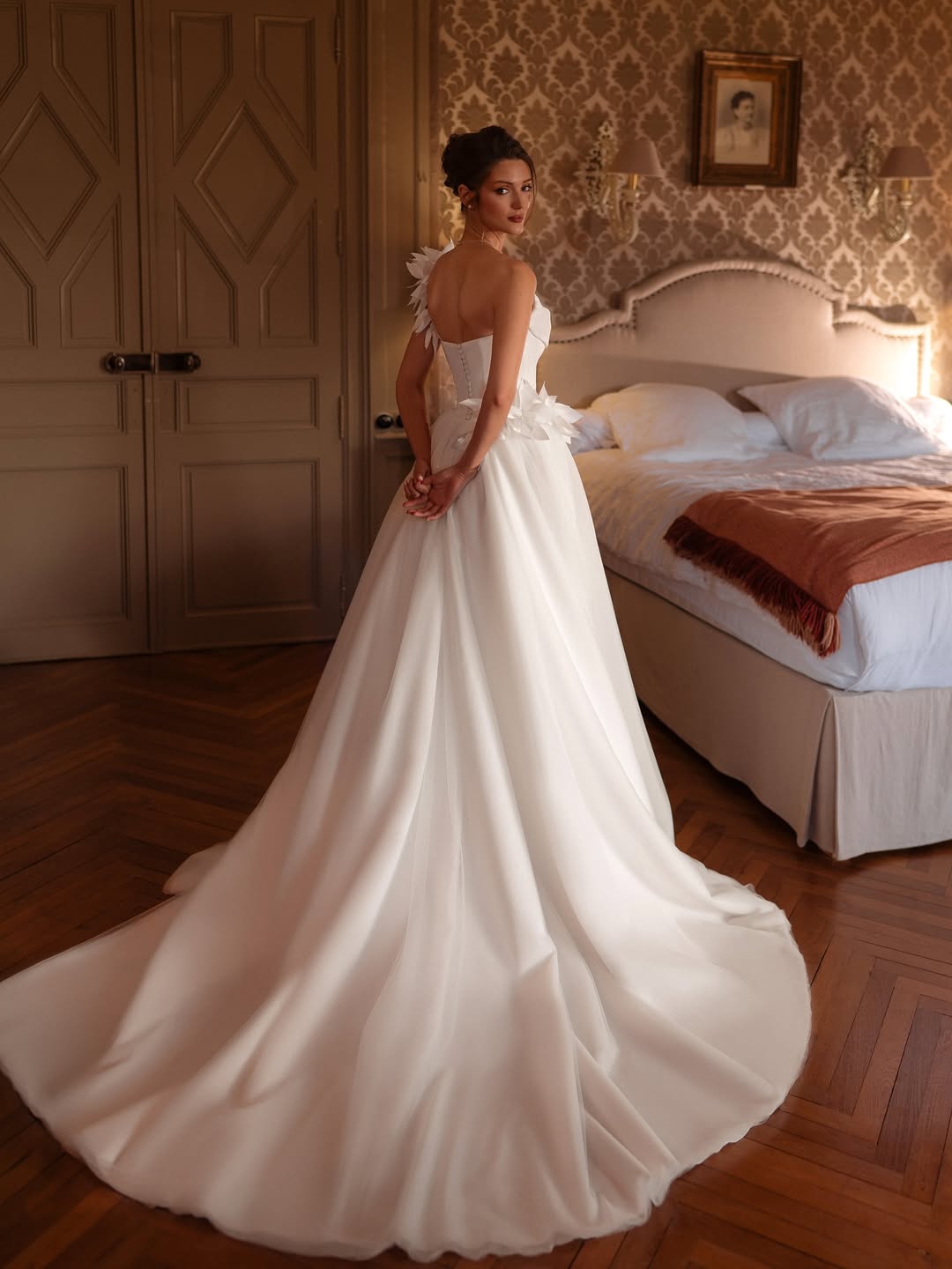 Indulge in the ethereal look of Petals of Love! The semi ballgown silhouette and one side strap create a goddess-like presence, while the tulle fabric adds a touch of gracefulness. Envelop yourself in this dress and be swept away by its beauty.