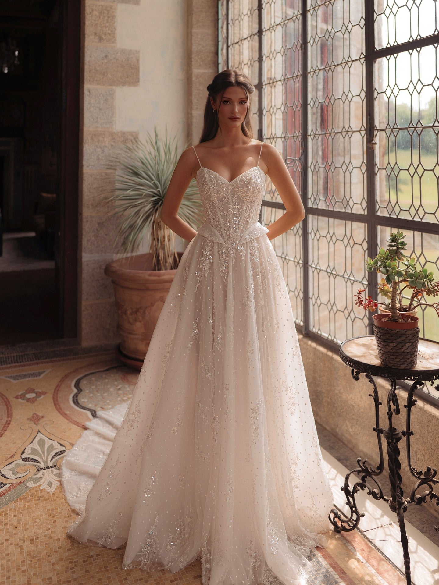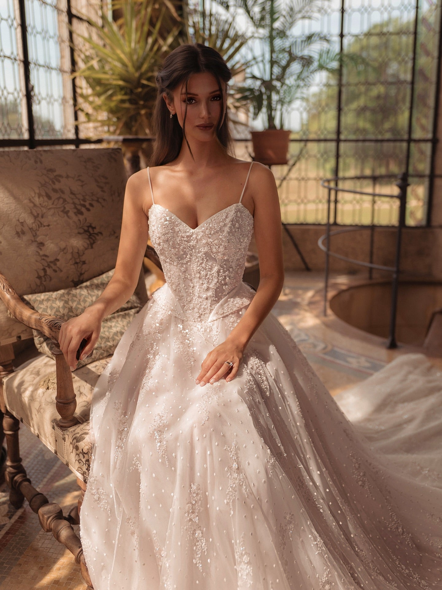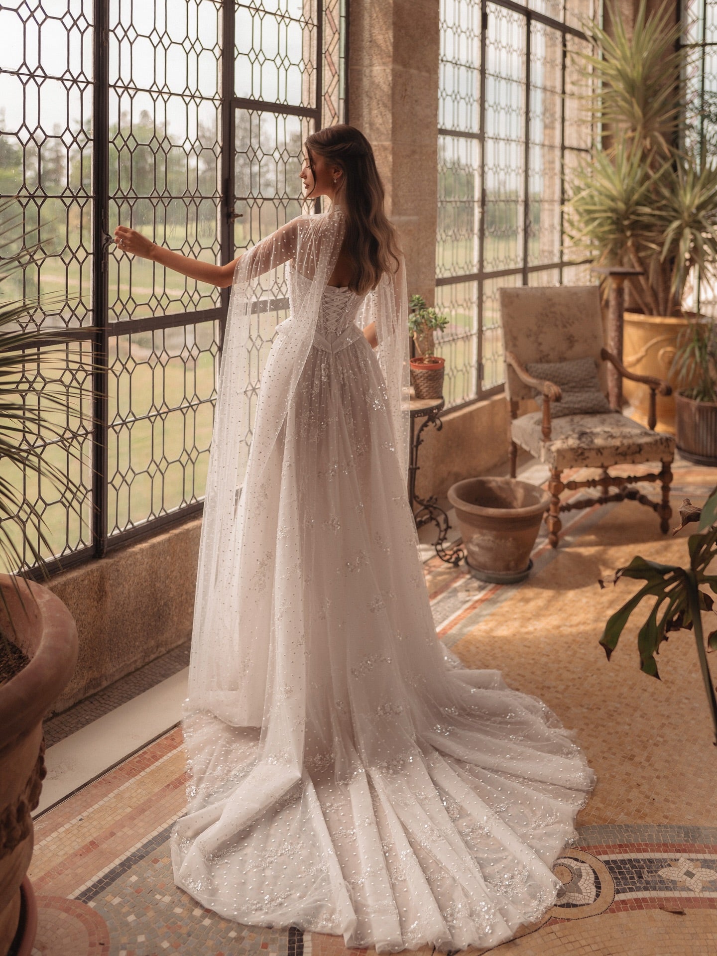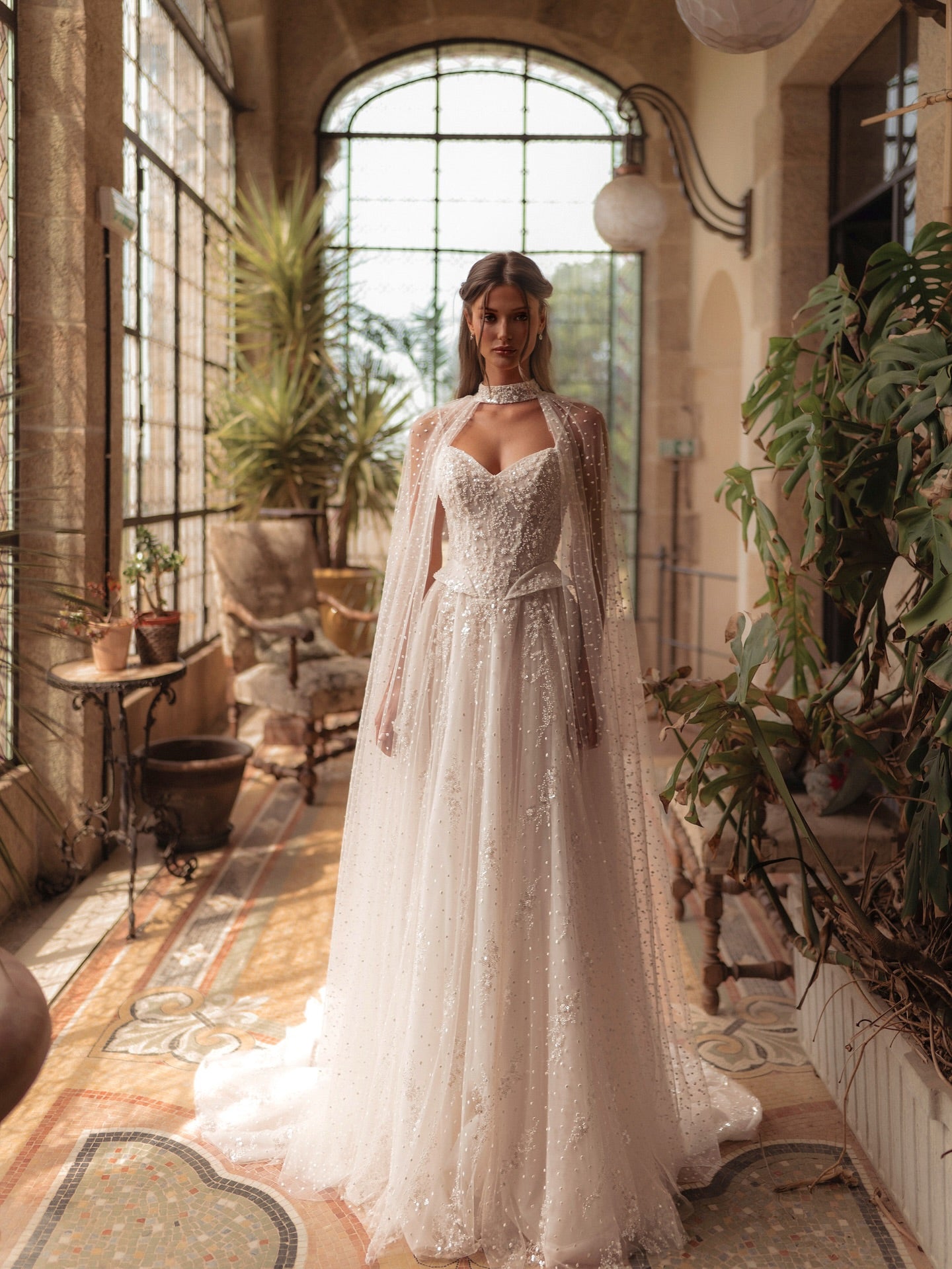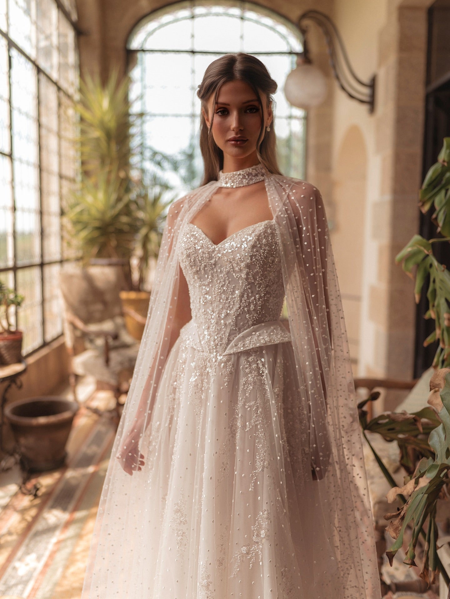 Introducing Petals of Love - a captivating choker neck removable cape, paired with a delicate spaghetti strap and intricate Victorian waistline. Adorned with exquisite applique and a dotted fabric, this luxurious design will leave you feeling truly enchanting. (WD 006)
