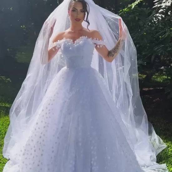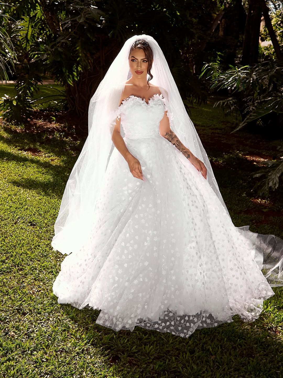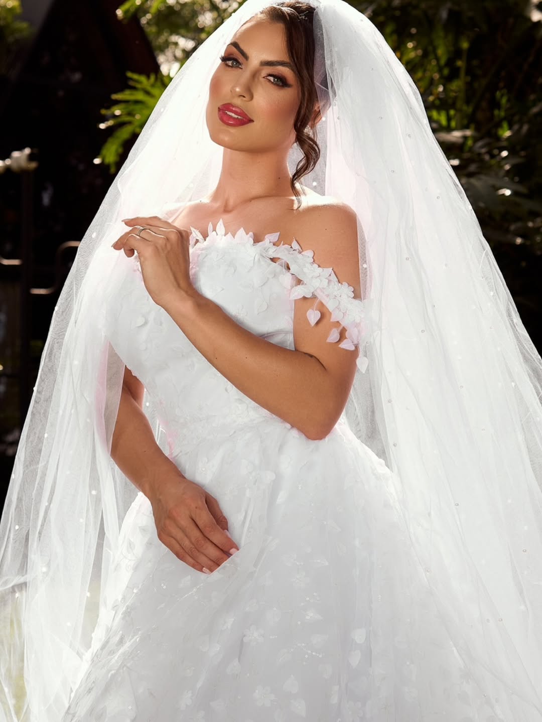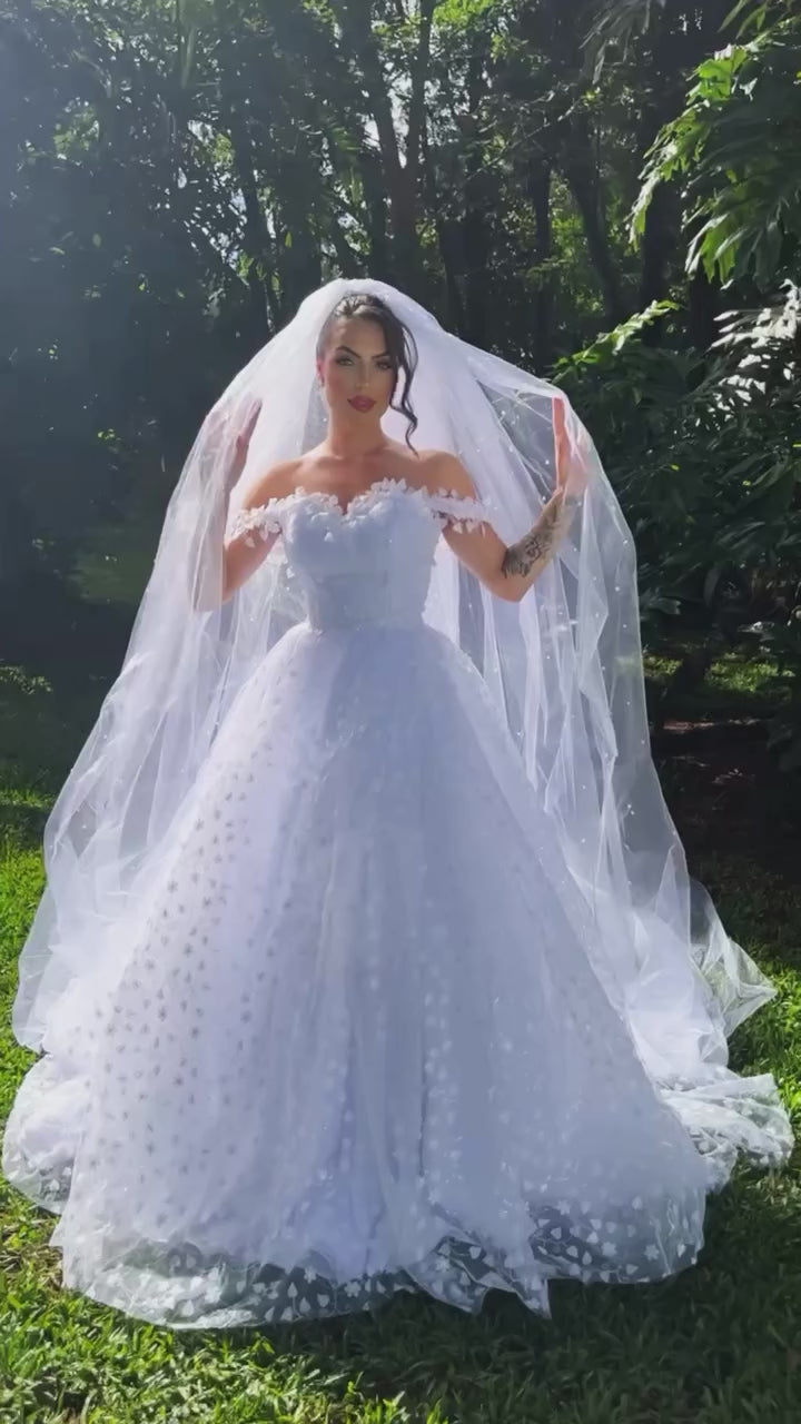 Indulge in pure elegance with Petals of Love (WD 009) - The timeless white color and delicate floral pattern are complemented by an off-the-shoulder design, exuding modernity and whimsy. Crafted with exquisite details and a dreamy veil, this dress will make you feel like a true princess on your special day. Radiate luxury and beauty with Petals of Love.