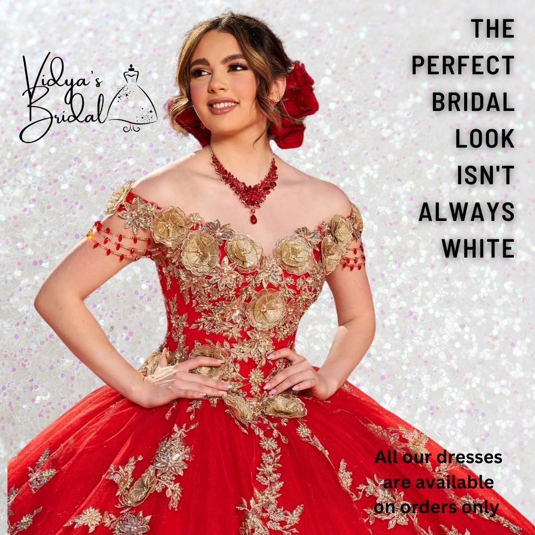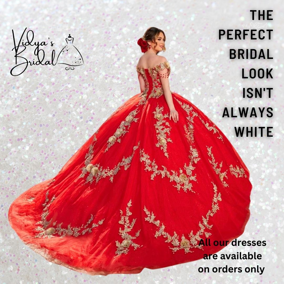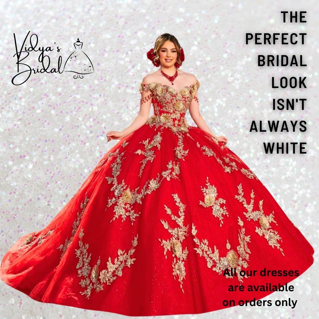 This princess-style ballgown, exquisitely crafted with three-dimensional floral appliqués and gold accents, evokes a regal aesthetic. Included is a petticoat, and a variety of color options are available.