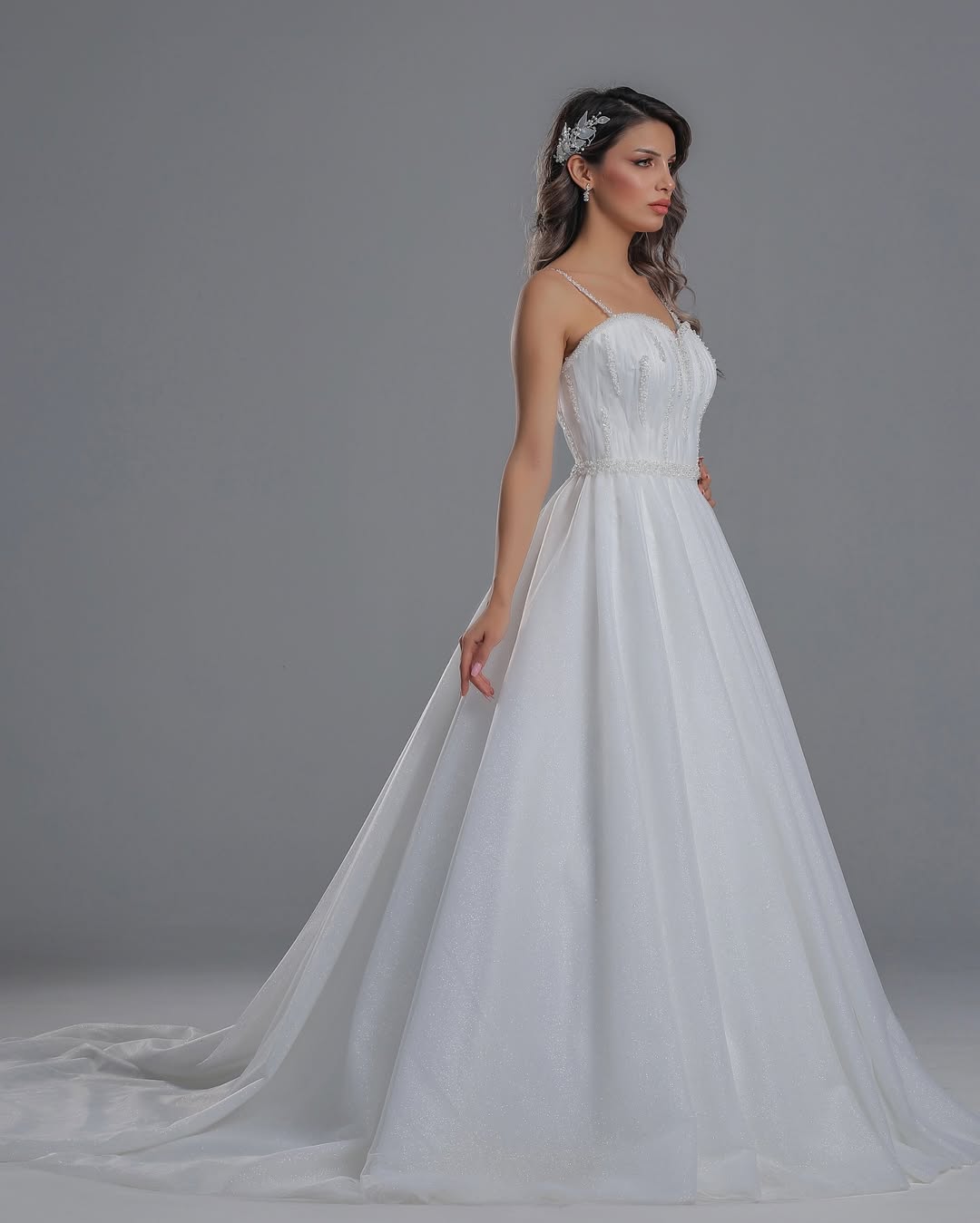 *Style and Fabric:* The dress is a classic A-line wedding gown made from a lightweight, chiffon fabric. The skirt is full and flowing, with a subtle sheen that catches the light.