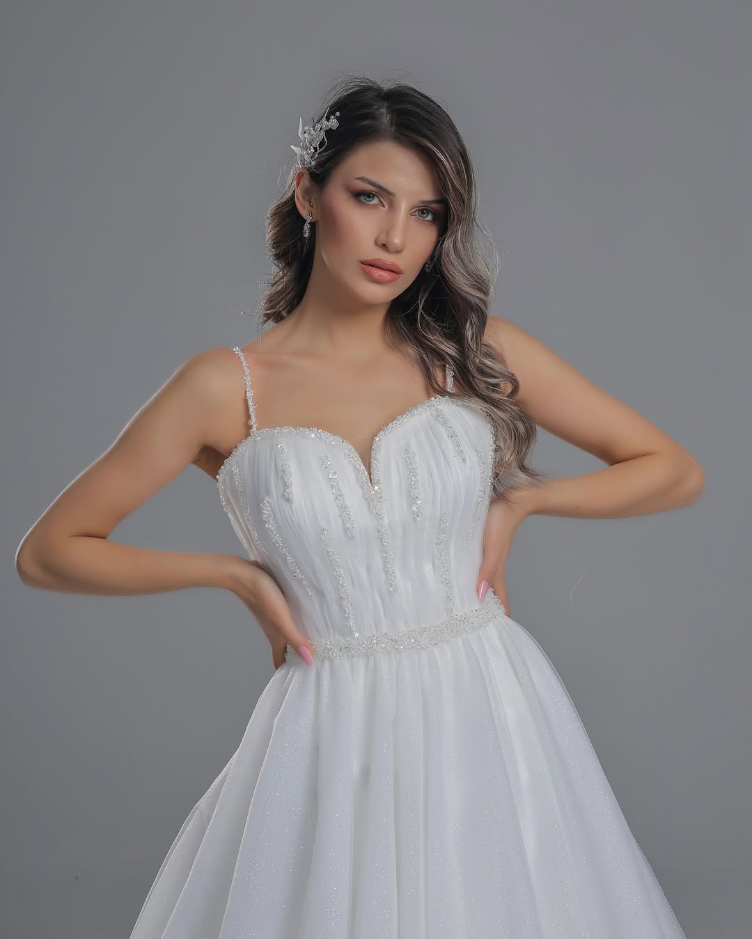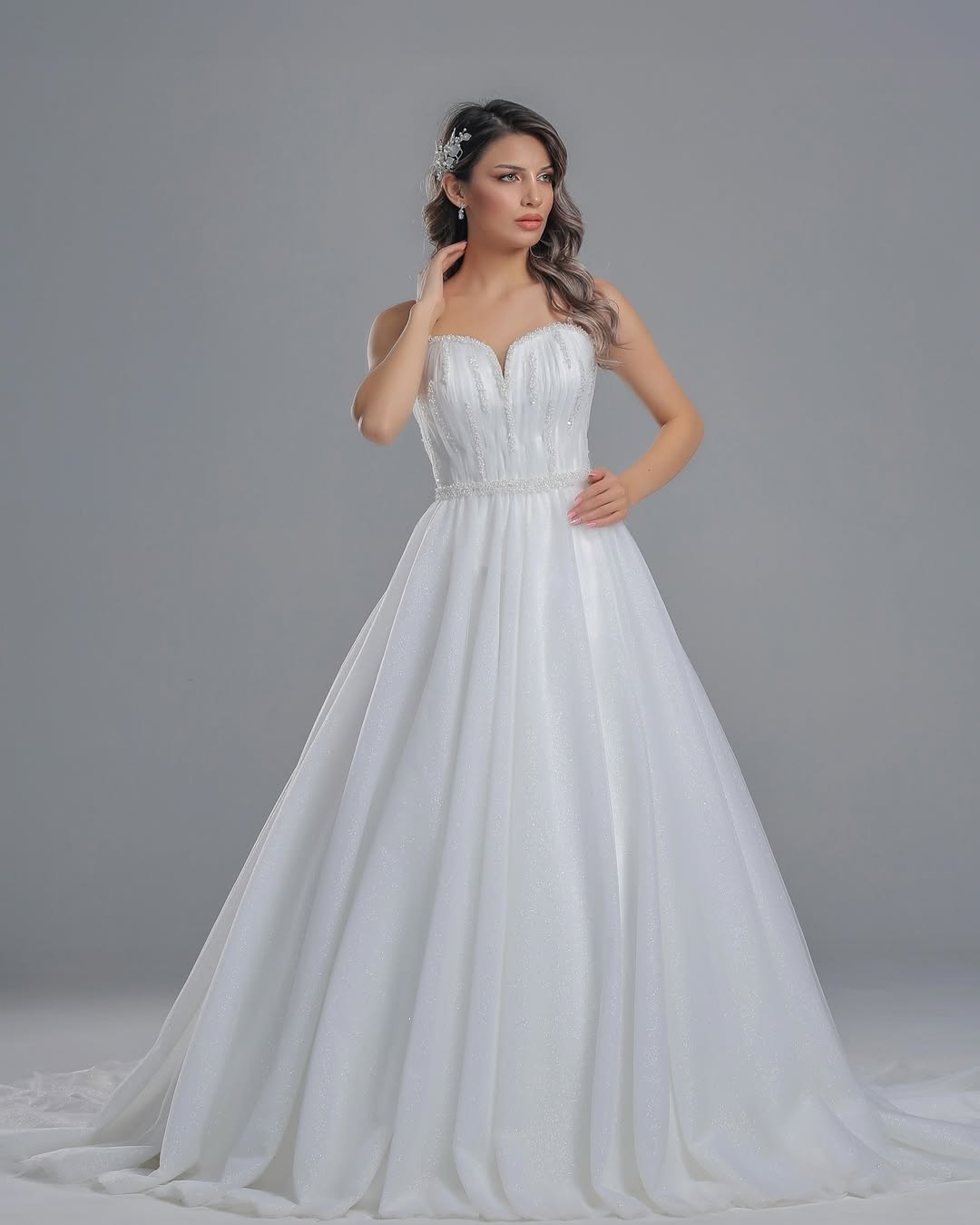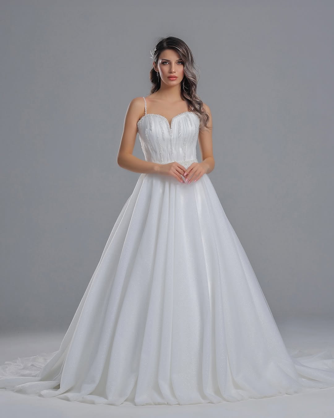 The bodice is fitted, showcasing the model's slender figure, and is adorned with intricate beading or embroidery . Rose 11 exudes classic elegance and sophistication, making it perfect for a bride looking for a timeless, romantic look on her special day. The combination of the sweetheart neckline, fitted bodice, and flowing skirt creates a stunning silhouette that is sure to turn heads.