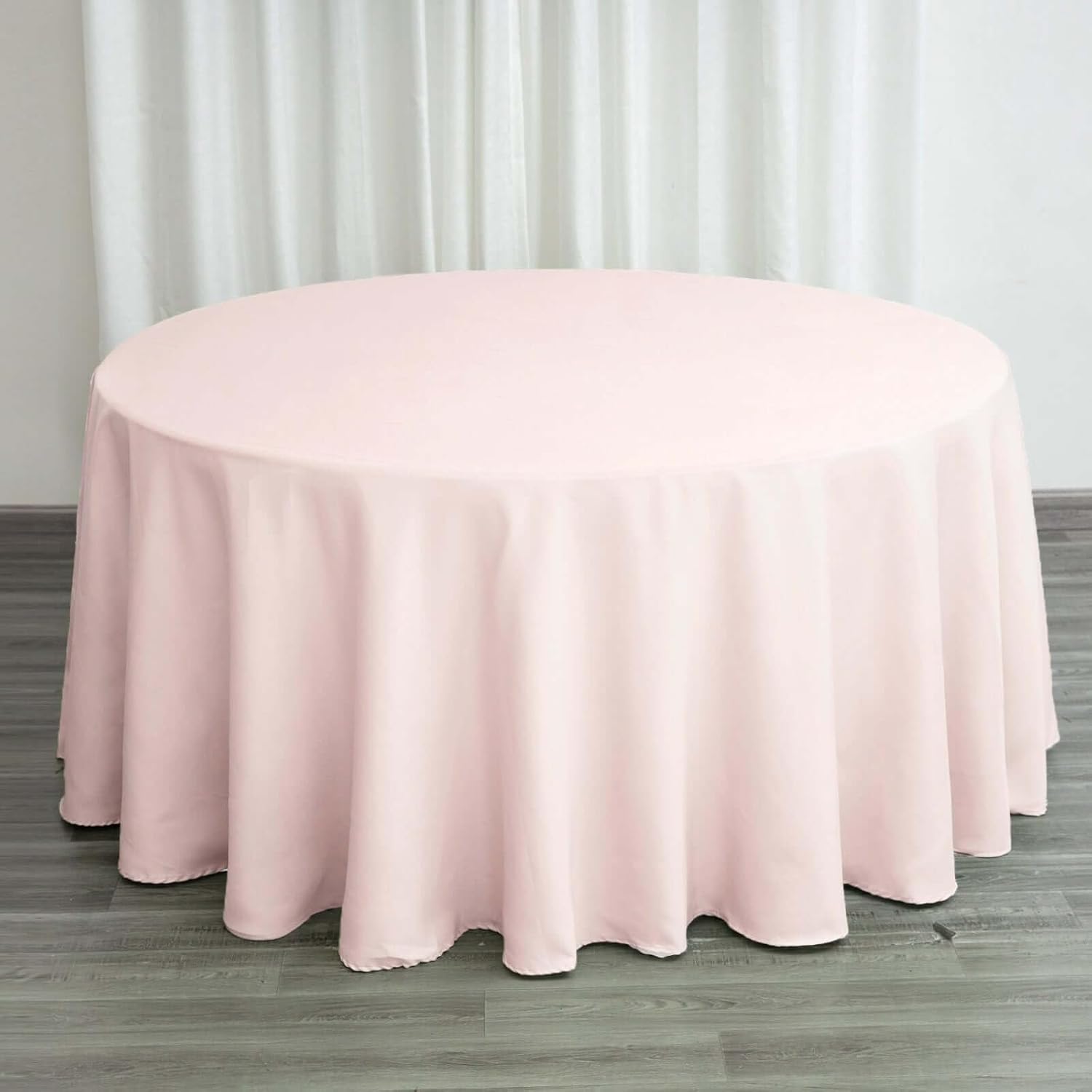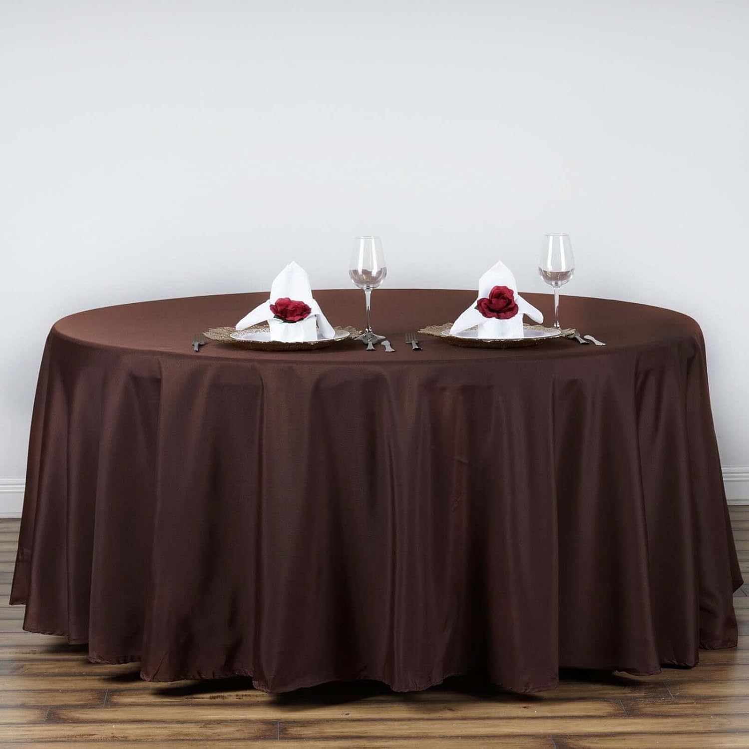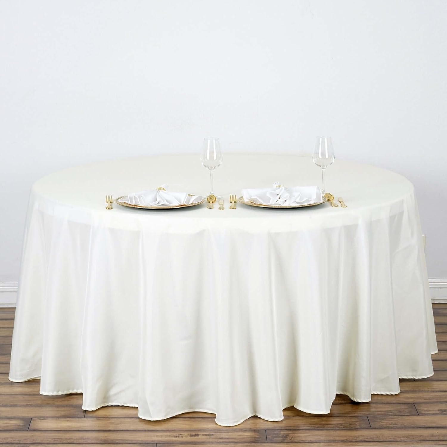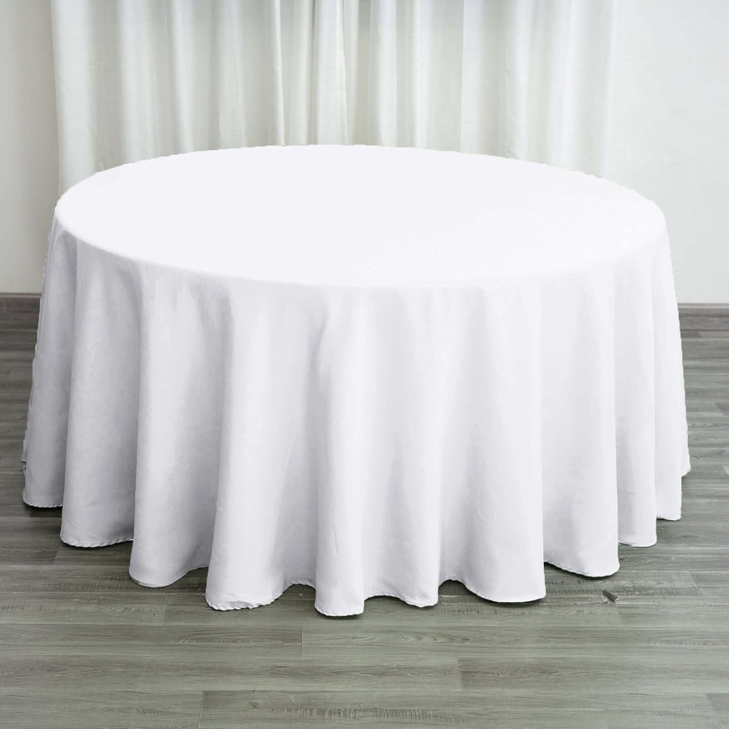 - This round tablecloth is made from 100% premium polyester with a 150 GSM weight, offering a smooth and durable texture. Measuring 120 inches in diameter, it features a seamless, one-piece design for a sleek appearance. The lustrous fabric is finely hemmed with attention to detail, adding a sophisticated touch to any dining setting. Ideal for both special occasions and daily use, it enhances your table's elegance with a contemporary, polished finish.