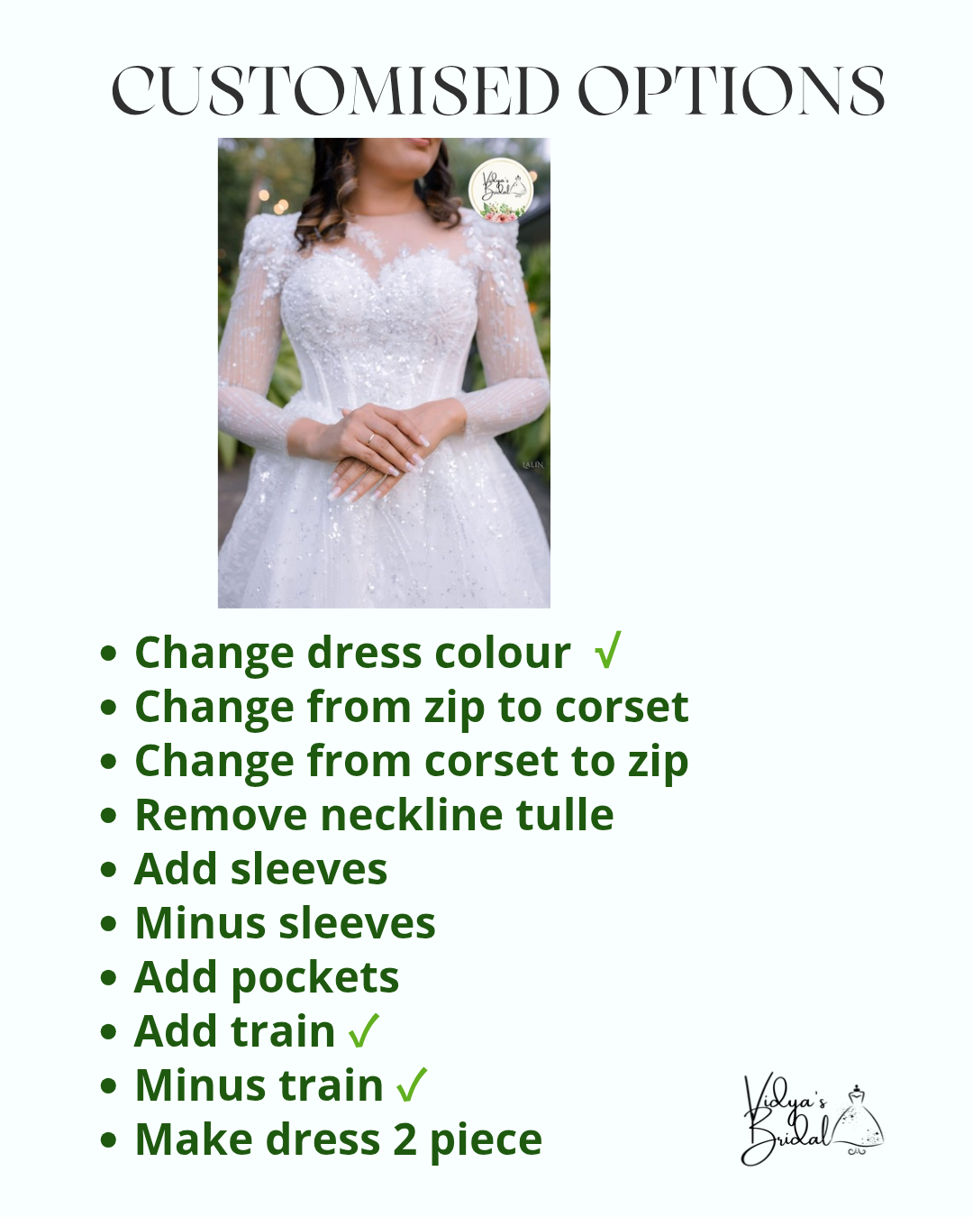 Perfect for garden weddings, twilight ceremonies, or dreamy outdoor venues, this gown makes you feel as though you’ve stepped out of a fairytale — soft, feminine, and unforgettable.