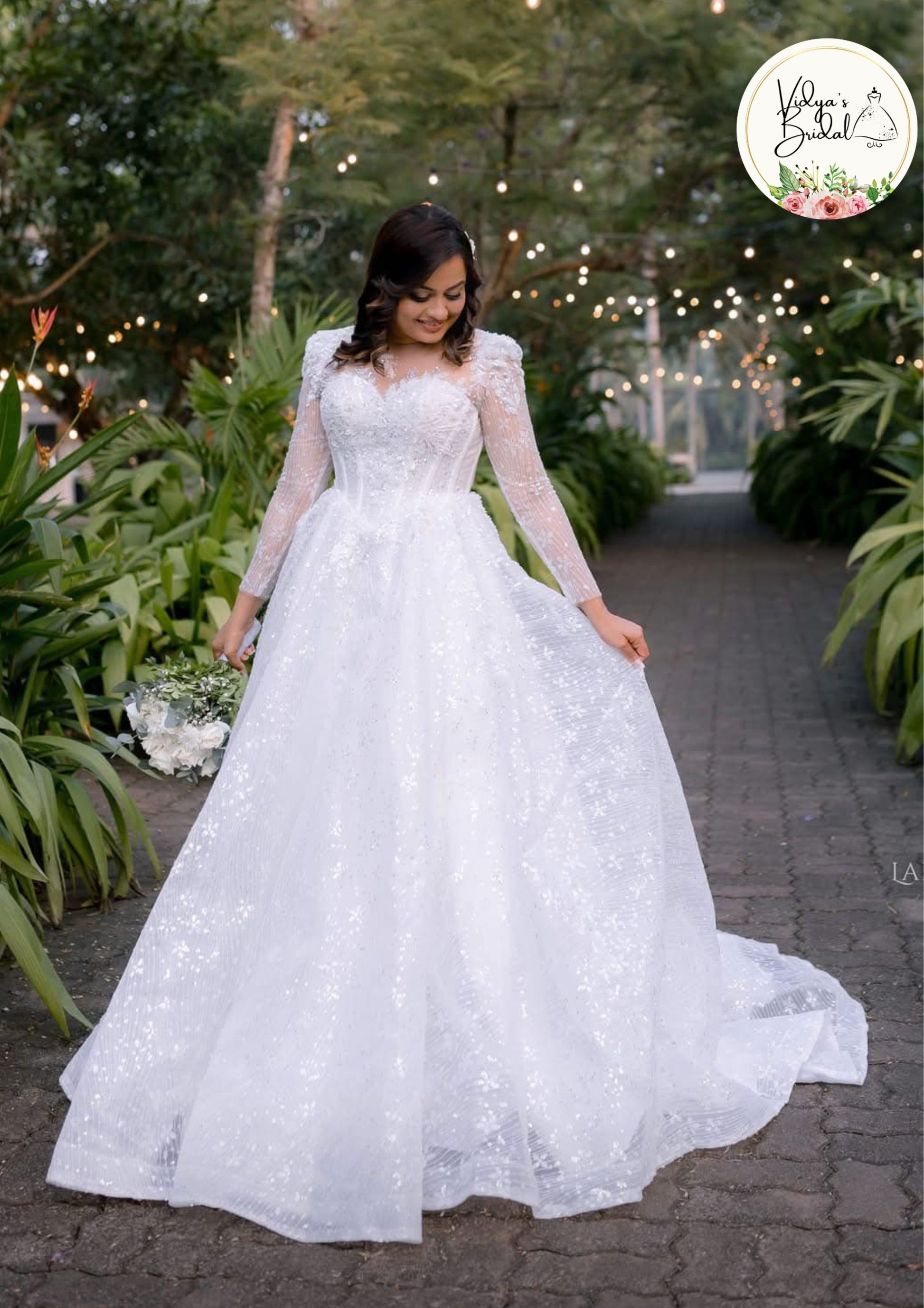 Elegant sheer long sleeves add a touch of timeless charm while maintaining modern sophistication, decorated with a cascade of embroidered patterns and sparkling beads that mirror the gown’s bodice. The corset-style waist subtly sculpts the silhouette, offering a flattering and romantic shape that flows into a voluminous skirt, rich with soft textures and light-catching sequins.