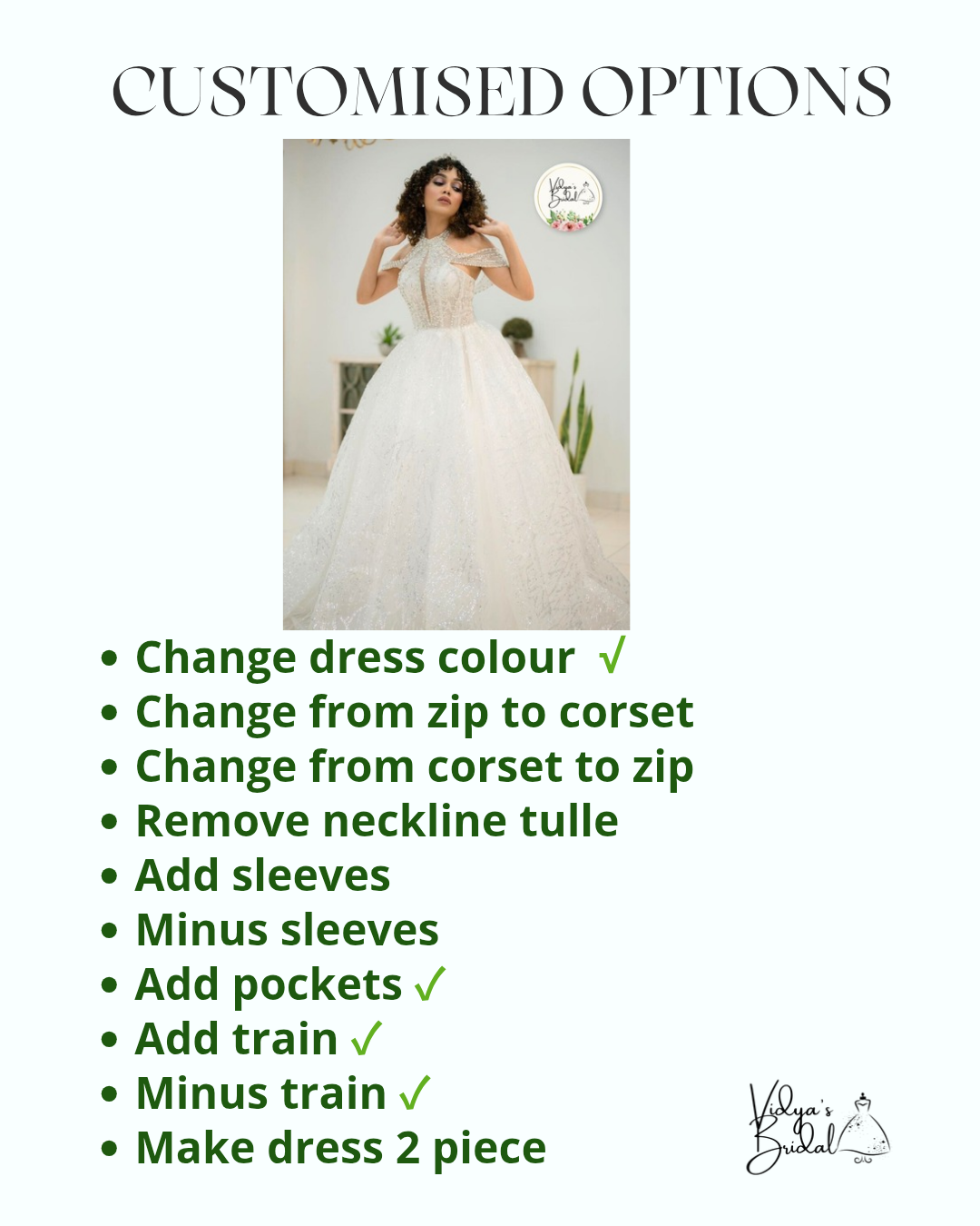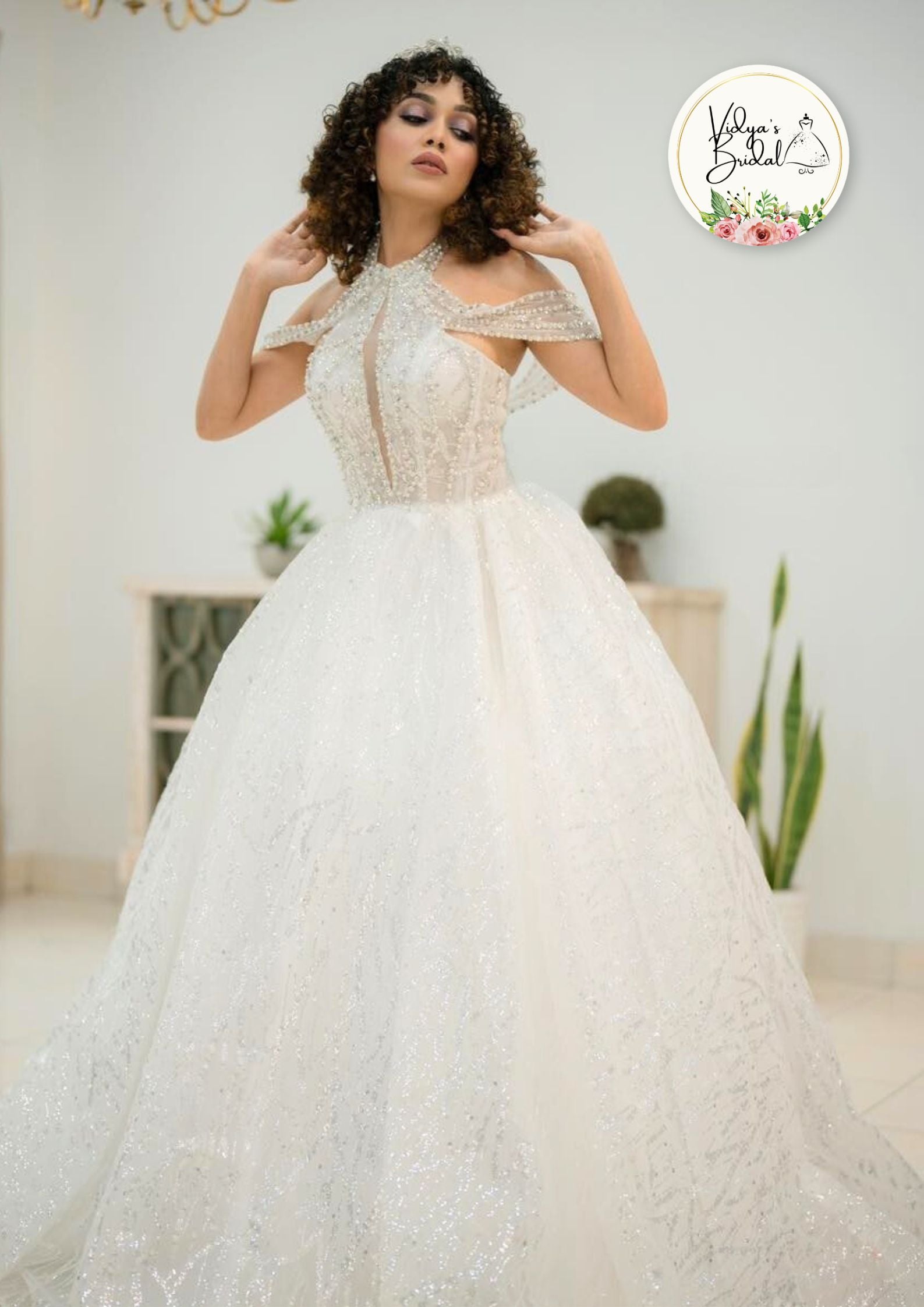 The voluminous skirt, crafted from layers of glitter tulle and soft fabric, flows into a dreamy silhouette that gives you that iconic bridal presence from the first step down the aisle. Every angle of this gown sparkles subtly, like a thousand stars stitched into fabric — ensuring all eyes will be on you.