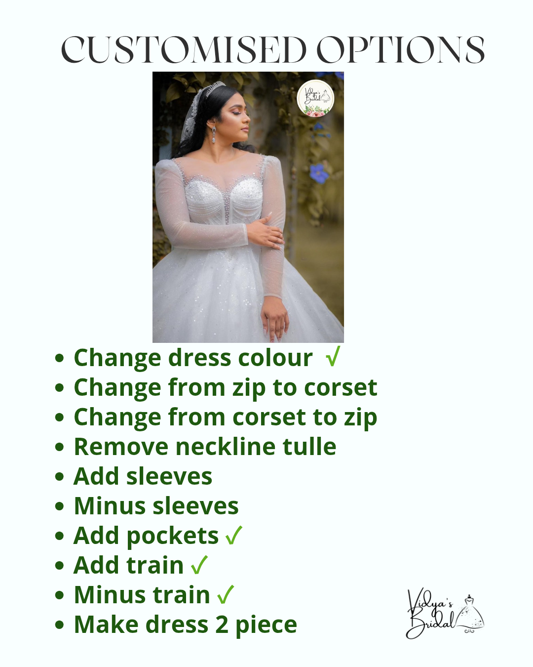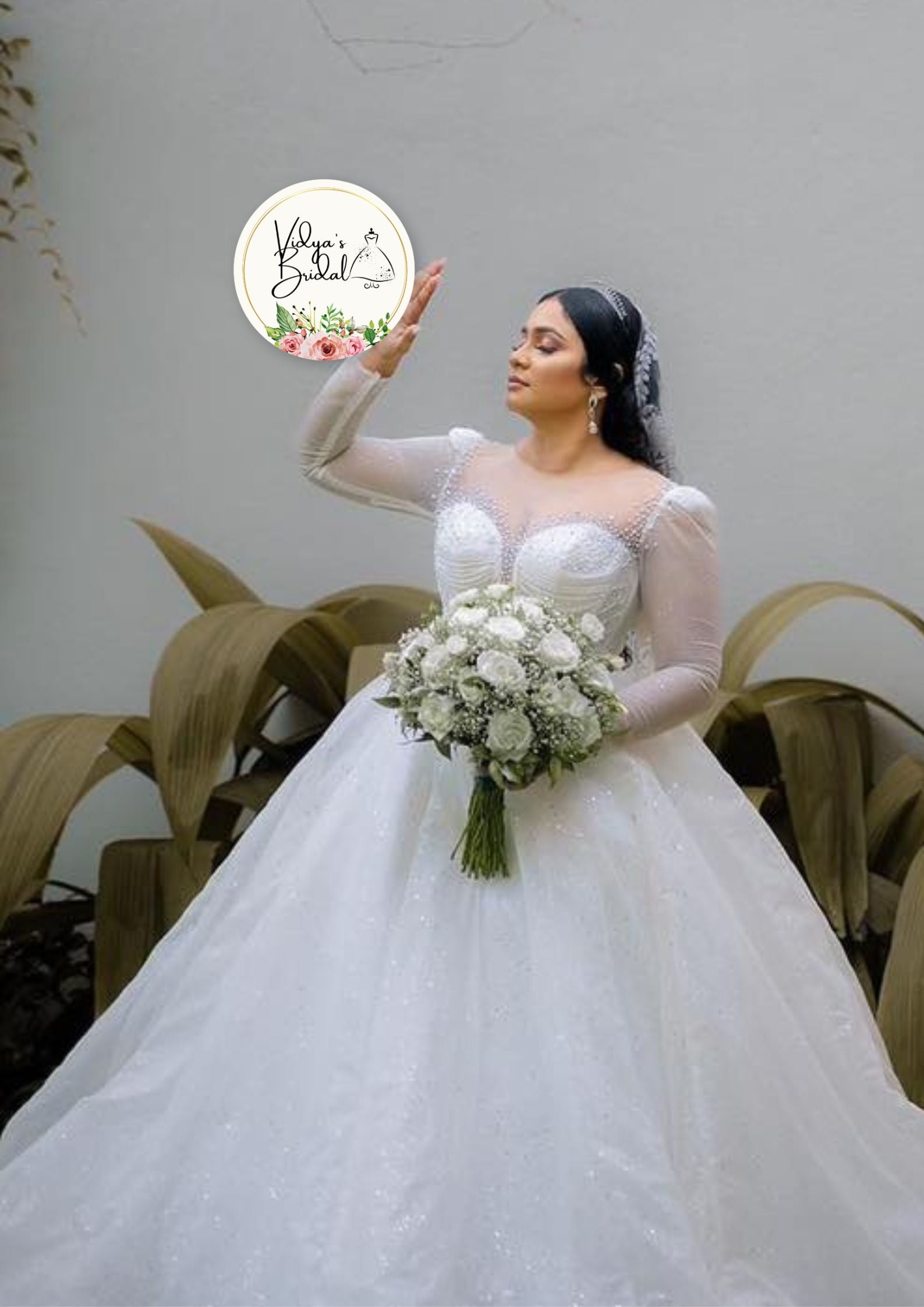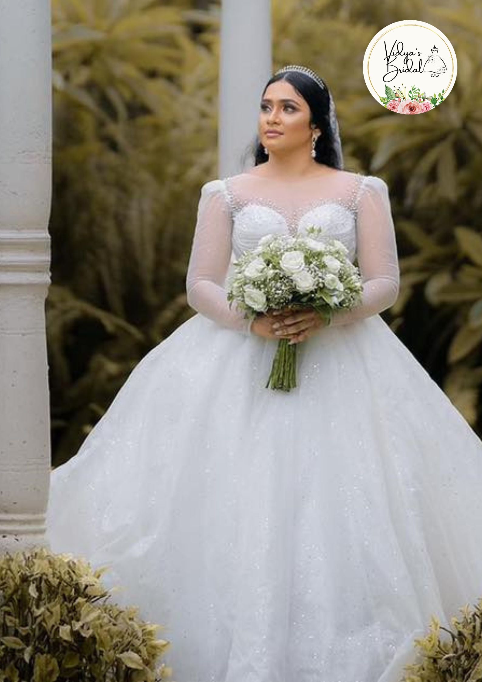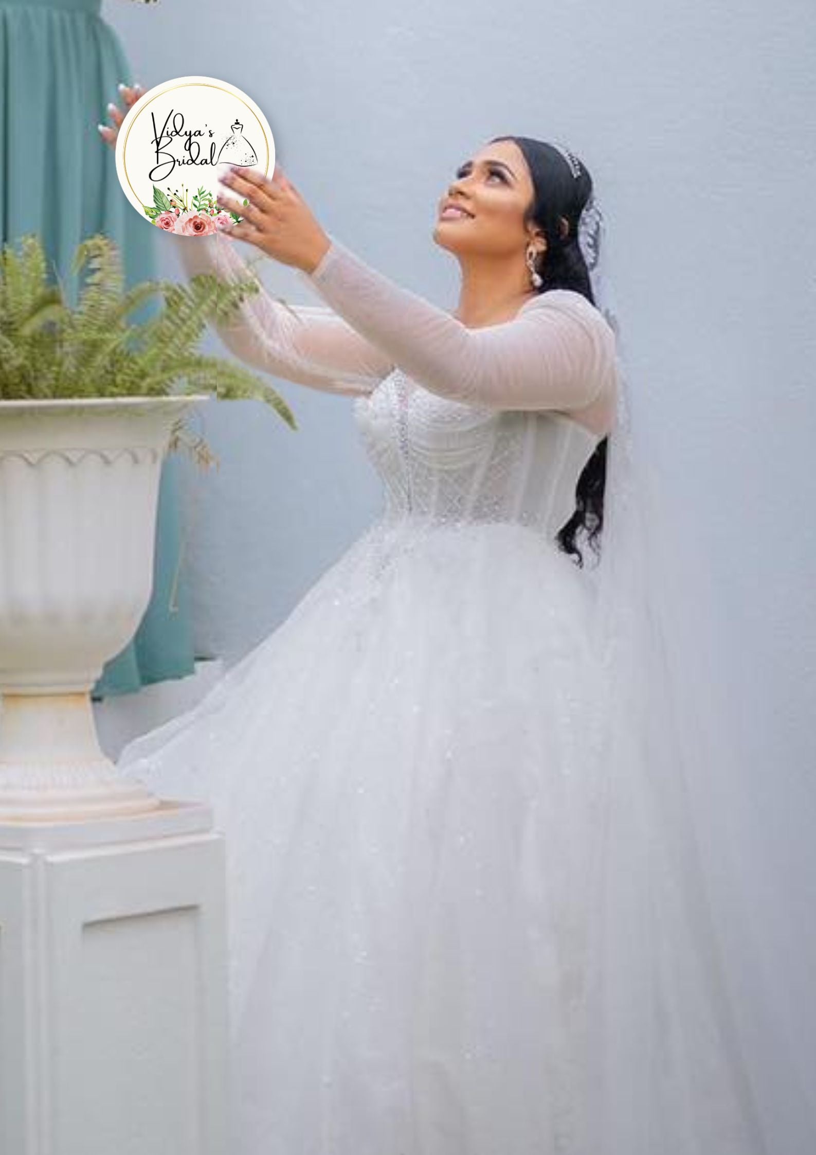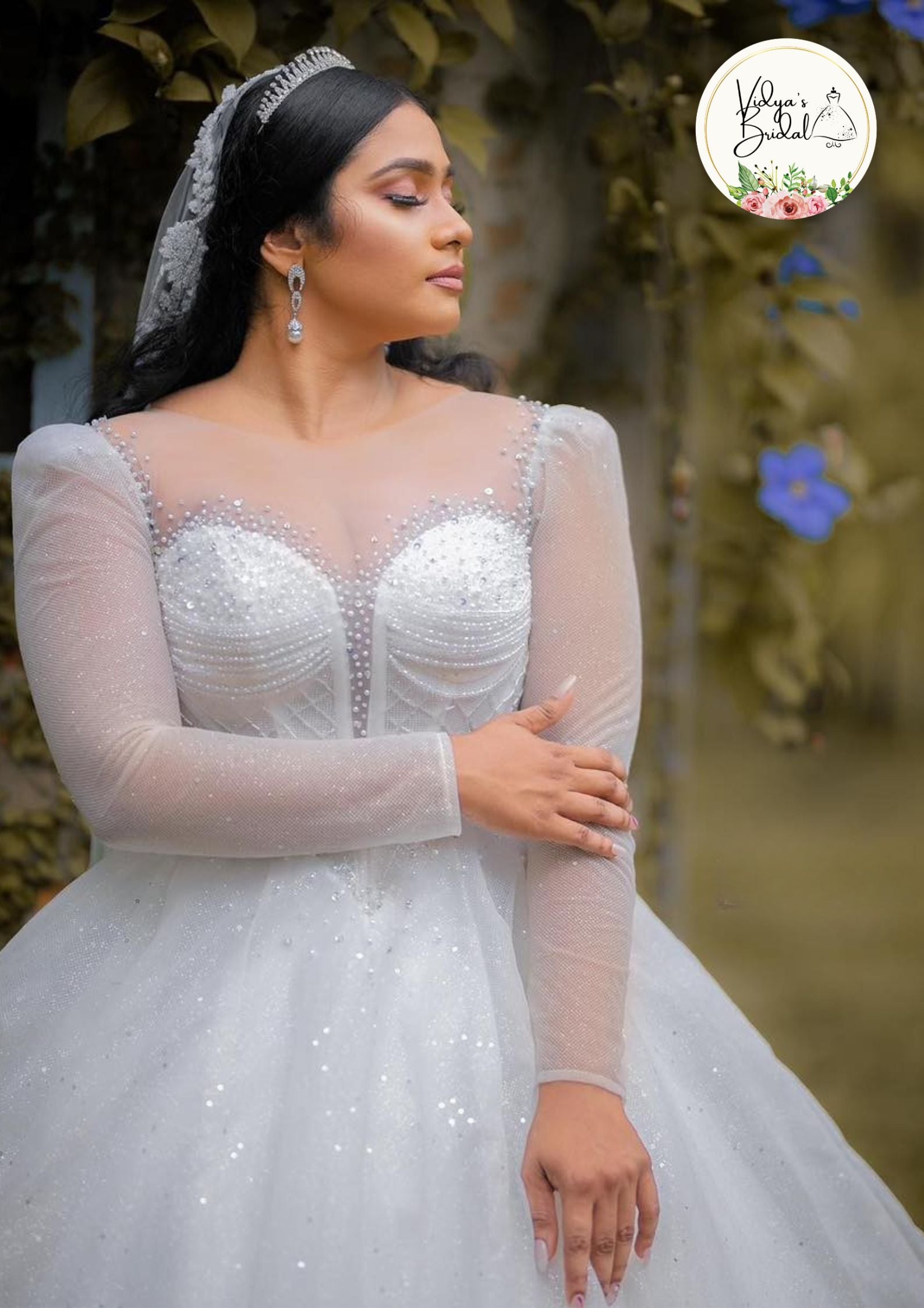 Delicate sheer mesh sleeves and a soft illusion neckline create a romantic, ethereal touch, while shimmering pearls cascade across the bodice like stardust, adding a sophisticated sparkle without overwhelming your natural beauty. The fitted corset-inspired design sculpts your waistline gracefully, flowing seamlessly into a voluminous skirt of soft tulle adorned with subtle sequins that catch the light with every movement.