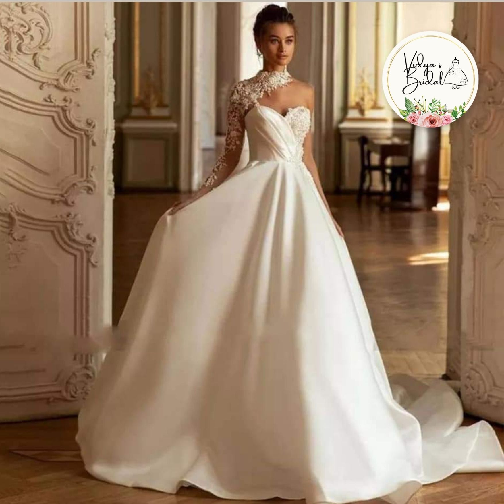 This elegant bridal gown, Santorini, showcases a luxurious satin silhouette that drapes gracefully for a timeless look. Its unique design includes an asymmetrical tulle sleeve adorned with delicate appliqués paired with a chic choker collar, adding a modern touch. The contrasting bodice features one side richly decorated with appliqués, while the other side boasts sophisticated ruched satin, creating visual interest and refined texture. Perfect for brides seeking a blend of classic elegance and contemporary style, this gown promises to make a memorable statement on your special day.