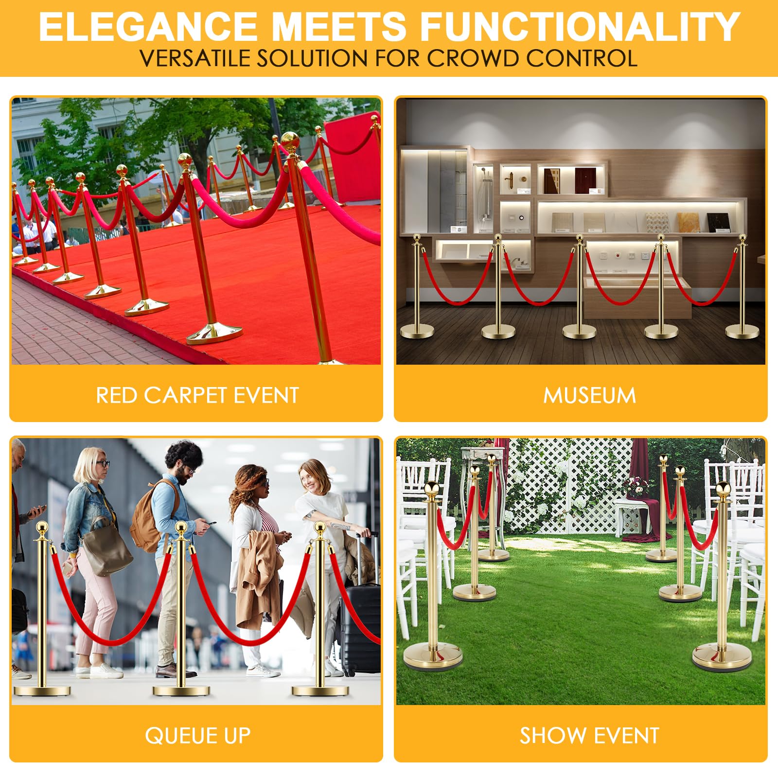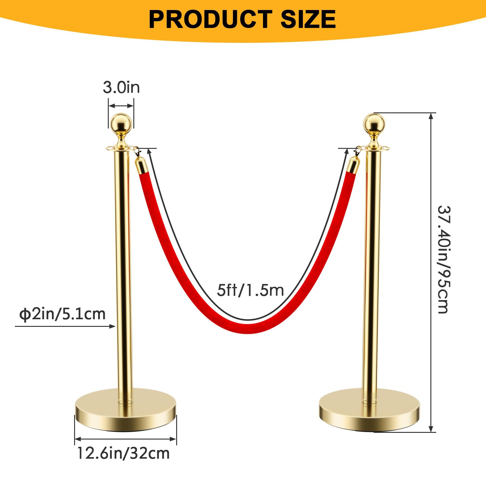 Constructed from 201 stainless steel and zinc alloy, these gold stanchion posts offer exceptional durability, resisting high temperatures, water, and rust for both indoor and outdoor use. Each set includes two 5 ft (1.5 m) red velvet ropes made from thick flannel, providing a visually striking and resilient barrier. The 12.6-inch sturdy bases ensure stability against wind, with rubber bottoms that protect floors and minimize noise during movement. Installation is straightforward, featuring four adapters per post and hooks on each rope end, allowing quick and tool-free assembly.