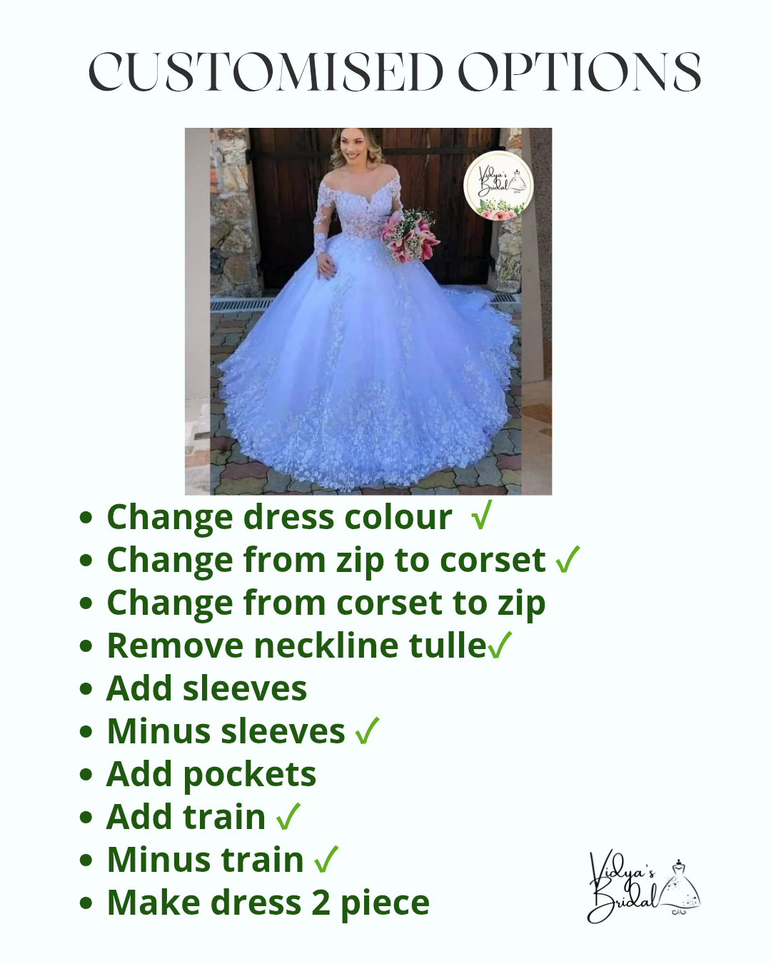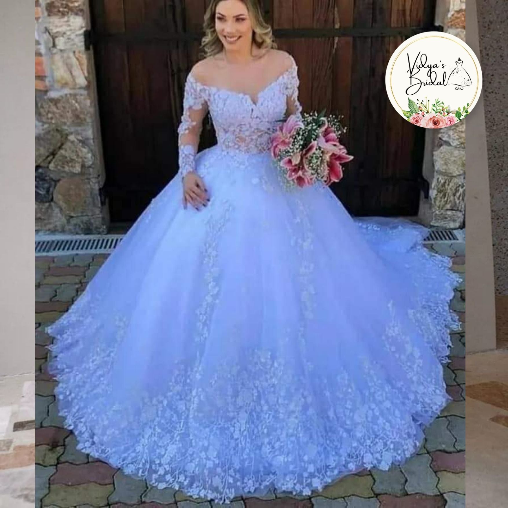 This exquisite ballgown, a customer favorite, features an off-the-shoulder sweetheart neckline and a sheer bodice. The skirt and train are adorned with delicate floral appliqués. A petticoat is included.